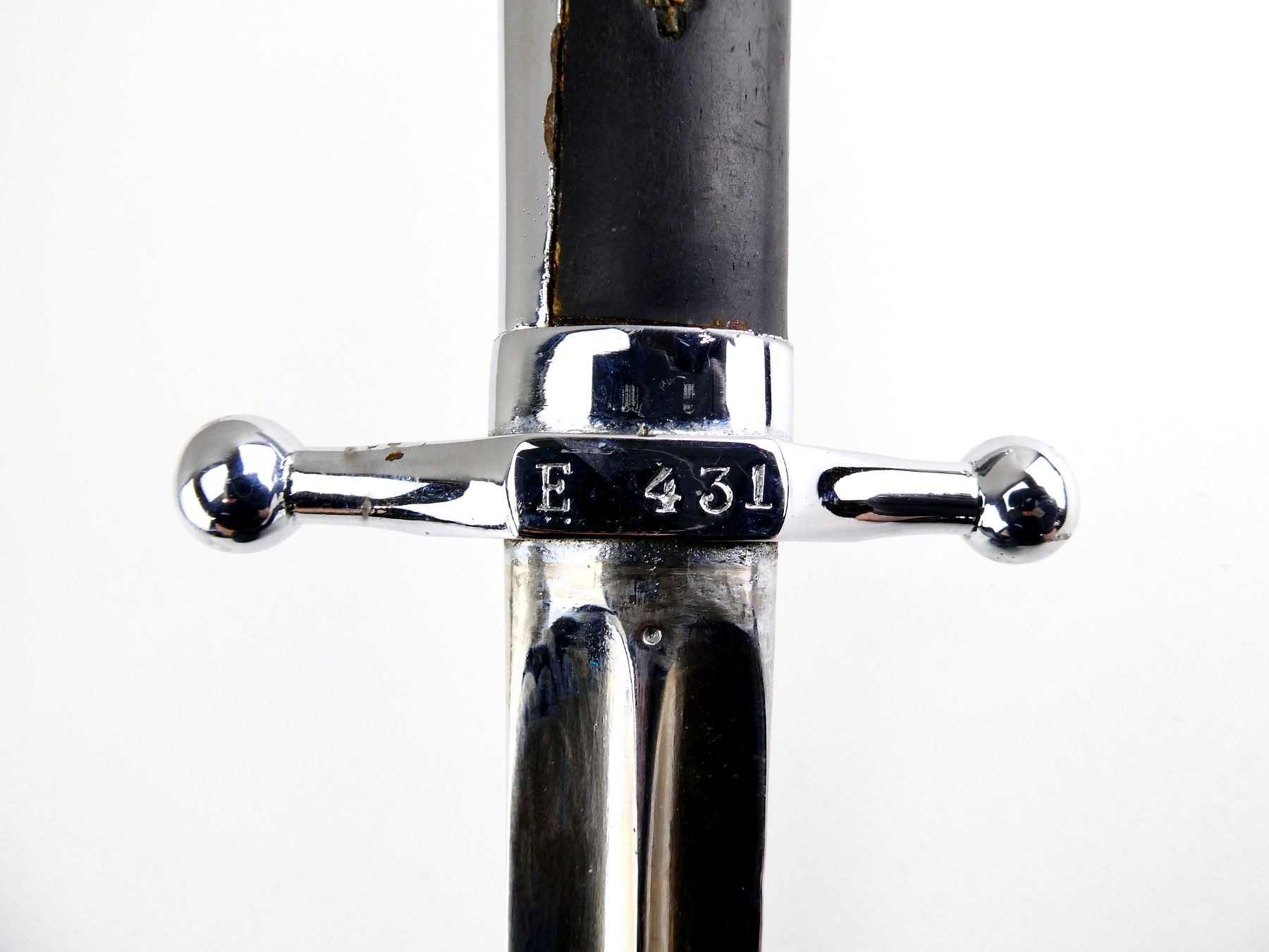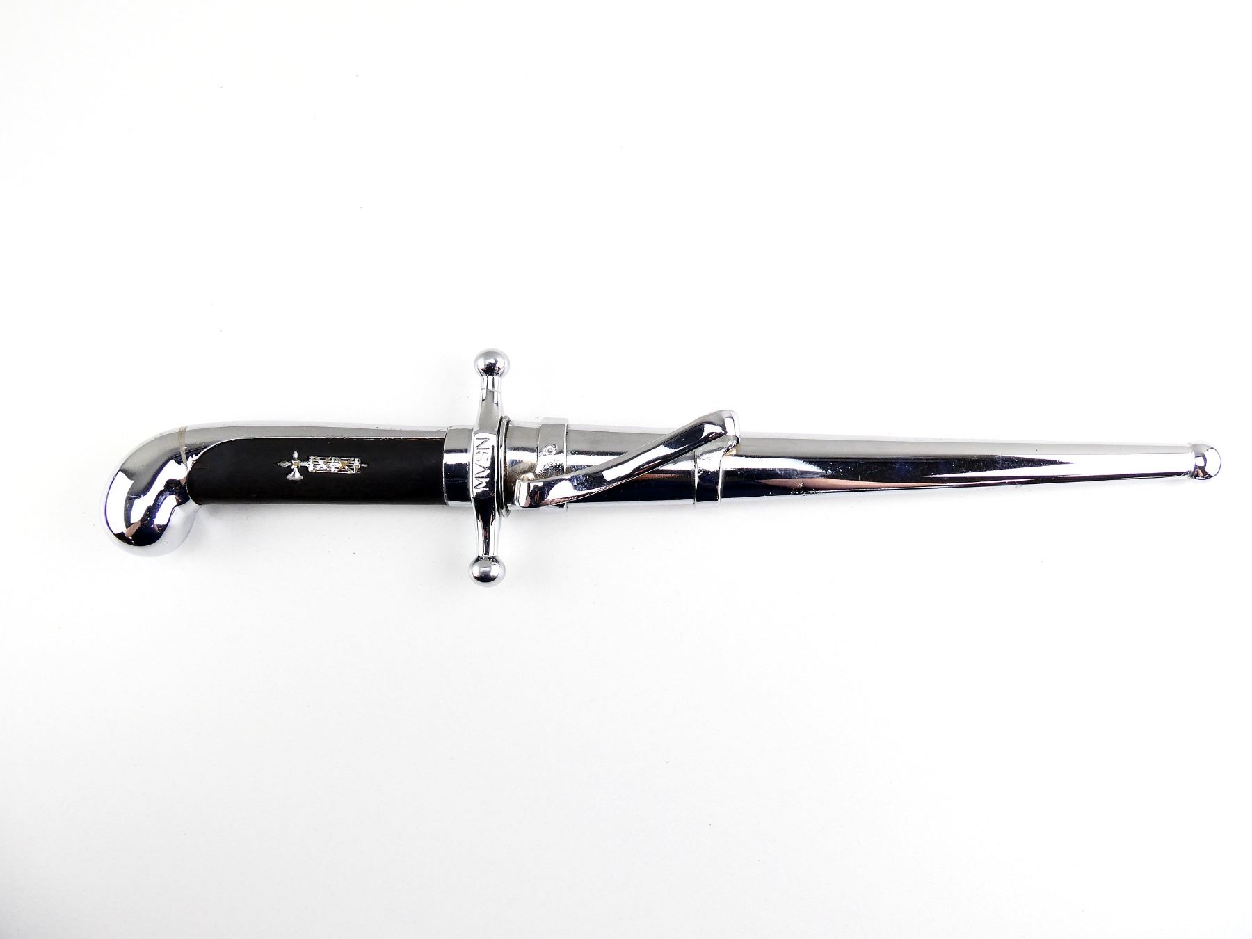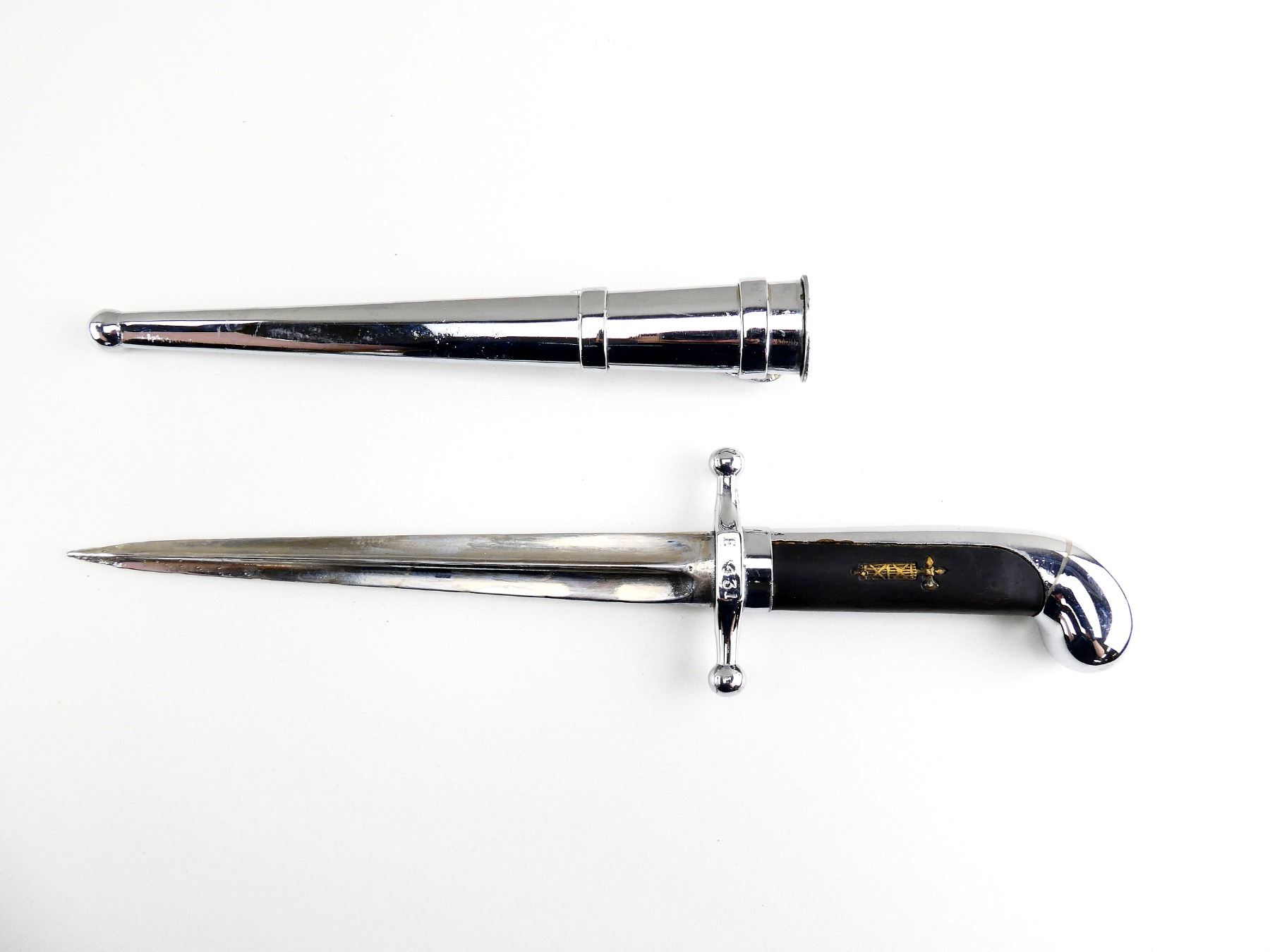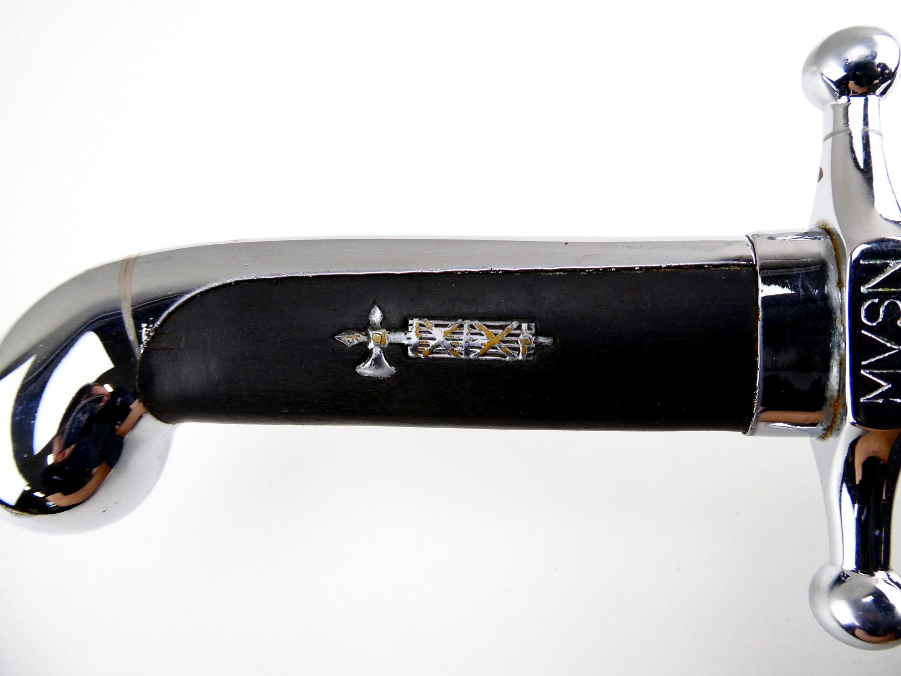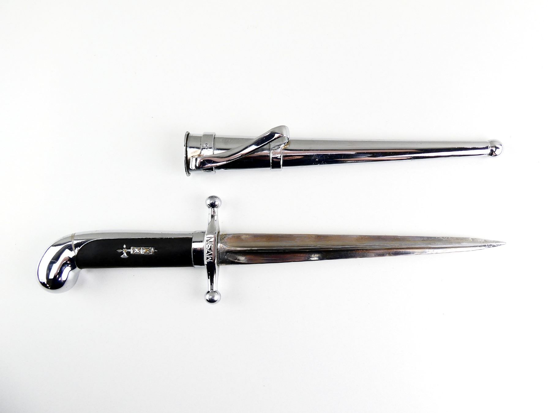 (1) CHROMED ITALIAN FASCIST DAGGER, CROSS-GUARD MARKED: "MVSN", OTHER-SIDE MARKED: "E 431", EBONY GRIP WITH EMBLEMS, CHROMED STEEL SCABBARD WITH LARGE BELT LOOP, NO VISIBLE MARKINGS, BLADE APPROX. 7.75" & OAL APPROX. 12 5/8". SEE PHOTOS.