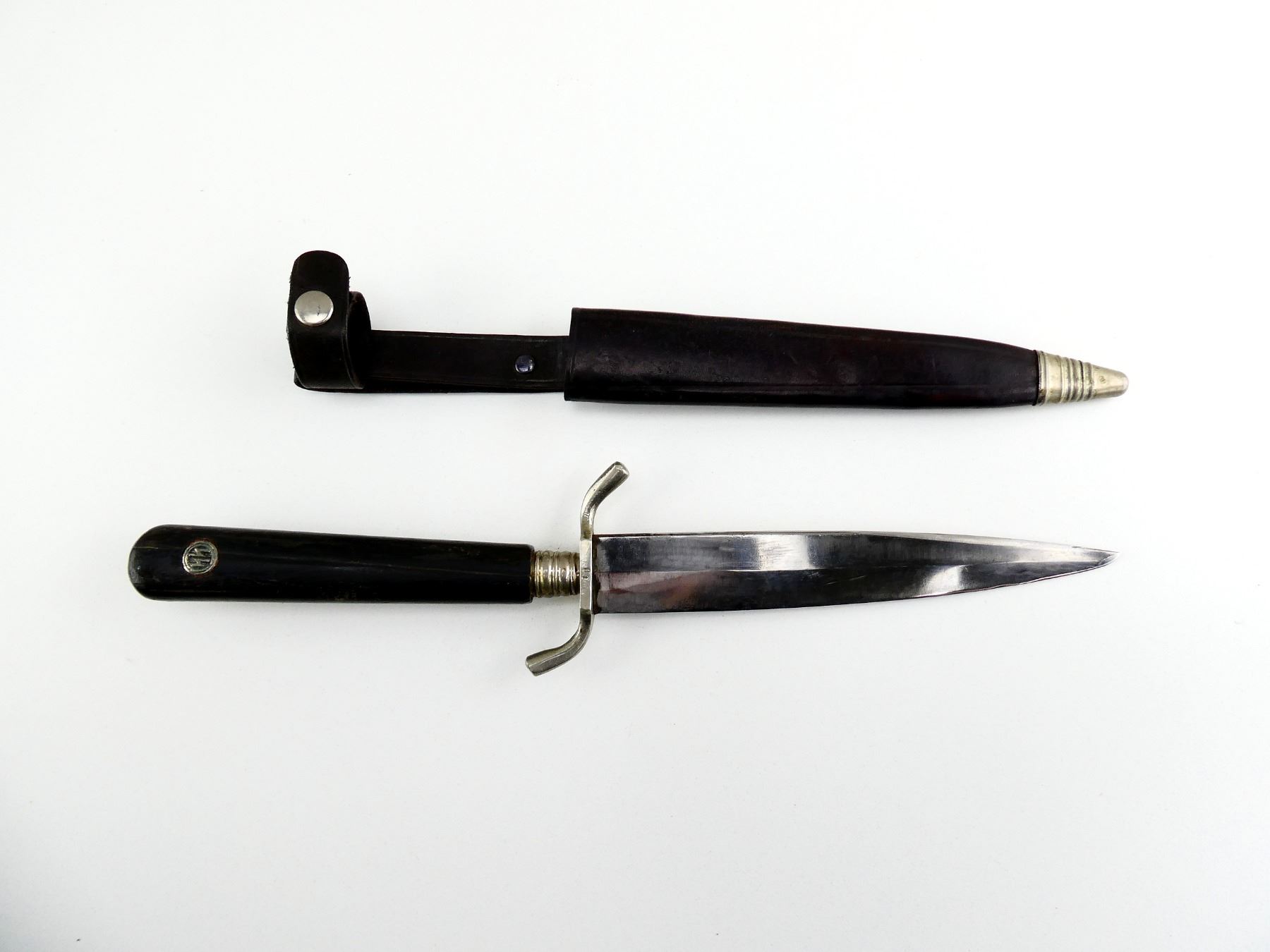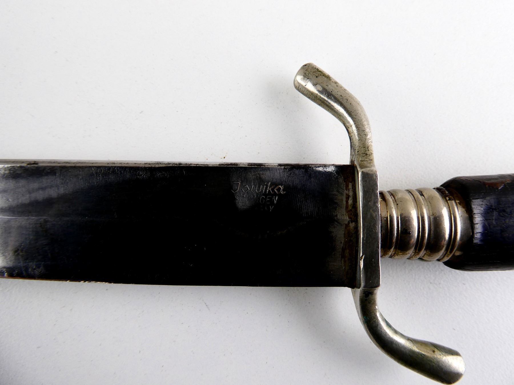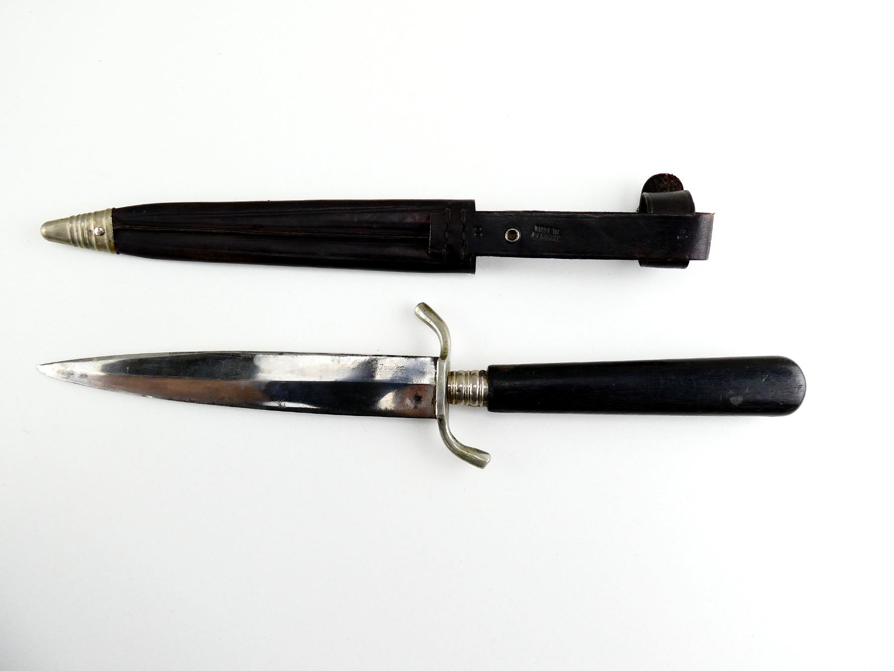 (1) SINGLE-EDGED BLADE, RICASSO MARKED: "JOWIKA, SOLINGEN, ????ANY", CROSS-PIECE MARKED: "10", CROSS-PIECE IS LOOSE / MOVES, 1-PIECE WOODEN GRIP WITH LATER ADDED "SS" METAL EMBLEM, BROWN LEATHER SCABBARD WITH METAL TIP, BROWN LEATHER FROG MARKED: "MADE IN GERMANY" & "10", BLADE APPROX. 6" & OAL APPROX. 11 1/8". SEE PHOTOS.
