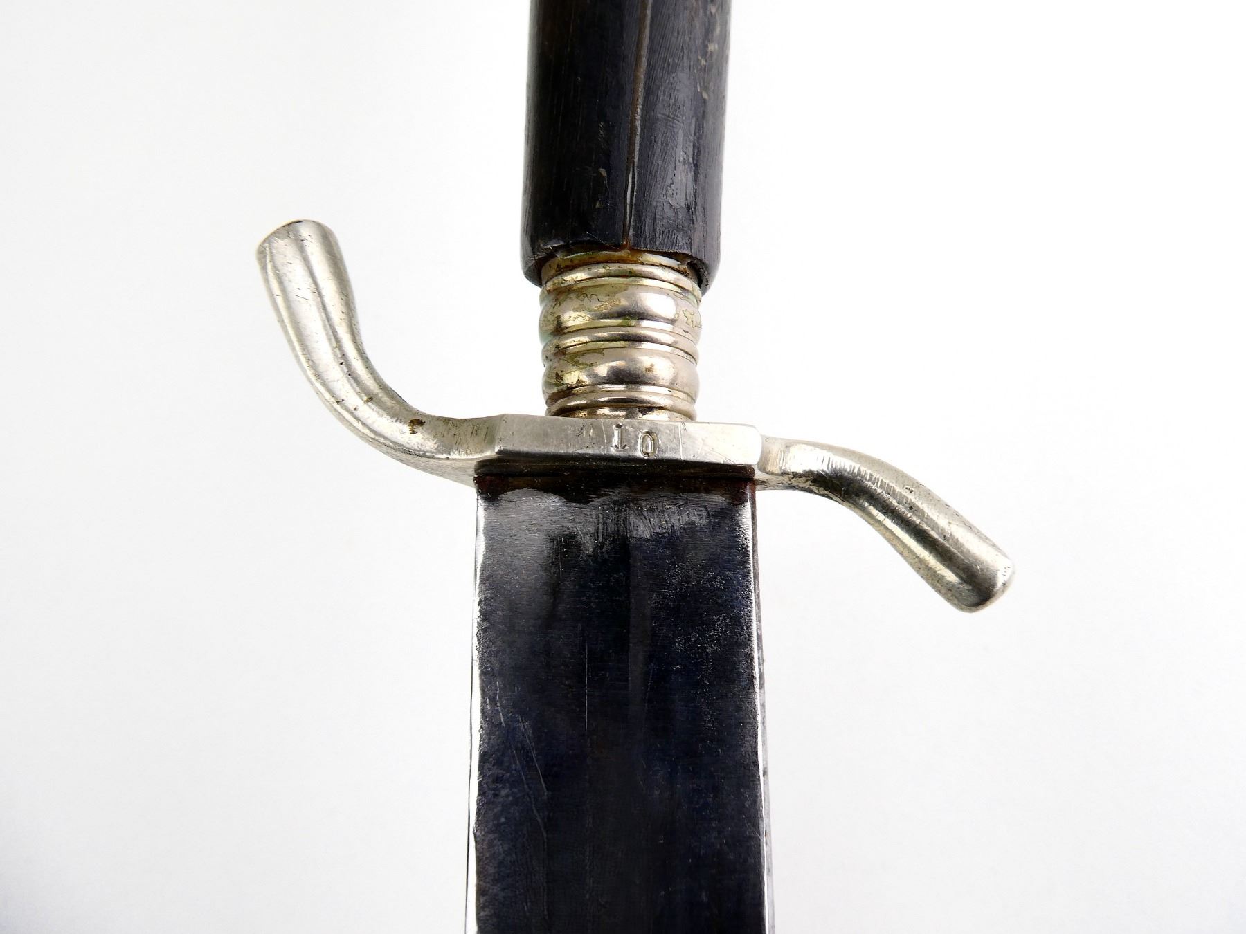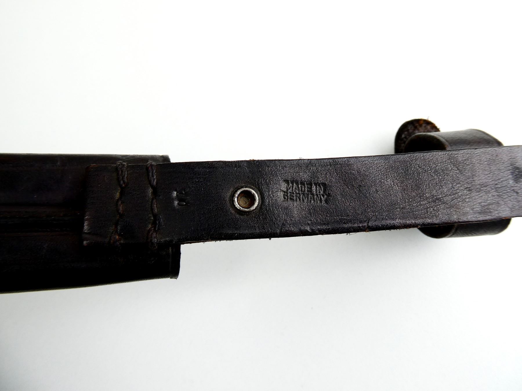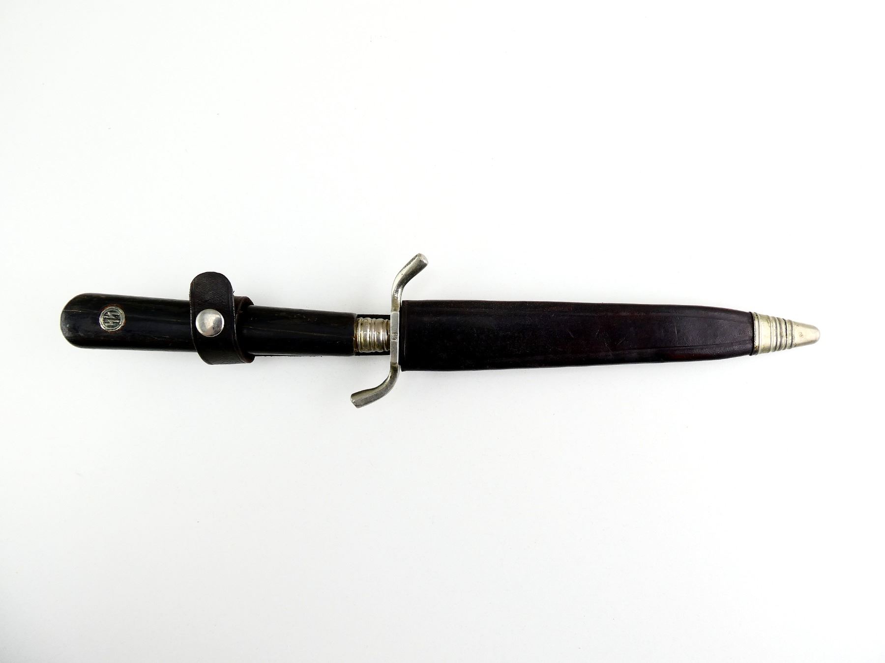 (1) SINGLE-EDGED BLADE, RICASSO MARKED: "JOWIKA, SOLINGEN, ????ANY", CROSS-PIECE MARKED: "10", CROSS-PIECE IS LOOSE / MOVES, 1-PIECE WOODEN GRIP WITH LATER ADDED "SS" METAL EMBLEM, BROWN LEATHER SCABBARD WITH METAL TIP, BROWN LEATHER FROG MARKED: "MADE IN GERMANY" & "10", BLADE APPROX. 6" & OAL APPROX. 11 1/8". SEE PHOTOS.