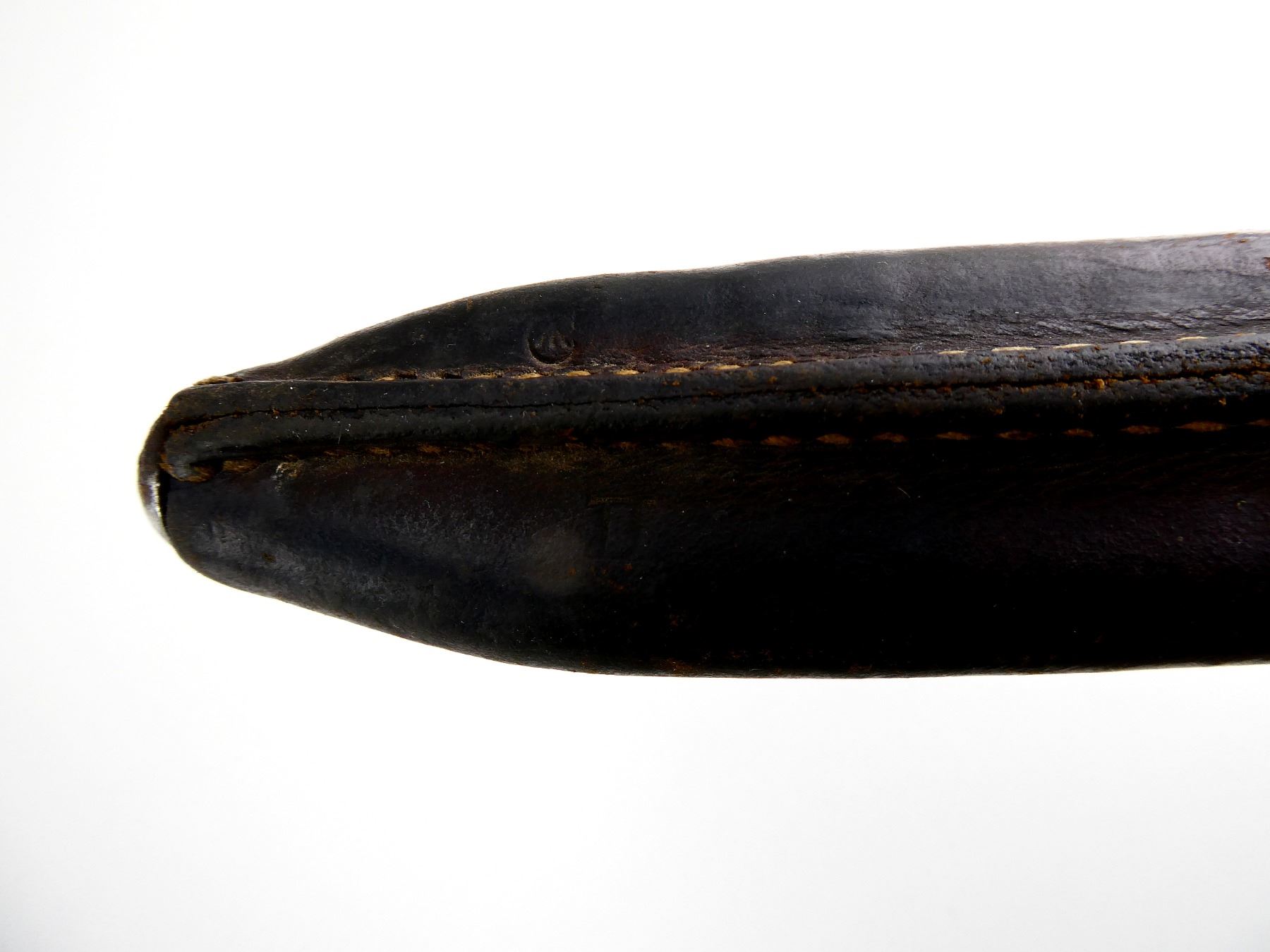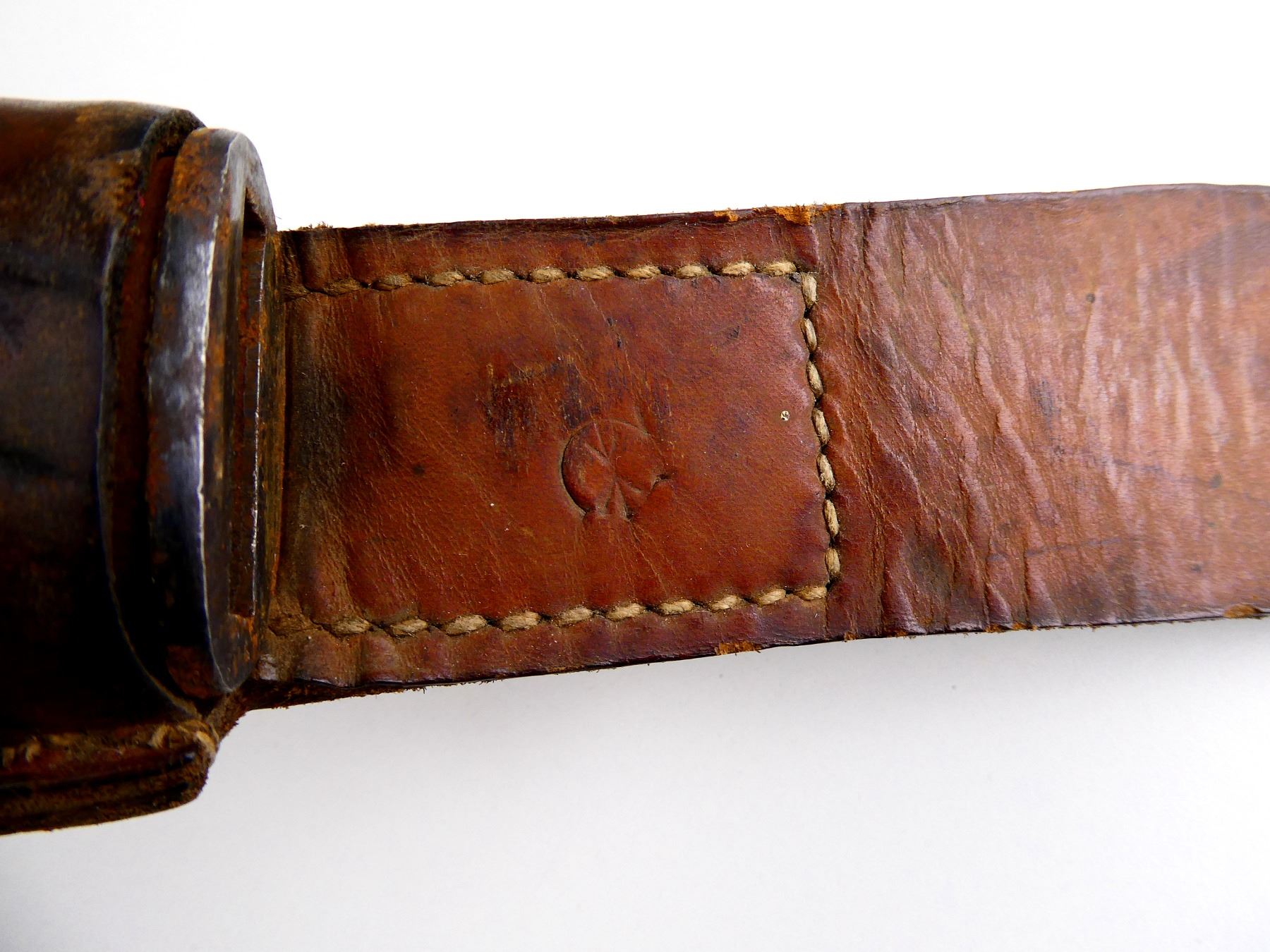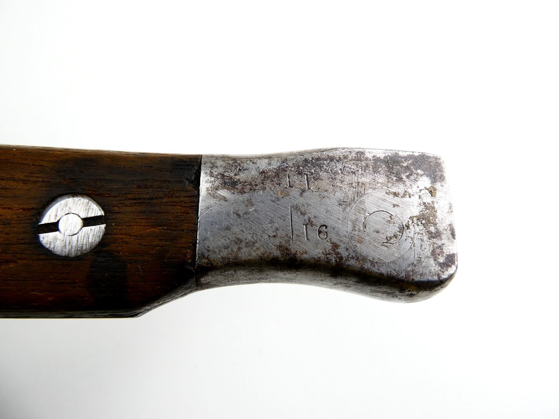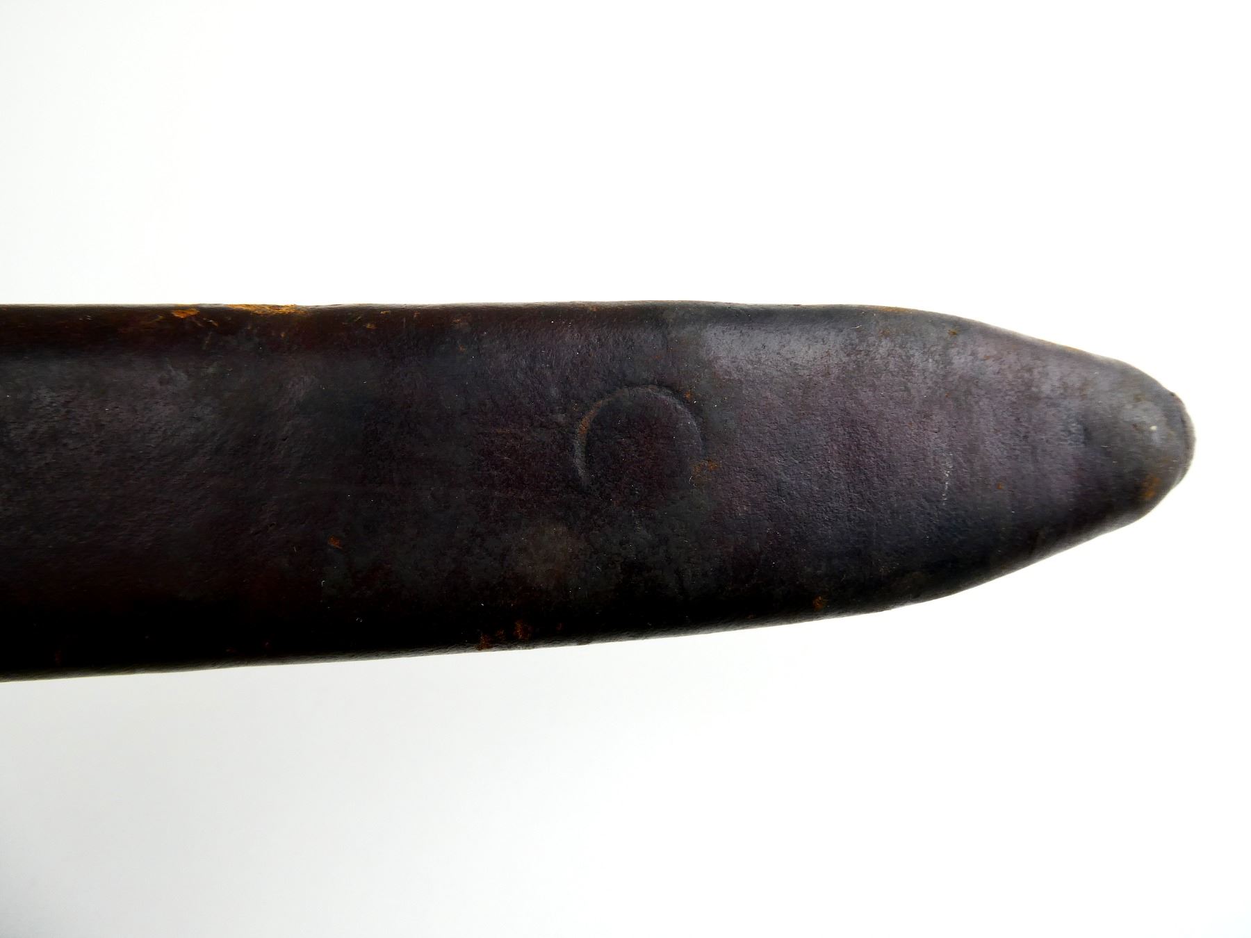 (1) CONVERTED FROM A BAYONET, BLADE / CROSSGUARD & CATCH MODIFIED, NO VISIBLE MARKINGS ON BLADE / RICASSO, 2-PIECE WOOD GRIP, NO VISIBLE MARKINGS, METAL POMMEL FAINTLY MARKED: "ROSS" REST HAS BEEN GROUND AWAY, OTHER-SIDE MARKED: "11" OVER "16", LEATHER & METAL SCABBARD, LEATHER MARKED: "MK II" WITH C-BROAD ARROW, LEATHER FROG WITH C-BROAD ARROW WITH TWO ARROWS FACING EACH OTHER, BLADE APPROX. 7.5" & OAL APPROX. 12". SEE PHOTOS.