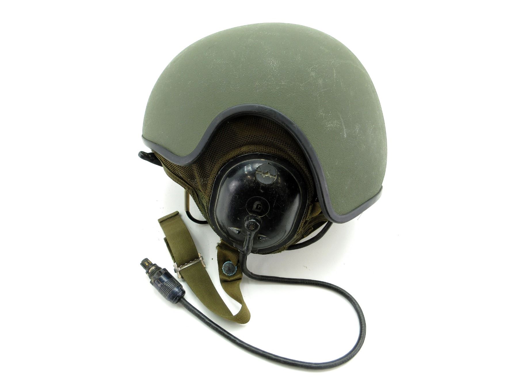 (1) GREEN AFV (ARMOURED FIGHTING VEHICLE) BALLISTICS HELMET WITH HEAD GEAR (EAR / MIC / WIRING), MARKED: "GENTEX CORPORATION" & "LARGE". SEE PHOTOS.