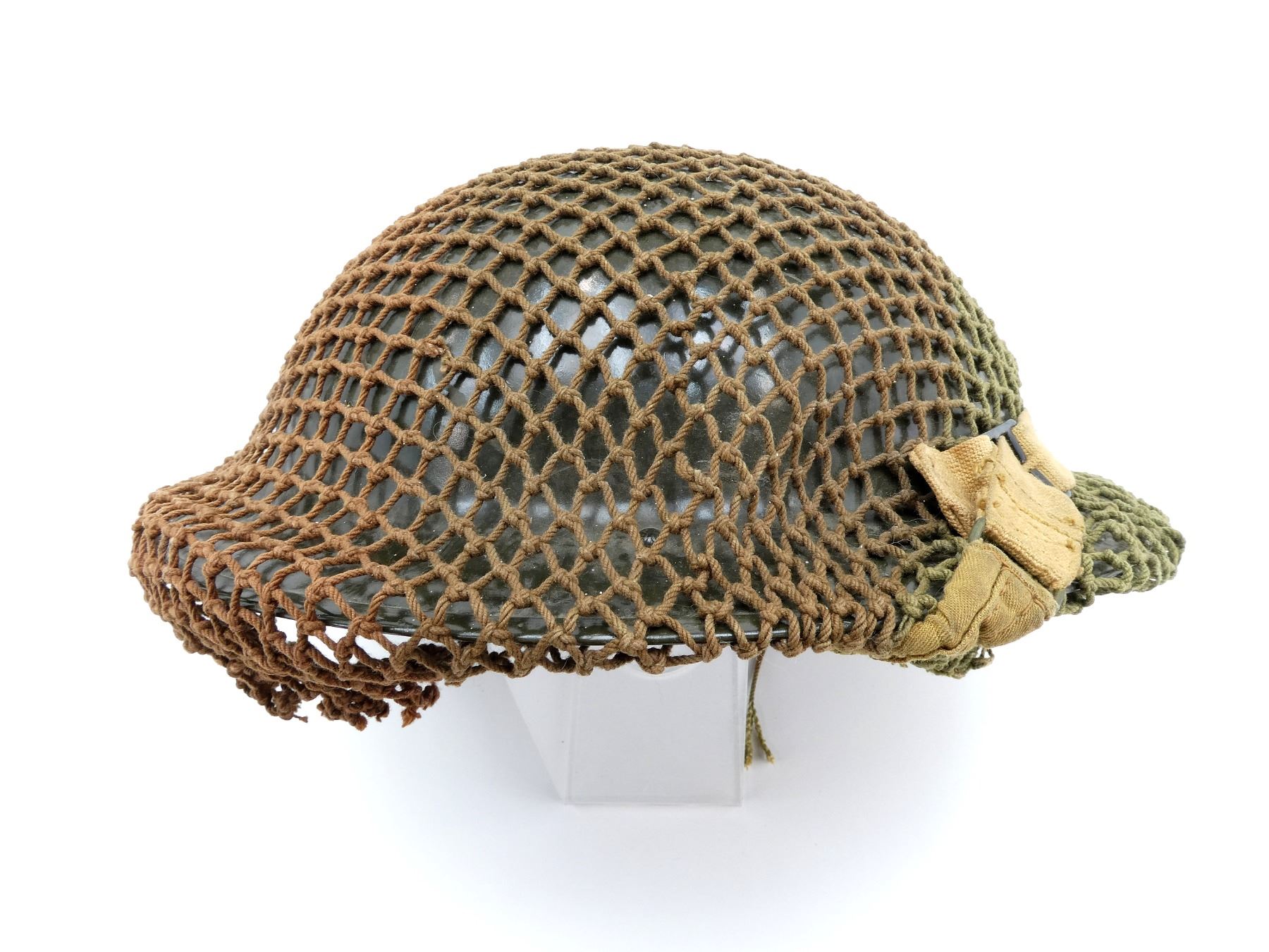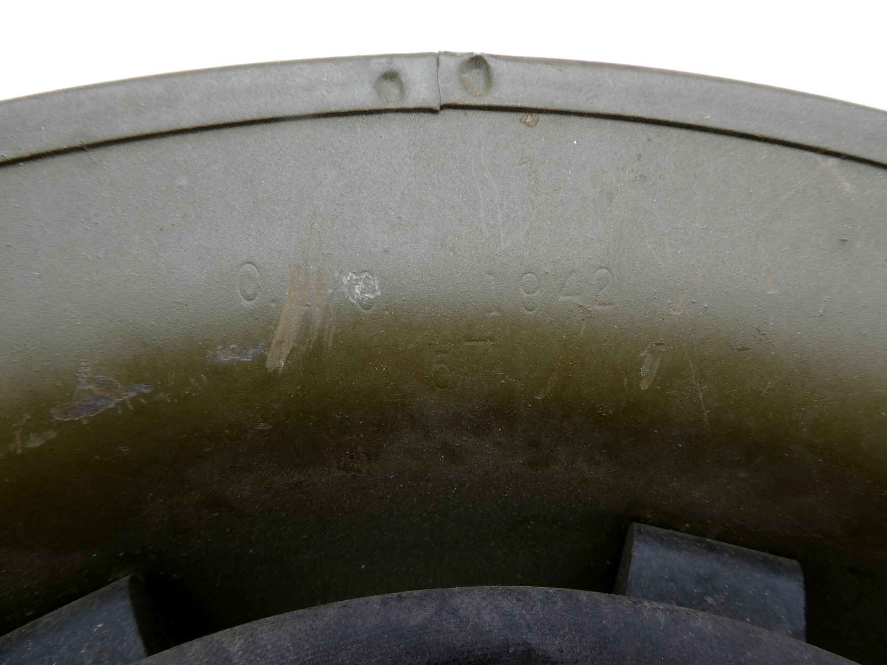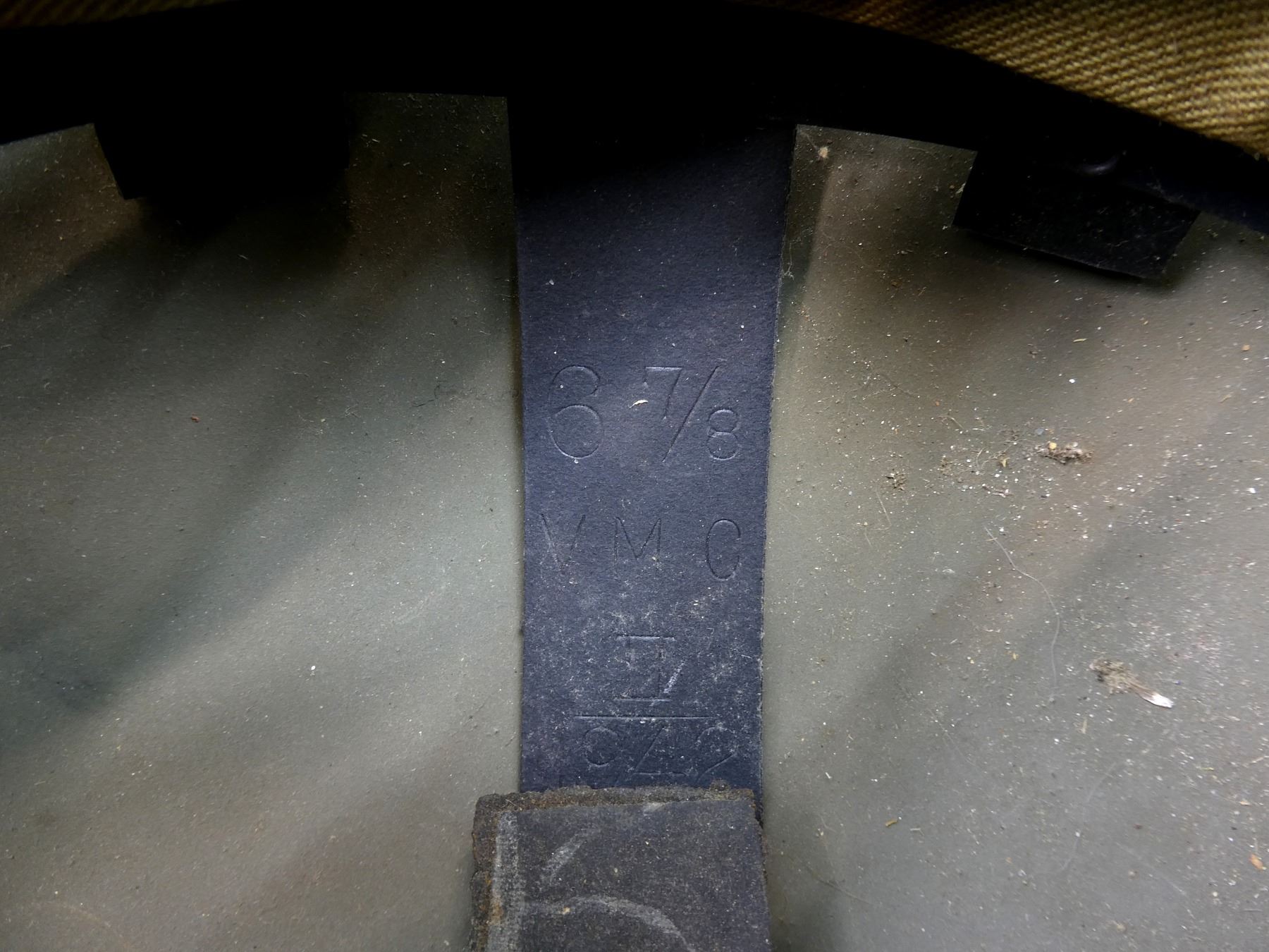 (1) GREEN PAINTED STEEL WITH BLACK LEATHER HEAD LINER (LEATHER IS SOFT), REAR SKIRT MARKED: "C.L./C. (CANADIAN LAMP CO.) 1942", ROLLED EDGE RIM, CANVAS & METAL ELASTICIZED CHIN STRAP, HEAD LINER MARKED: "6 7/8, V.M.C., II, 1942", WITH CAMOUFLAGE HELMET NETTING. SEE PHOTOS.