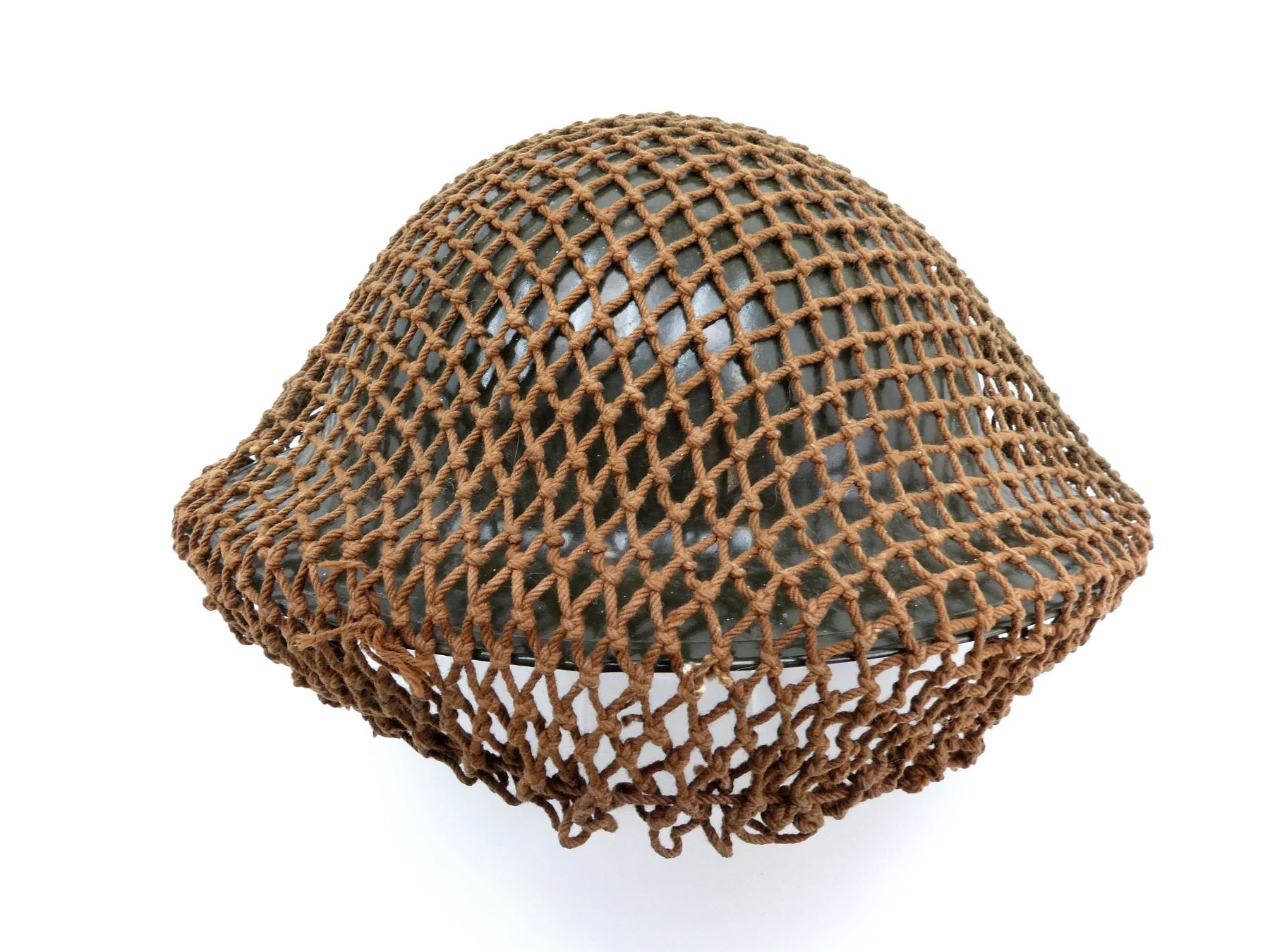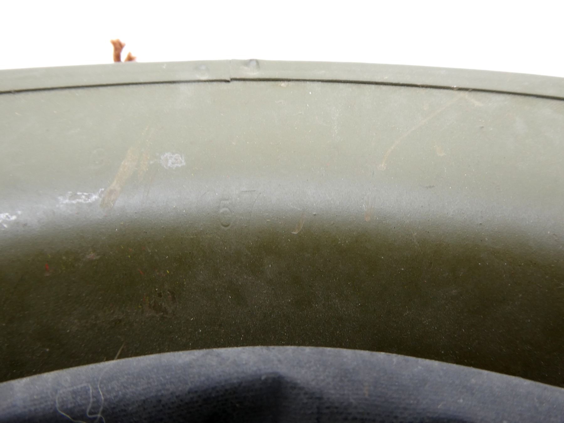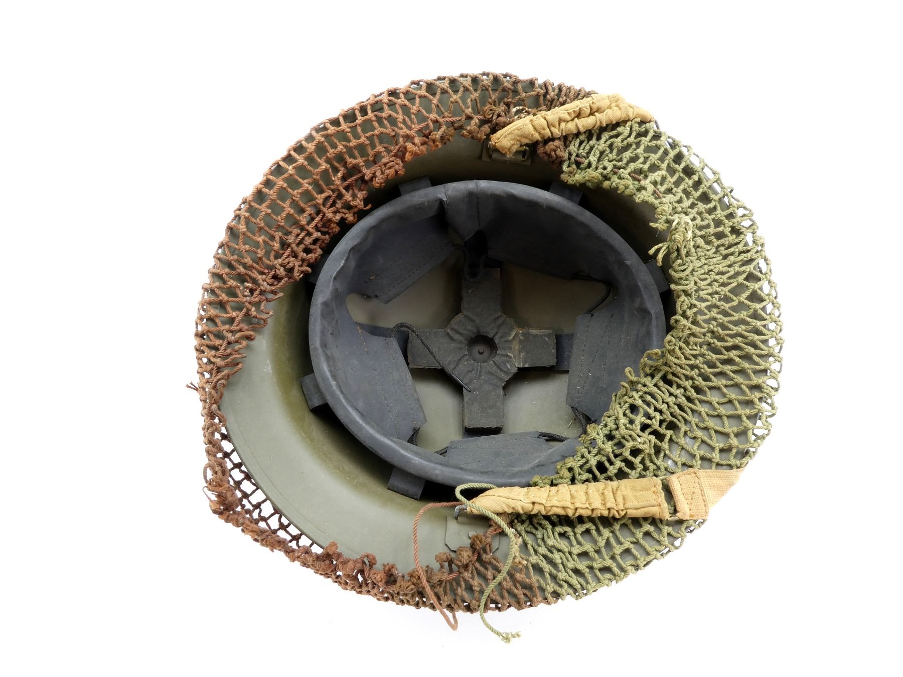 (1) GREEN PAINTED STEEL WITH BLACK LEATHER HEAD LINER (LEATHER IS SOFT), REAR SKIRT MARKED: "C.L./C. (CANADIAN LAMP CO.) 1942", ROLLED EDGE RIM, CANVAS & METAL ELASTICIZED CHIN STRAP, HEAD LINER MARKED: "6 7/8, V.M.C., II, 1942", WITH CAMOUFLAGE HELMET NETTING. SEE PHOTOS.