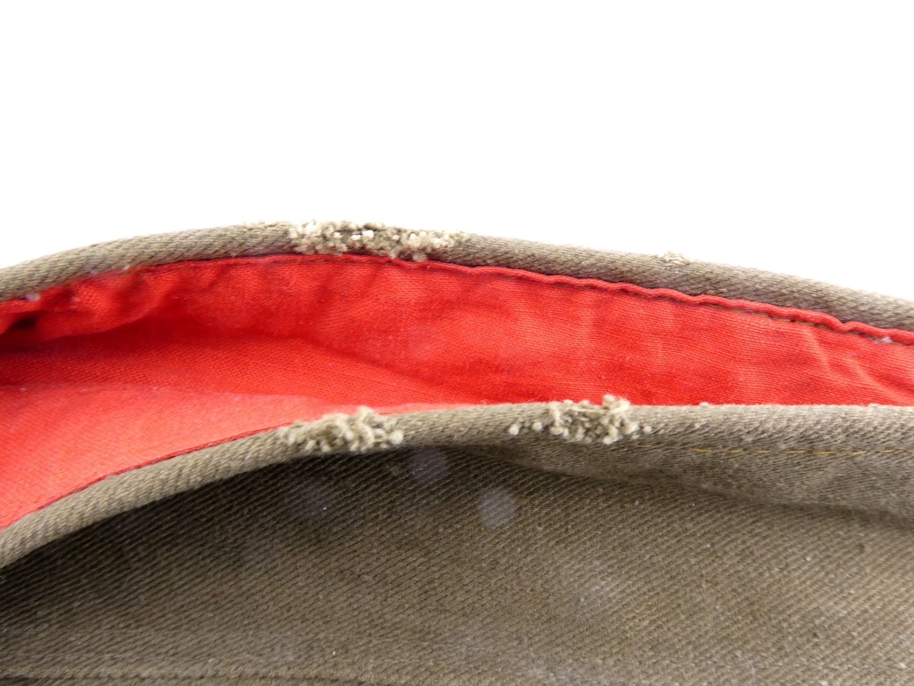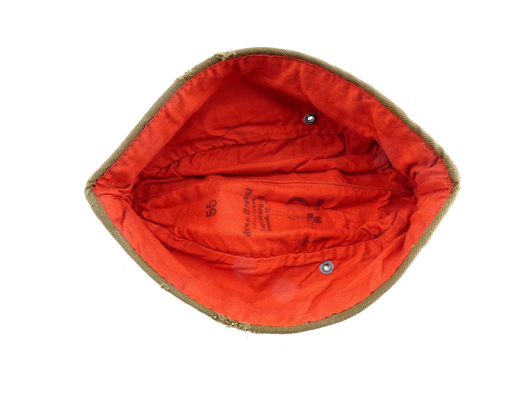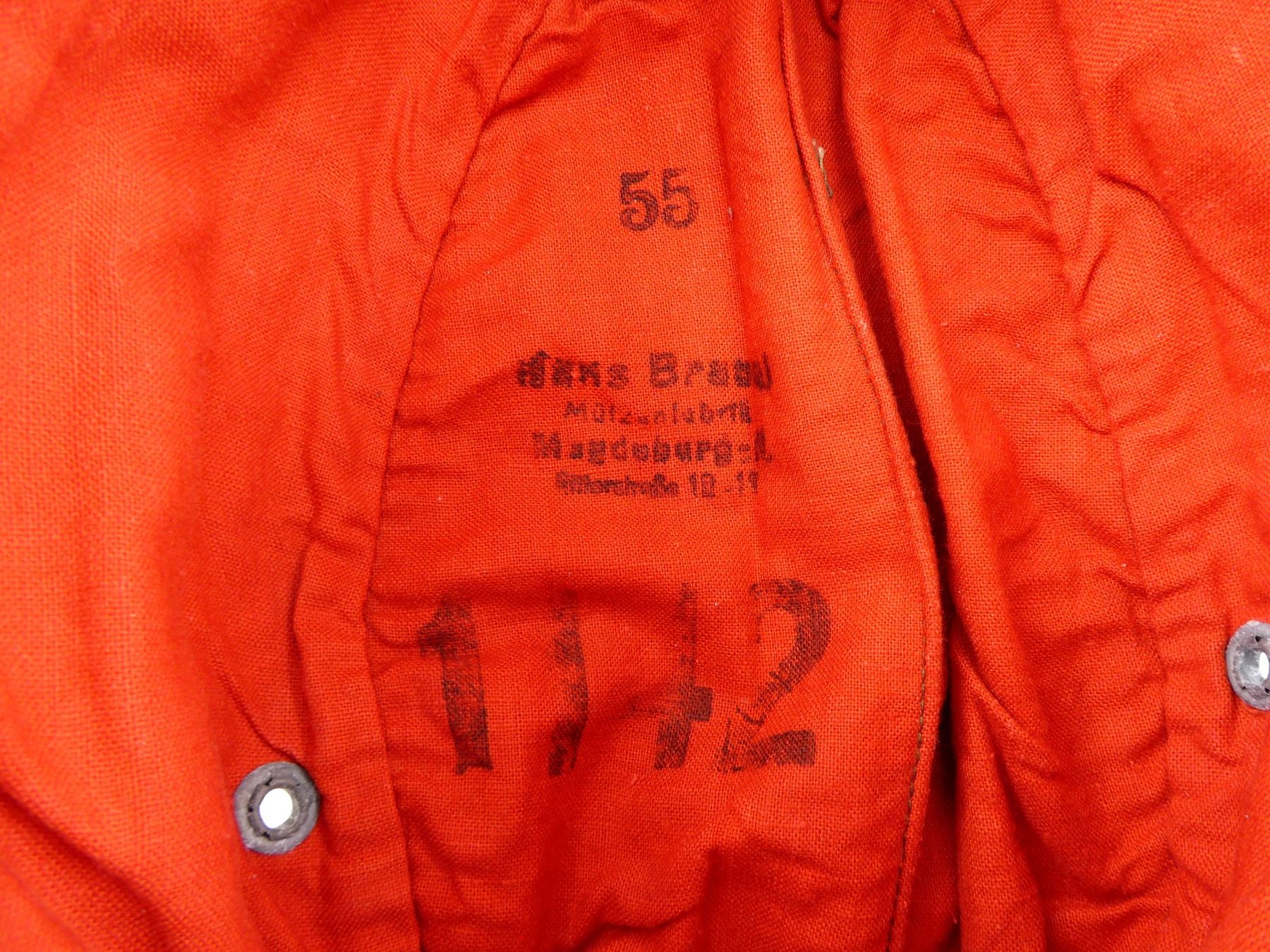 (1) GREENISH TAN CANVAS WEDGE CAP WITH RED LINING, TROPICAL PATTERN CAP EAGLE, COCKADE, YELLOW SIGNALS PIPING, INSIDE MARKED: "55, HANS BRA???, MUTZ?N????, MAGDEBURG?N, ?MARCHA?E ??-??, 1142", DOES NOT APPEAR TO GLOW UNDER BLACK LIGHT.