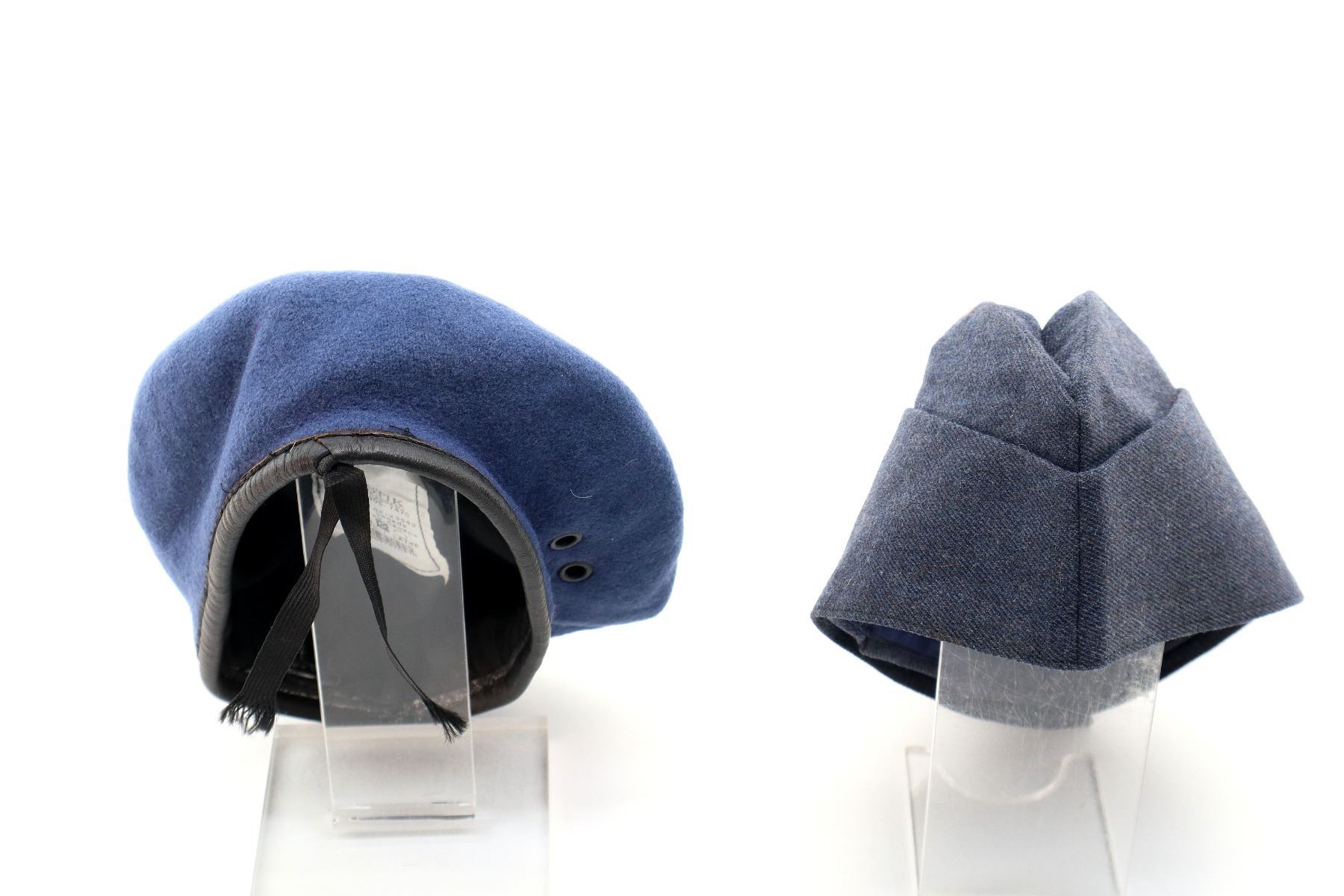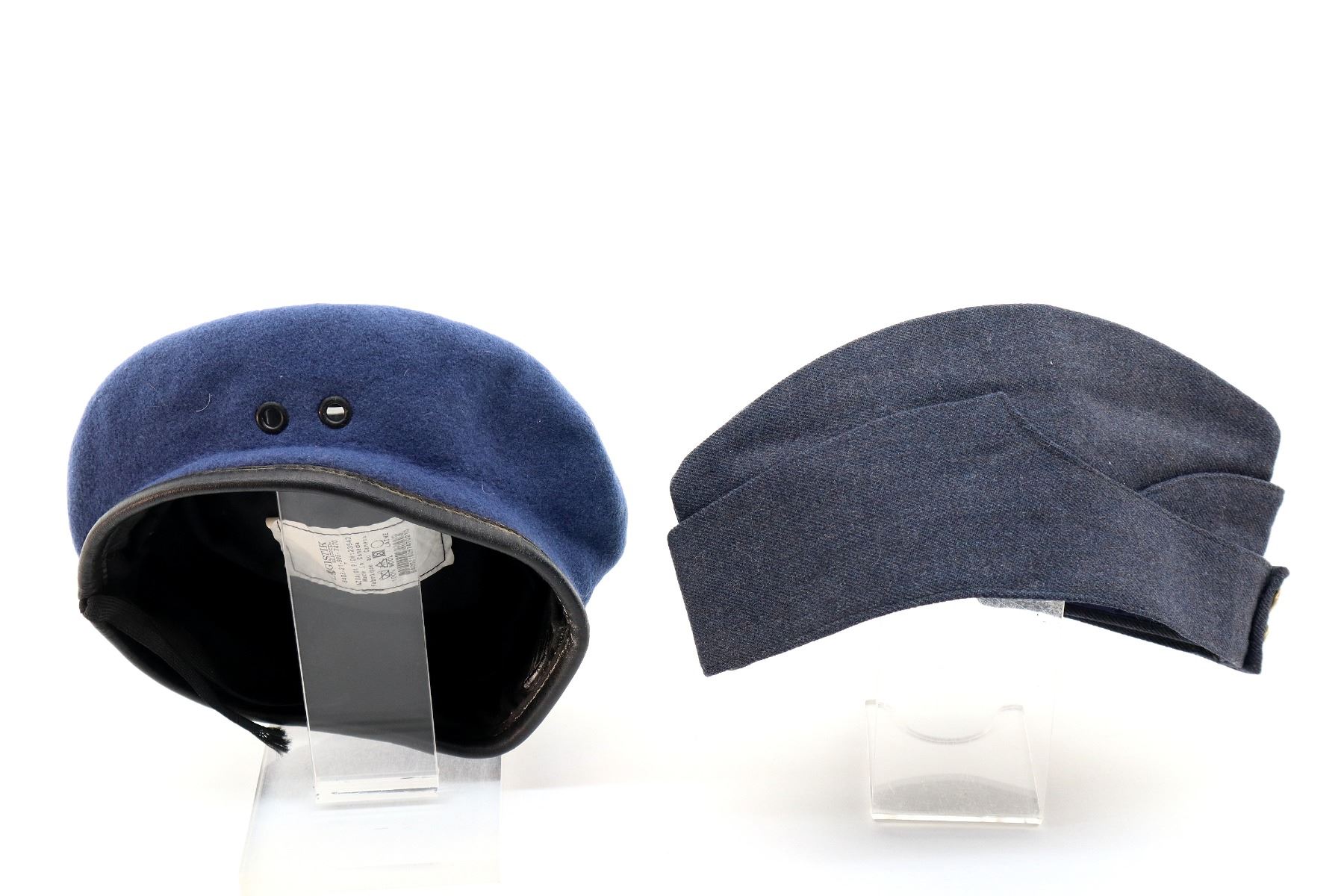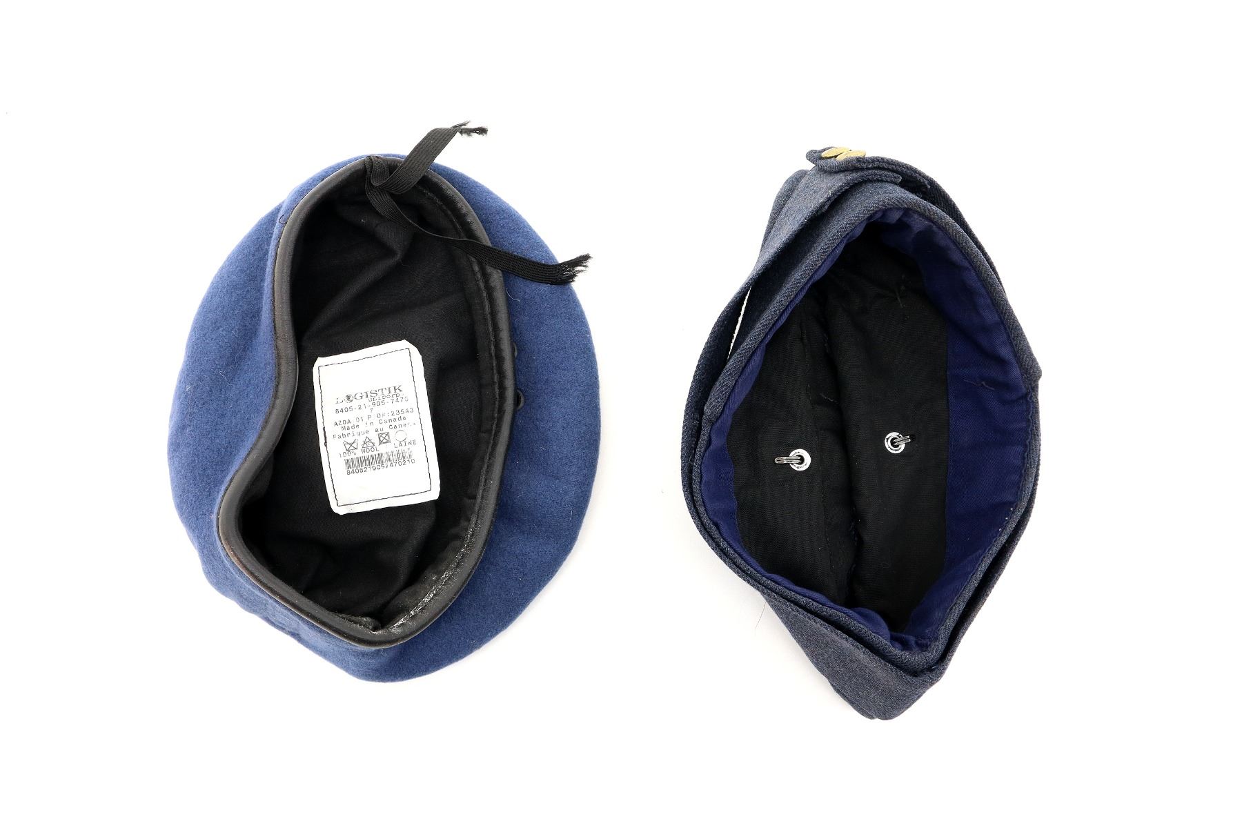 LOT INCLUDES; (1) CANADIAN MILITARY BLUE WOOL BERET, MARKED: "LOGISTIK UNICORP, 8405-21-905-7470" ETC., SHOWS WEAR & (1) CANADIAN AIR CADETS BLUE DENIM STYLE WEDGE CAP, NO VISIBLE MARKINGS, BRASS BUTTONS MARKED: "AIR CADETS" OVER MAPLE LEAF WITH EAGLE OVER "CANADA". SEE PHOTOS.