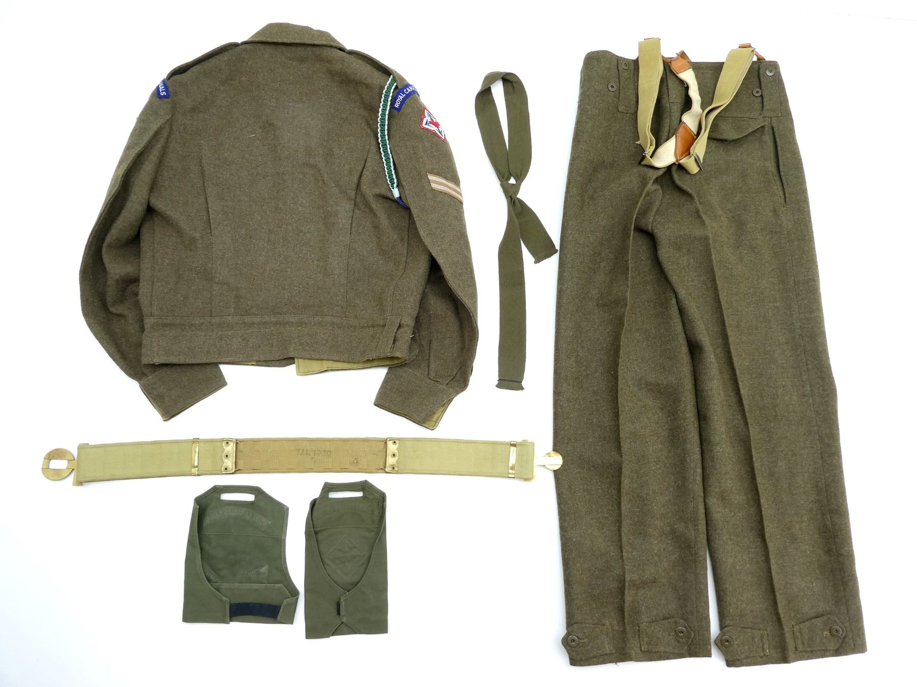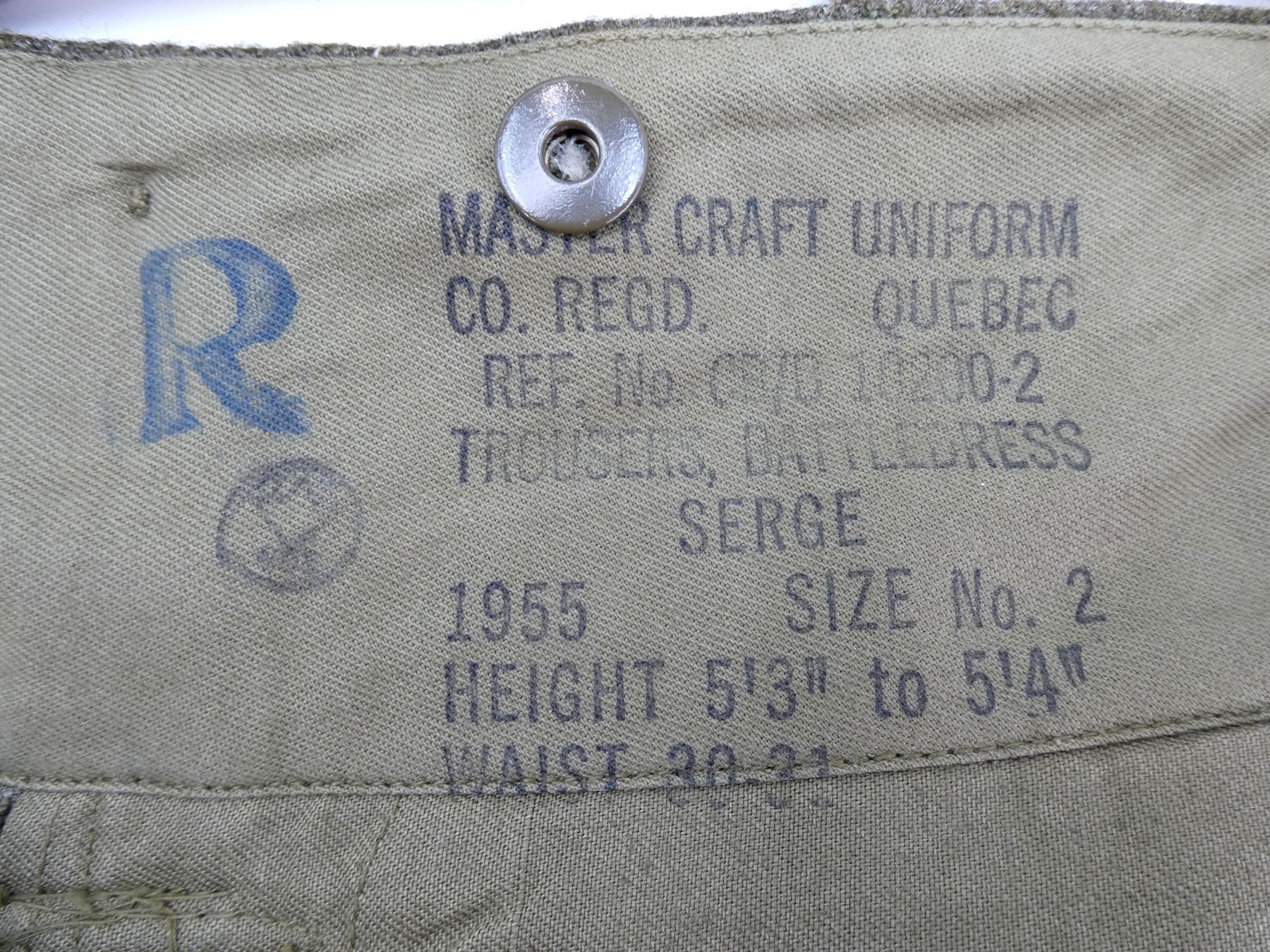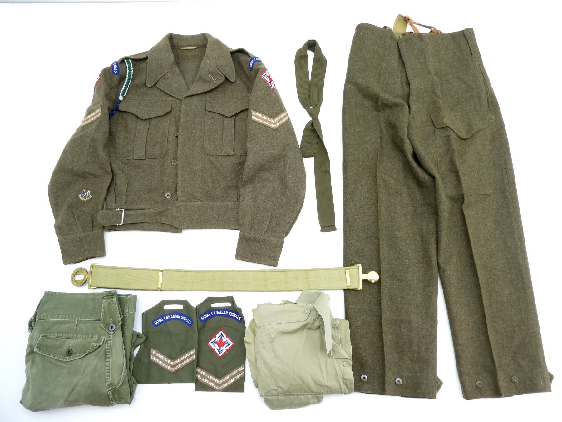 LOT INCLUDES: (1) GREEN JEAN PANTS, SIZE 2, HEIGHT 5'3" TO 5'4", WAIST 30-31, NO VISIBLE MARKINGS, (1) GREEN WOOL PANTS WITH DETACHABLE SUSPENDERS, MARKED: " MASTER CRAFT UNIFORM CO. REGD. QUEBEC. REF NO. CB/B 10200-2 TROUSERS, BATTLEDRESS SERGE, 1955, SIZE NO. 2, HEIGHT 5'3" TO 5'4", WAIST 20-31, SUSPENDERS MARKED: "SF109236", (1) GREEN BELT, BUCKLE MARKED: " ROYAL CANADIAN CORPS OF SIGNALS", (1) GREEN LONGSLEEVE DRESS SHIRT, MARKED: " 8405-21-801-7921, SIZE 14", (1) GREEN WOOL UNIFORM JACKET, MARKED: " BATTLE DRESS BLOUSE-SERGE, HEIGHT - 5'5"-5'6". BREAST -36-37, MASTER CRAFT UNIFORM, LANYARD, CPL RANK PATCH, ROYAL CANADIAN SIGNALS PATCH. SEE PHOTOS.