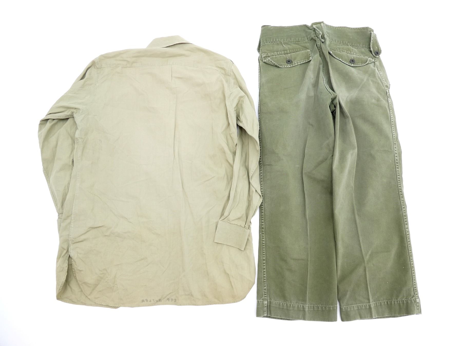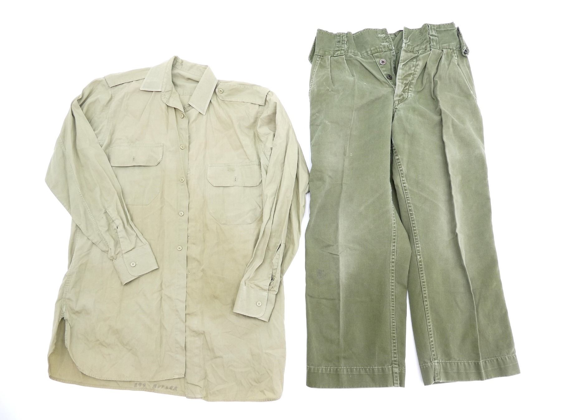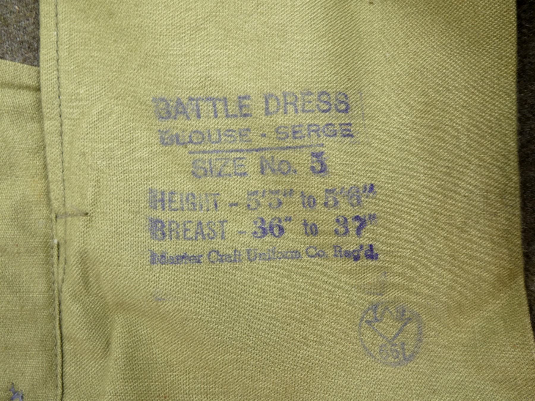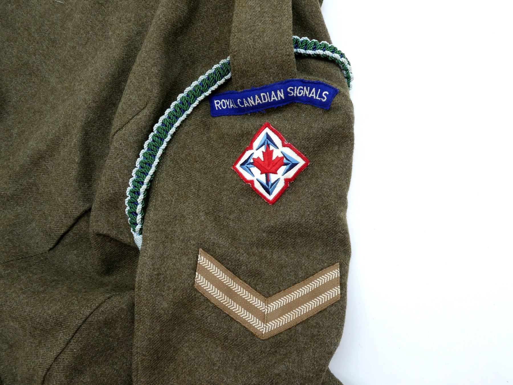 LOT INCLUDES: (1) GREEN JEAN PANTS, SIZE 2, HEIGHT 5'3" TO 5'4", WAIST 30-31, NO VISIBLE MARKINGS, (1) GREEN WOOL PANTS WITH DETACHABLE SUSPENDERS, MARKED: " MASTER CRAFT UNIFORM CO. REGD. QUEBEC. REF NO. CB/B 10200-2 TROUSERS, BATTLEDRESS SERGE, 1955, SIZE NO. 2, HEIGHT 5'3" TO 5'4", WAIST 20-31, SUSPENDERS MARKED: "SF109236", (1) GREEN BELT, BUCKLE MARKED: " ROYAL CANADIAN CORPS OF SIGNALS", (1) GREEN LONGSLEEVE DRESS SHIRT, MARKED: " 8405-21-801-7921, SIZE 14", (1) GREEN WOOL UNIFORM JACKET, MARKED: " BATTLE DRESS BLOUSE-SERGE, HEIGHT - 5'5"-5'6". BREAST -36-37, MASTER CRAFT UNIFORM, LANYARD, CPL RANK PATCH, ROYAL CANADIAN SIGNALS PATCH. SEE PHOTOS.