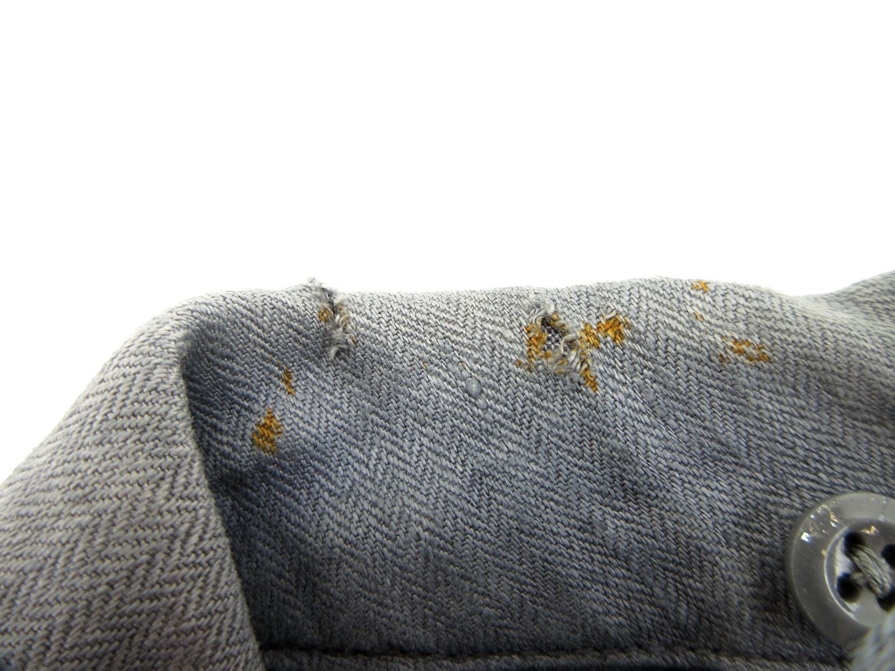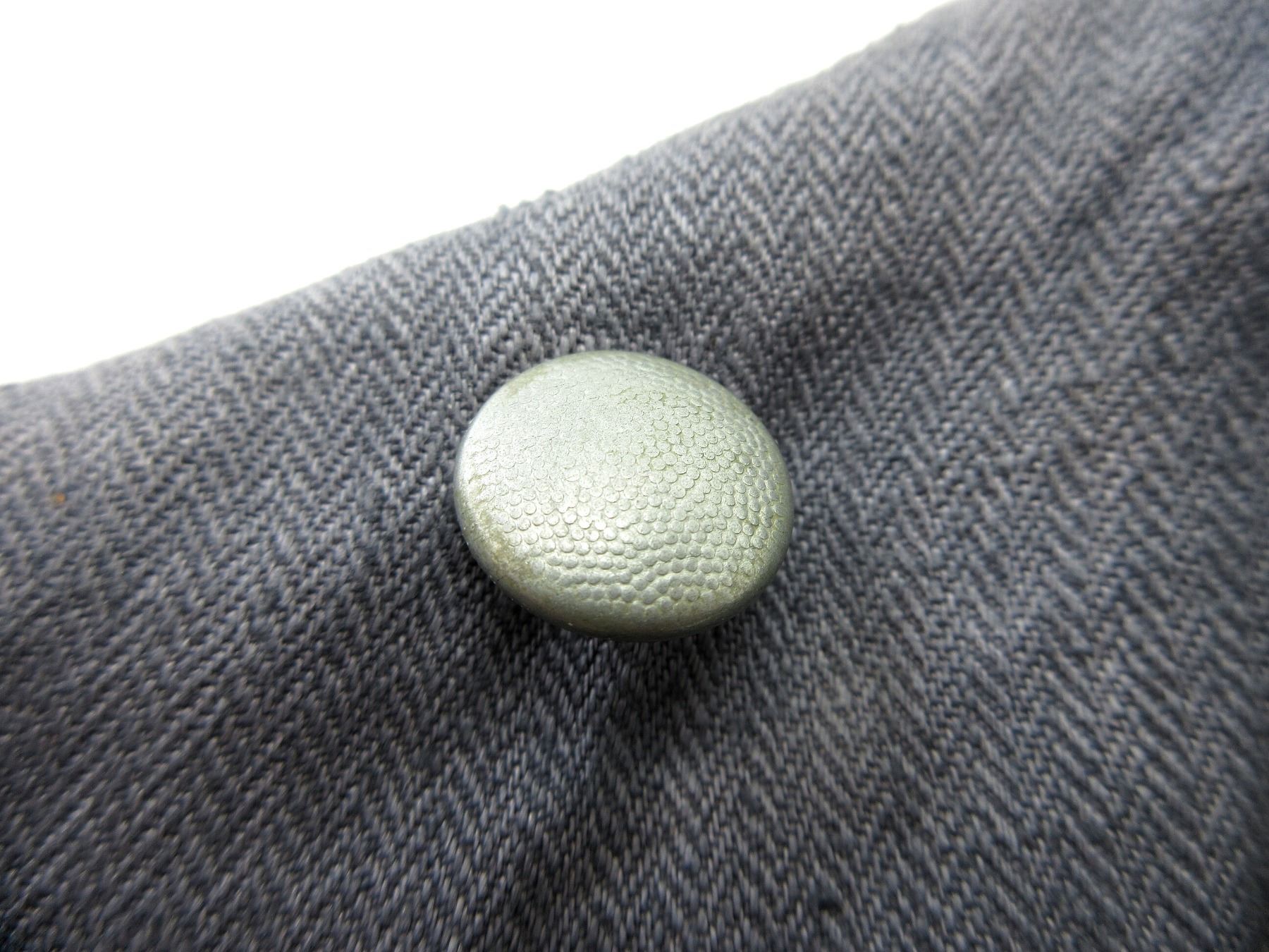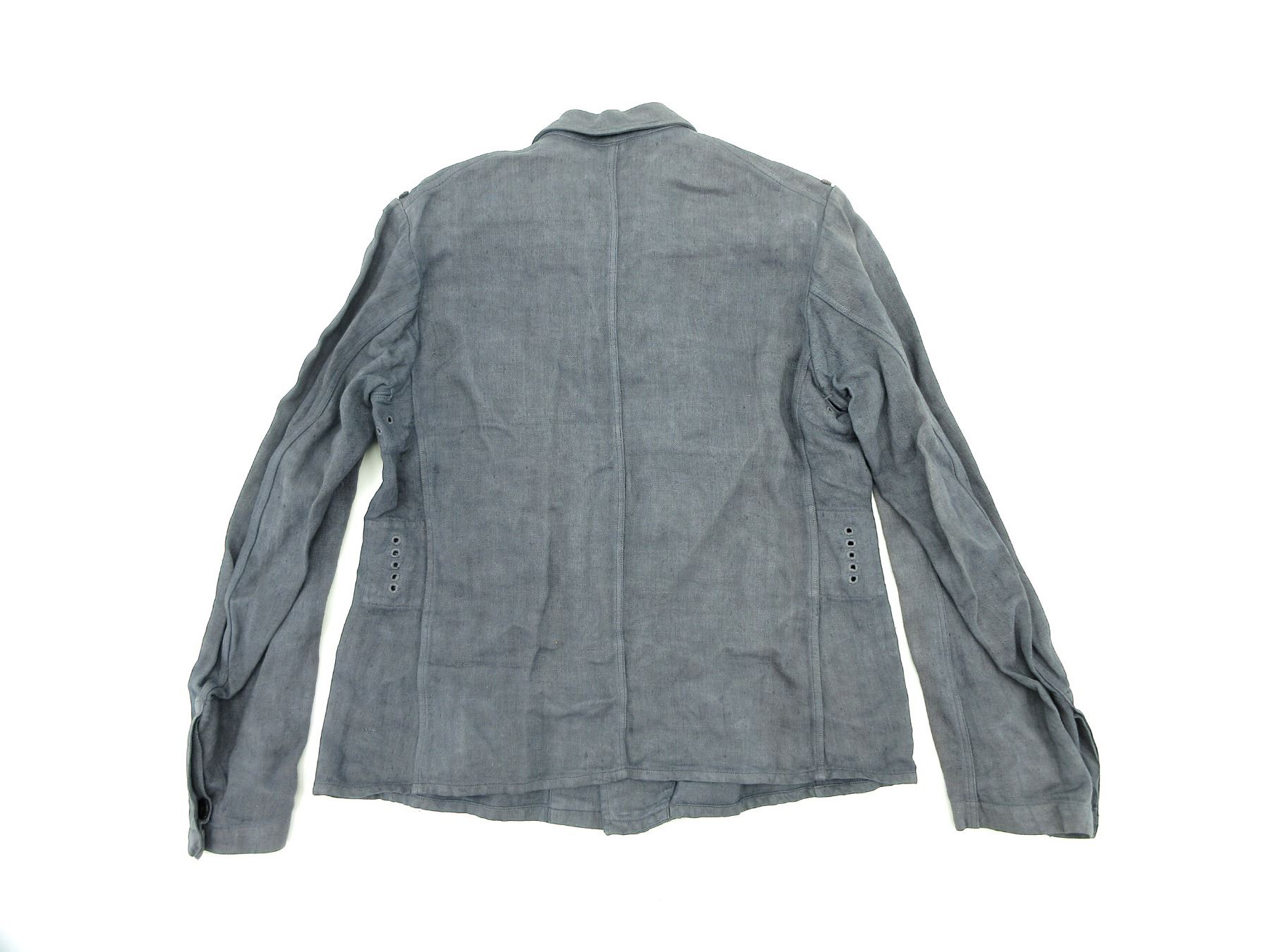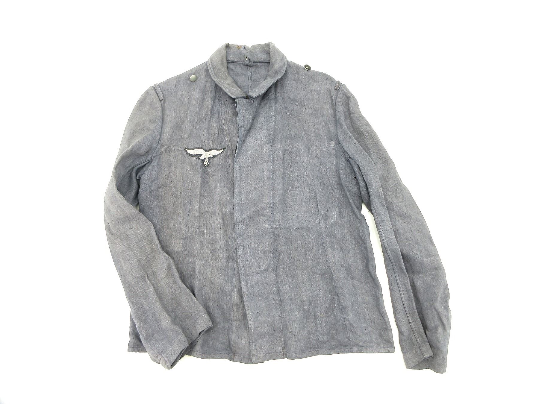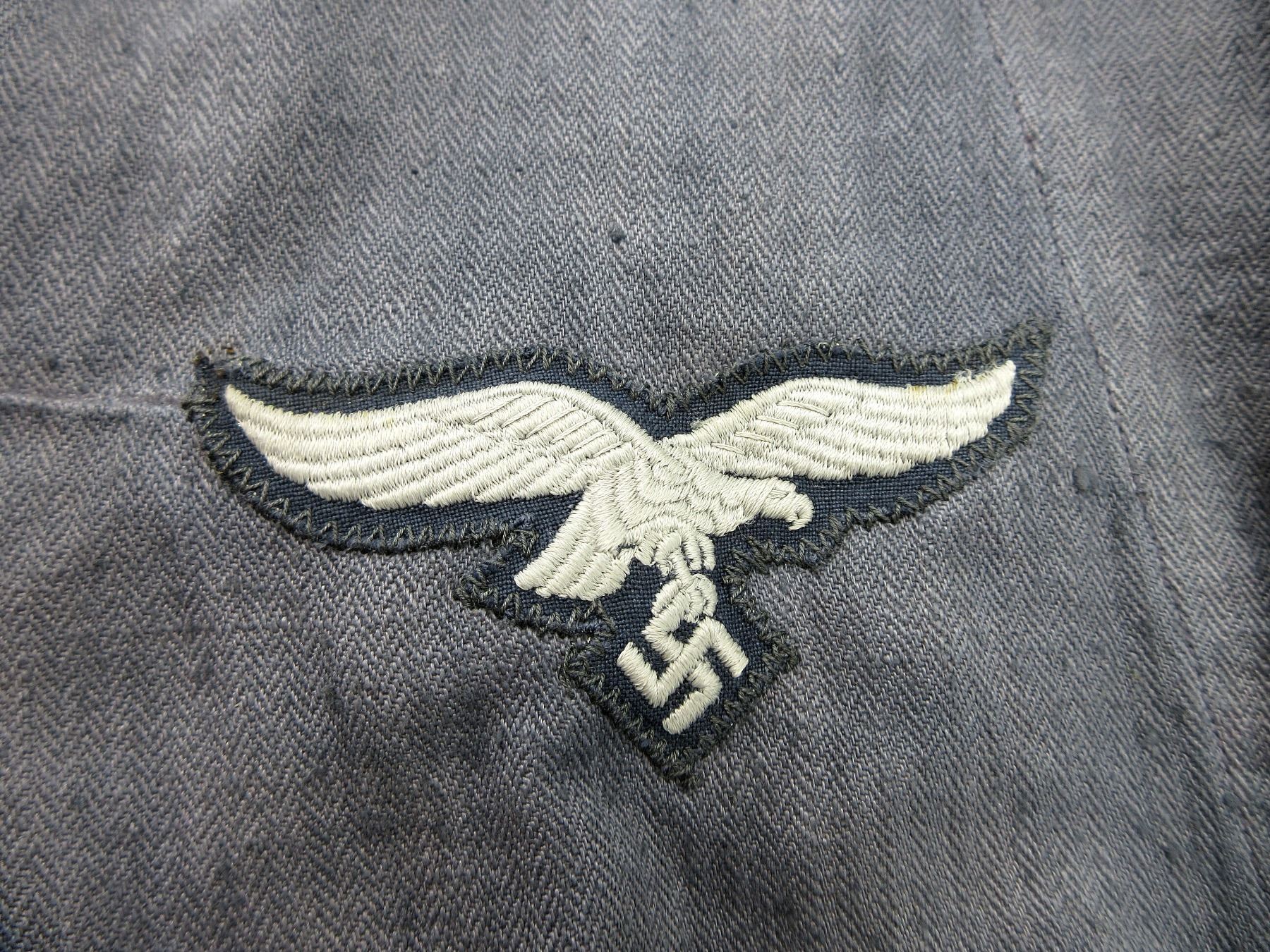 (1) BLUE / GREY CANVAS SHIRT WITH LUFTWAFFE BREAST EAGLE, NO VISIBLE MARKINGS / LABELS, SILVER PEBBLED BUTTONS ON SHOULDERS, CLOSED COLLAR, BUTTON FRONT, SHOWS WEAR / SLIGHT TEAR, SHOULDER WIDTH APPROX. 17". SEE PHOTOS.