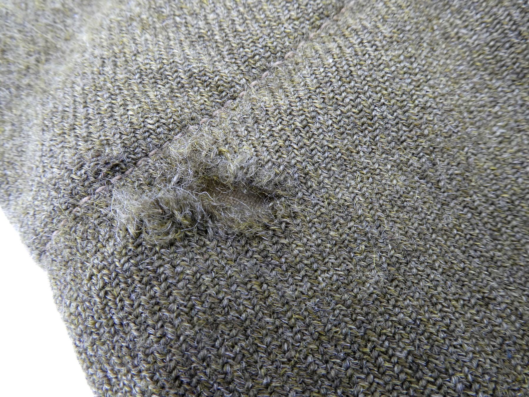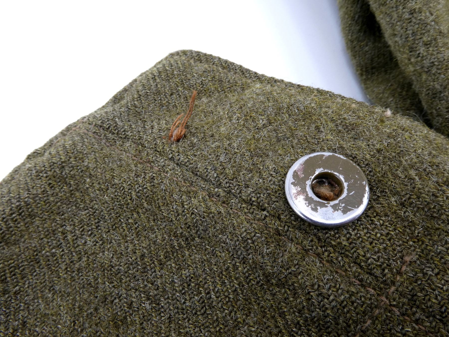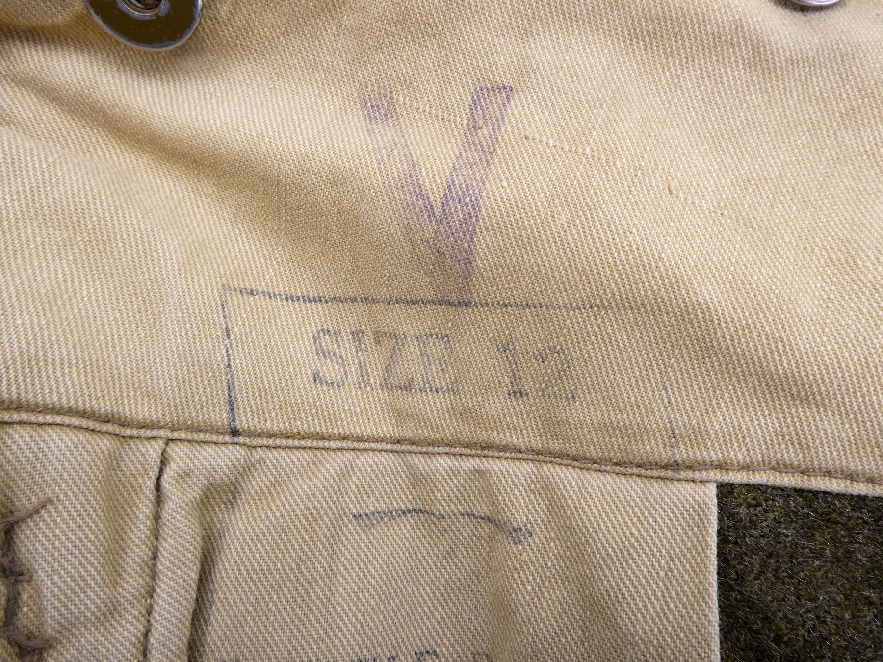 (1) GREEN WOOL BATTLE DRESS PANTS, MARKED: "V, SIZE 12, BATTLE DRESS, TROUSERS SERGE, 5 FT. 9" & 10", WAIST 35 TO 36, BREECH 41 TO ??, ?????, ??? 1942" WITH C-BROAD ARROW, BUTTON-FLY, MISSING TWO BUTTONS, SHOWS AGE / WEAR / TEAR, SOME REPAIR SPOTS. SEE PHOTOS.