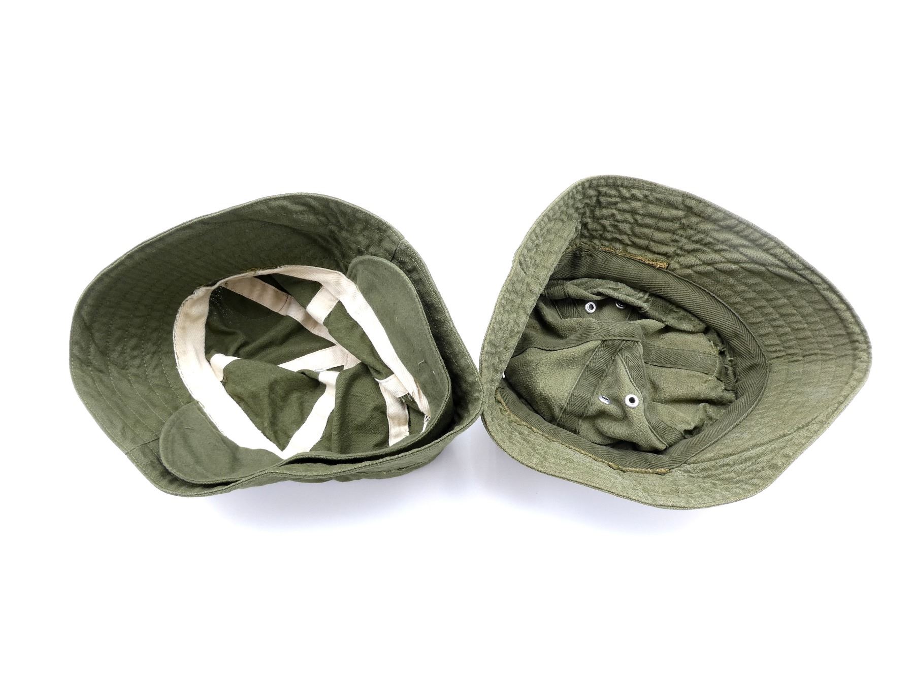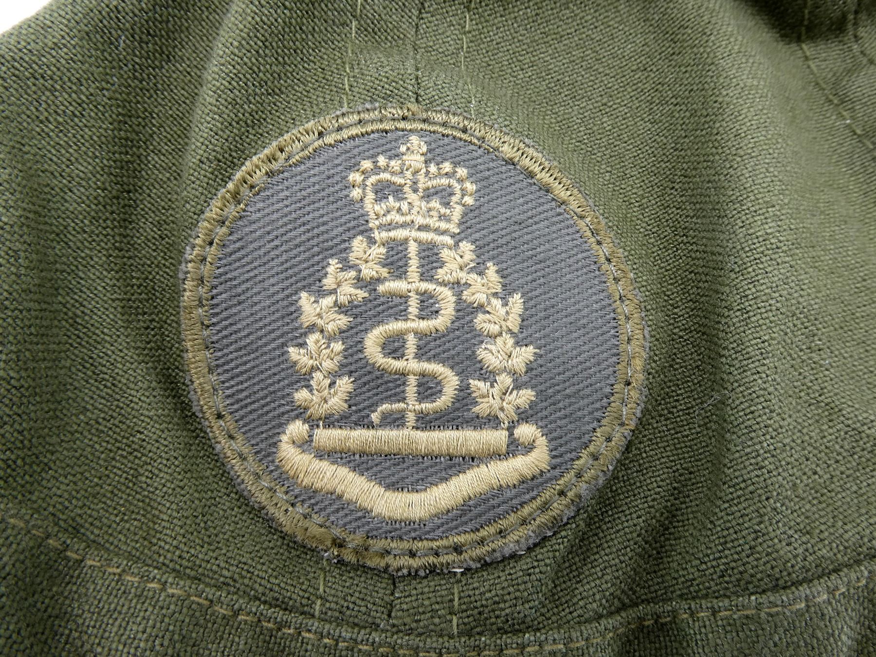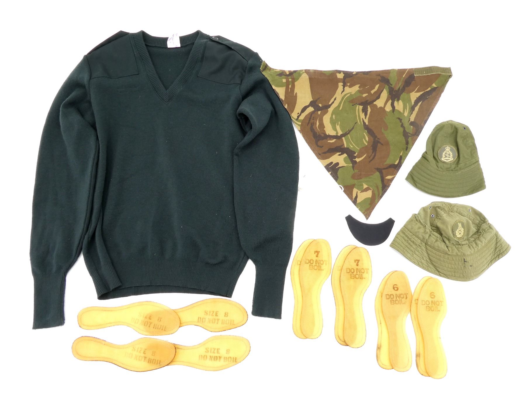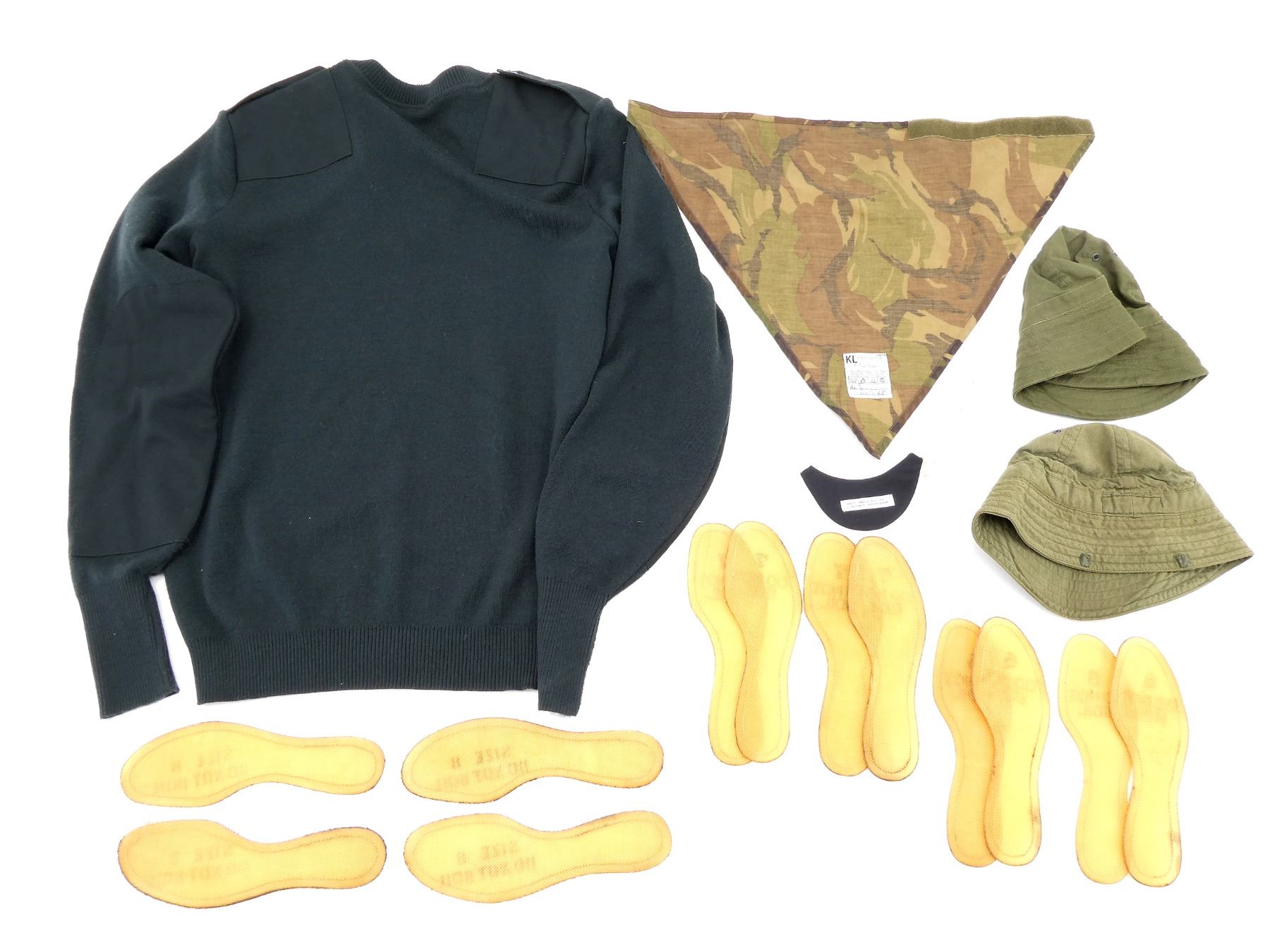 (1) CANADIAN MILITARY RIFLE GREEN WOOL SWEATER, LABEL MARKED: "8405-21-920-2542, T-L" ETC., SIZE TALL-LARGE, PREVIOUSLY WORN, IN VERY GOOD CONDITION, (6) VIETNAM WAR ERA U.S. MILITARY JUNGLE BOOT TROPICAL INSOLE PAIRS, TWO PAIRS OF SIZE 8, TWO PAIRS OF SIZE 7, TWO PAIRS OF SIZE 6, MARKED: "SIZE 8, DO NOT BOIL", "7, DO NOT BOIL" & "6, DO NOT BOIL", (1) DUTCH MILITARY KERCHIEF, BROWN / TAN CAMO, VARIOUS MARKINGS ON LABEL, (1) CANADIAN ARMY FEMALE NECK PIECE, MARKED: "NATO: 8445-21-899-1183" & VARIOUS OTHER MARKINGS & (2) CANADIAN MILITARY FIELD CAPS, BOONIE / "ROBIN HOOD" STYLE, ONE WITH MEDICAL BRANCH BADGE, NO VISIBLE MARKINGS, ONE SHOWS WEAR. SEE PHOTOS.