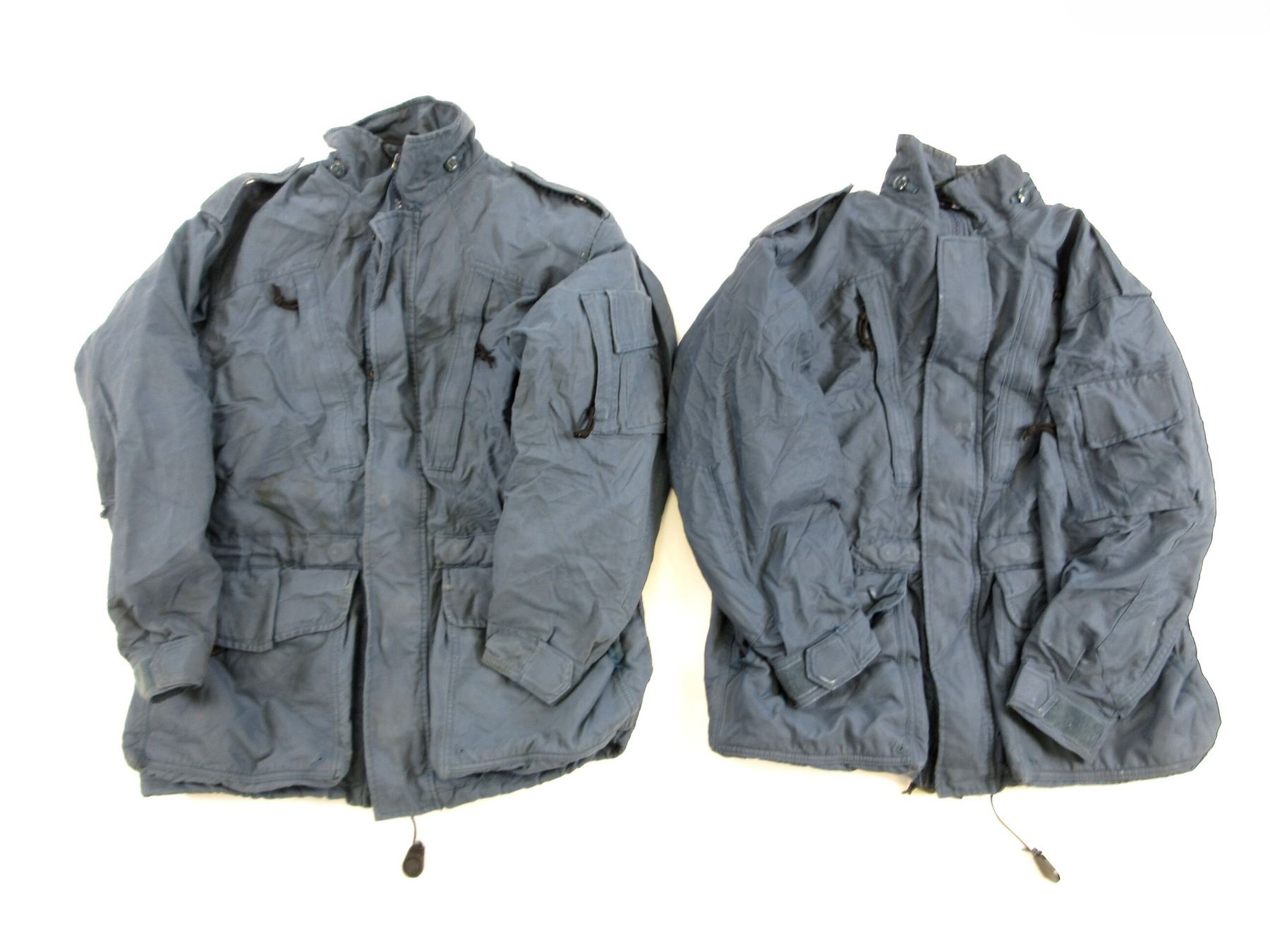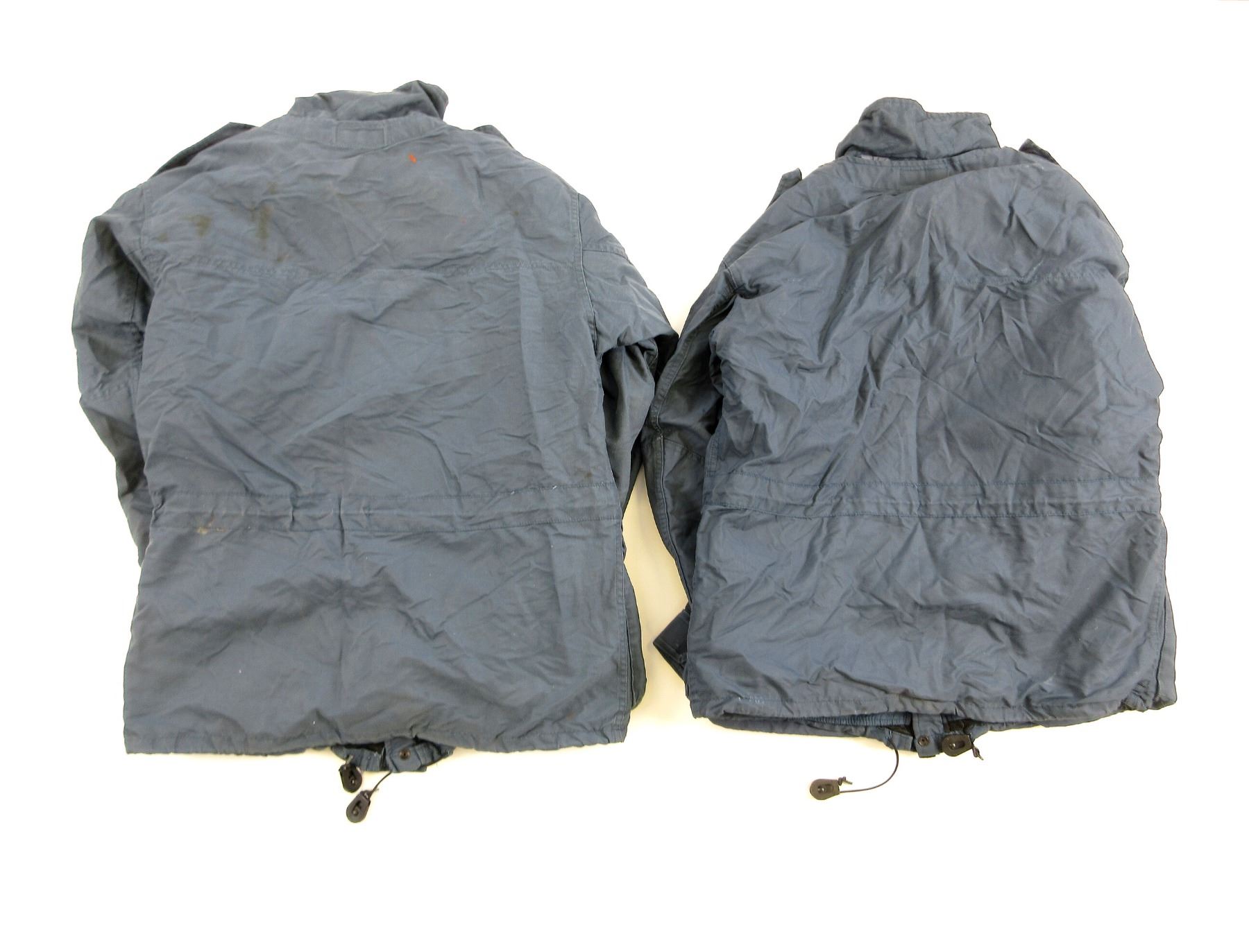 LOT INCLUDES; (2) BLUE COLD / WET WEATHER PARKAS, SIZES MEDIUM-SHORT / MEDIUM-REGULAR, ZIPPERED-FLY (WORKS), VARIOUS MARKINGS, BUILT IN HOOD, SHOWS WEAR / SLIGHT TEAR. SEE PHOTOS.