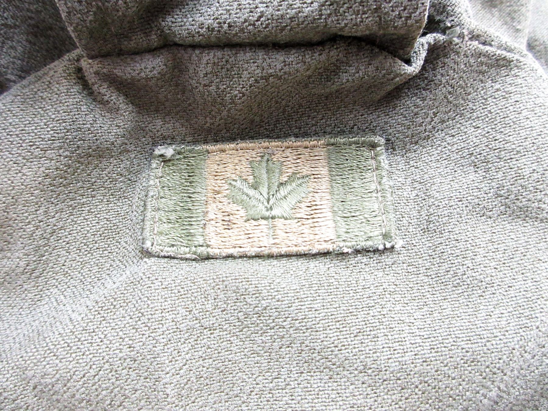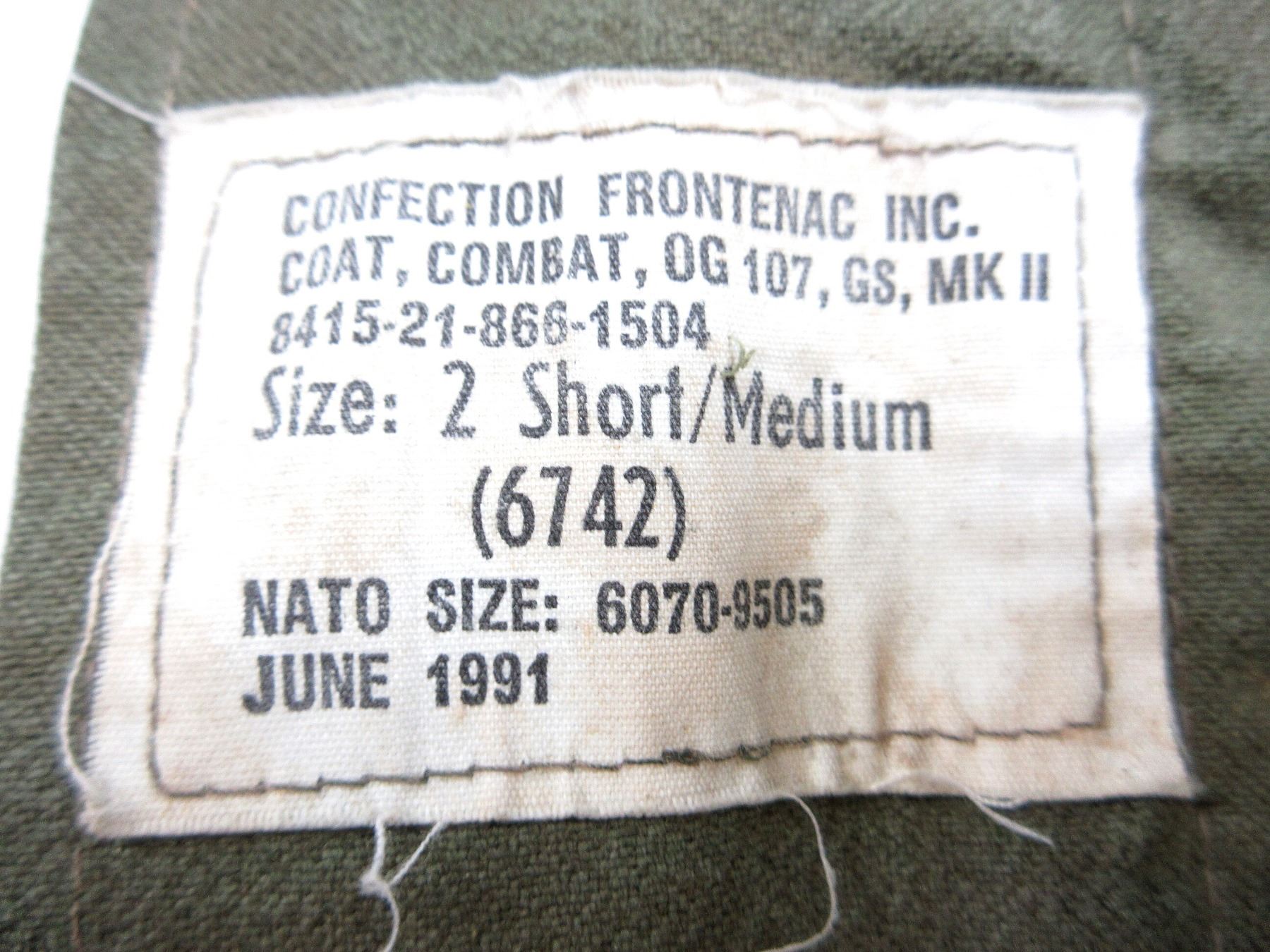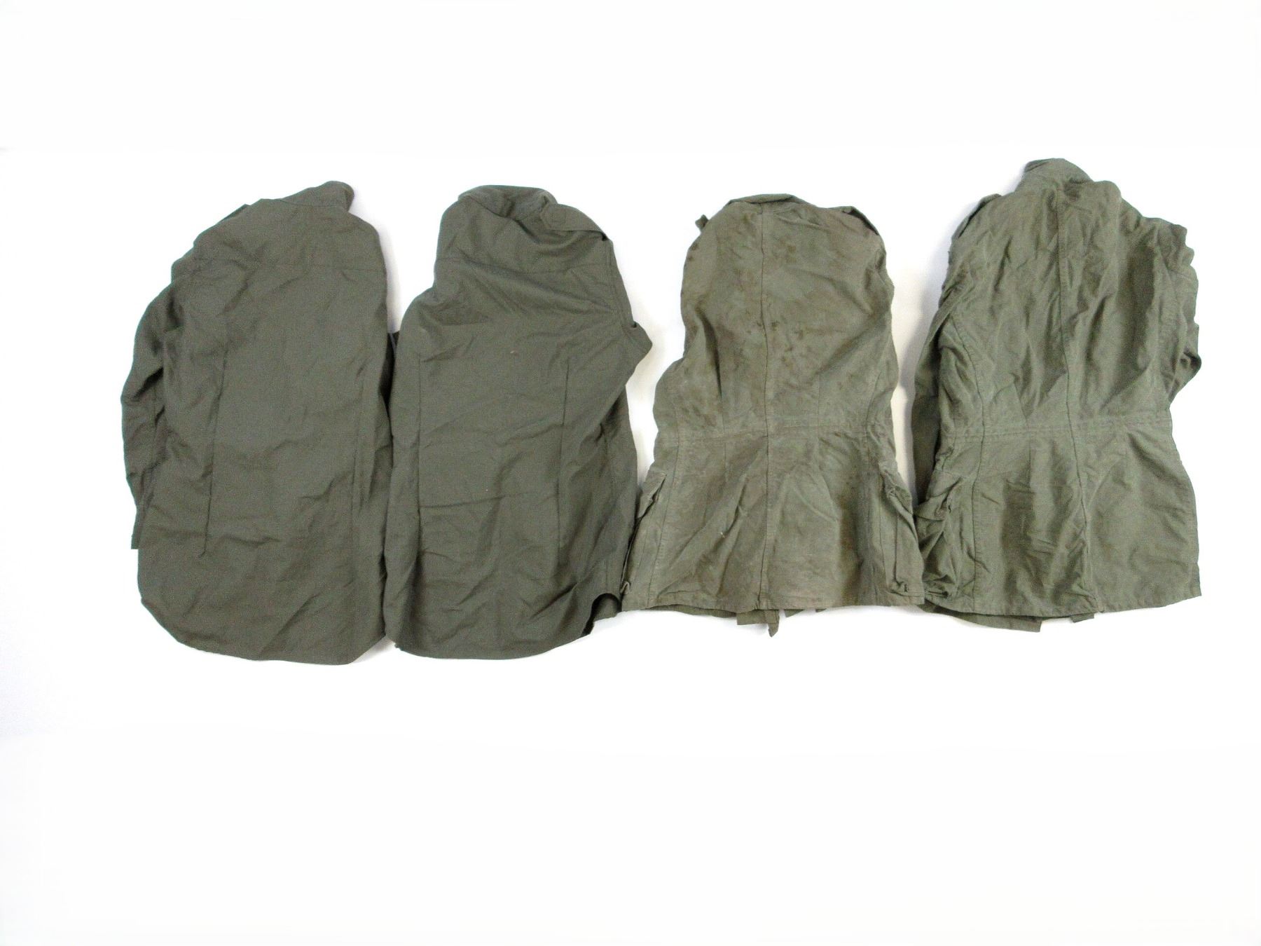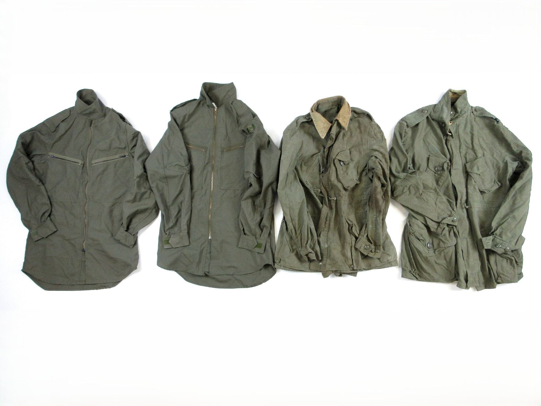 LOT INCLUDES; (2) RCAF GREEN FLIGHT / TACTICAL HELICOPTER SHIRTS, SIZE REGULAR-SMALL, MARKED: "SPORTIVE MFG. INC., SHIRT, TACTICAL HELICOPTER, 8415-21-899-2450, SIZE: 7038 REGULAR SMALL" ETC. & "W8486-0-2254-001/PR, NSN 8415-21-899-2450, SIZE 7038" ETC., ZIPPERED-FRONT / VARIOUS ZIPPERS (ALL WORK) & (2) GREEN CANVAS GS MKII COMBAT COATS, SIZES 2 SHORT-MEDIUM / 5 REGULAR-MEDIUM, VARIOUS LABELS / MARKINGS ON ALL, BUTTON / ZIPPERED FRONTS, ONE WORKS, ONE DOES NOT (CORRODED), ALL SHOW AGE / WEAR / TEAR. SEE PHOTOS.