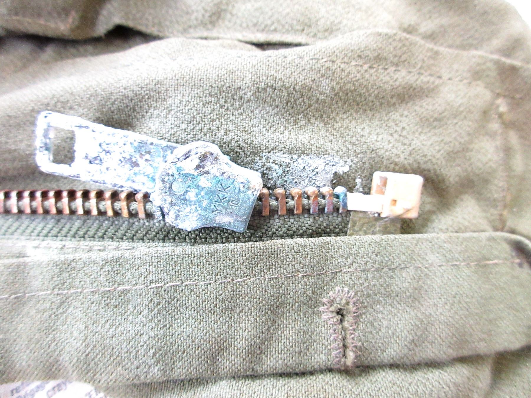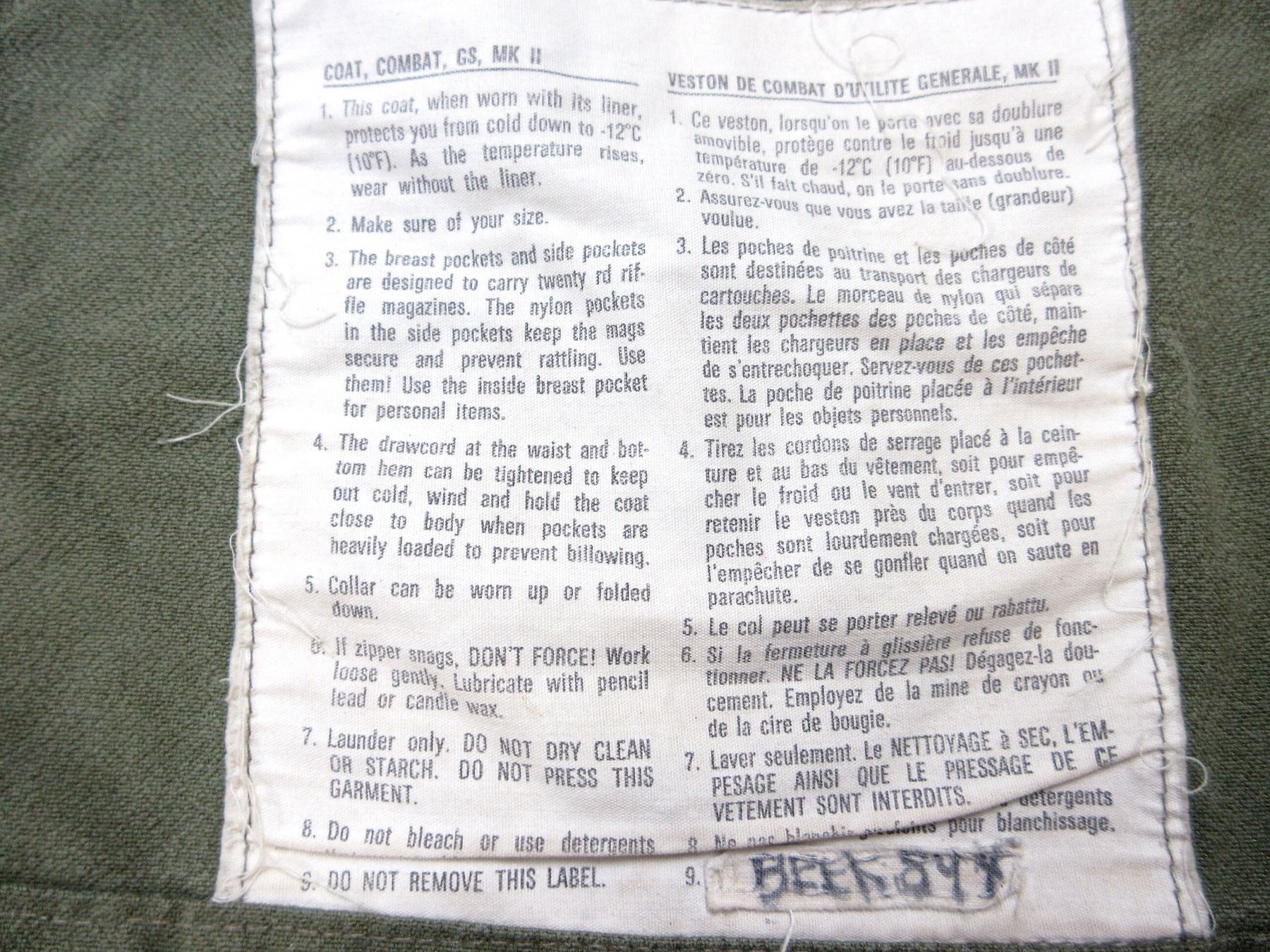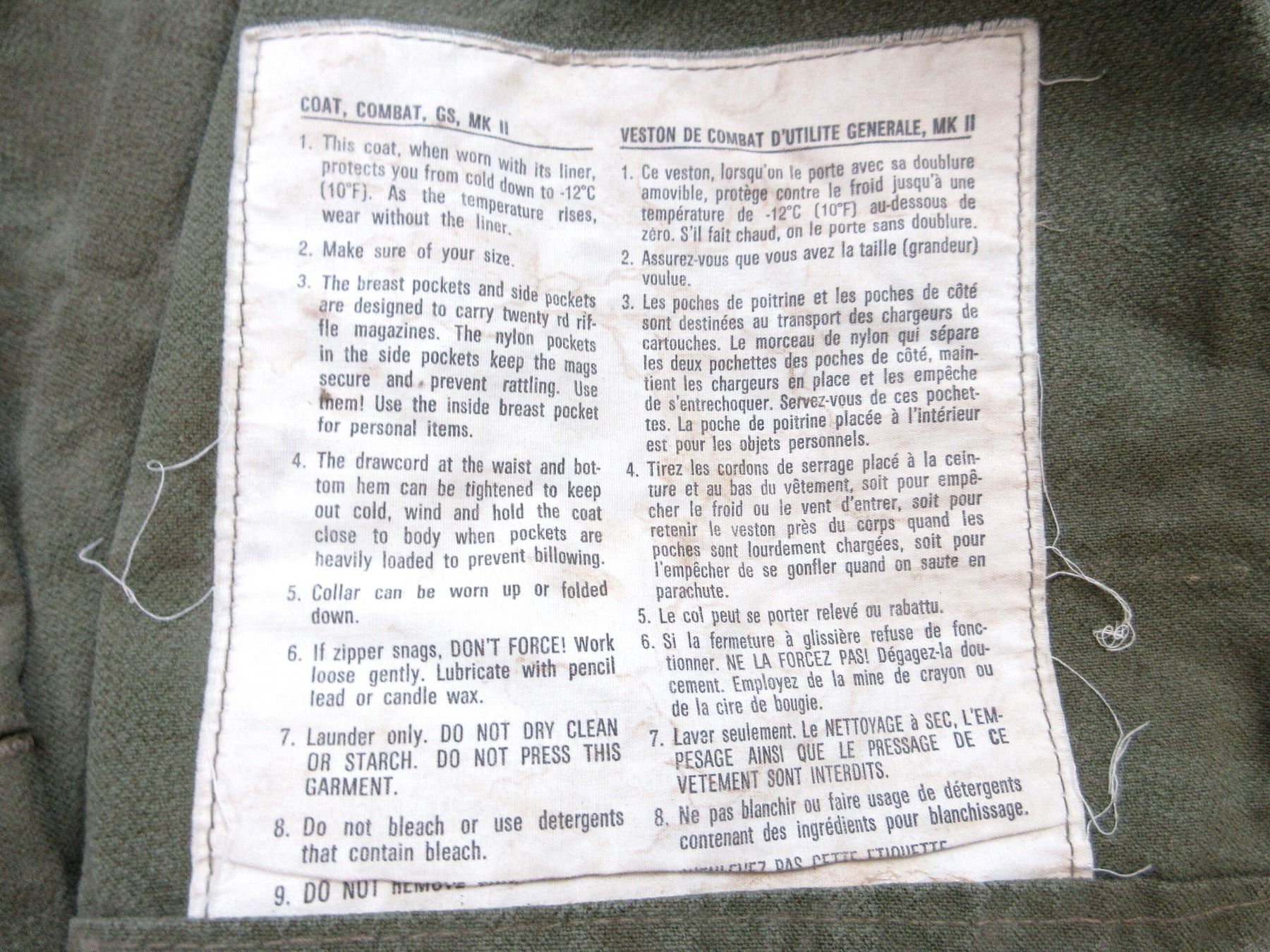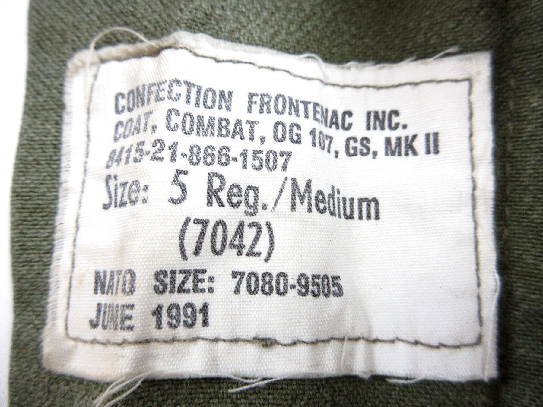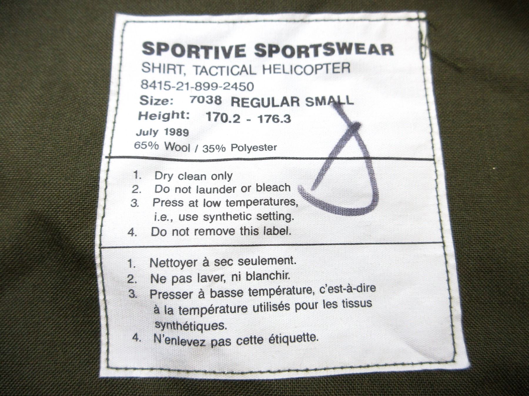 LOT INCLUDES; (2) RCAF GREEN FLIGHT / TACTICAL HELICOPTER SHIRTS, SIZE REGULAR-SMALL, MARKED: "SPORTIVE MFG. INC., SHIRT, TACTICAL HELICOPTER, 8415-21-899-2450, SIZE: 7038 REGULAR SMALL" ETC. & "W8486-0-2254-001/PR, NSN 8415-21-899-2450, SIZE 7038" ETC., ZIPPERED-FRONT / VARIOUS ZIPPERS (ALL WORK) & (2) GREEN CANVAS GS MKII COMBAT COATS, SIZES 2 SHORT-MEDIUM / 5 REGULAR-MEDIUM, VARIOUS LABELS / MARKINGS ON ALL, BUTTON / ZIPPERED FRONTS, ONE WORKS, ONE DOES NOT (CORRODED), ALL SHOW AGE / WEAR / TEAR. SEE PHOTOS.