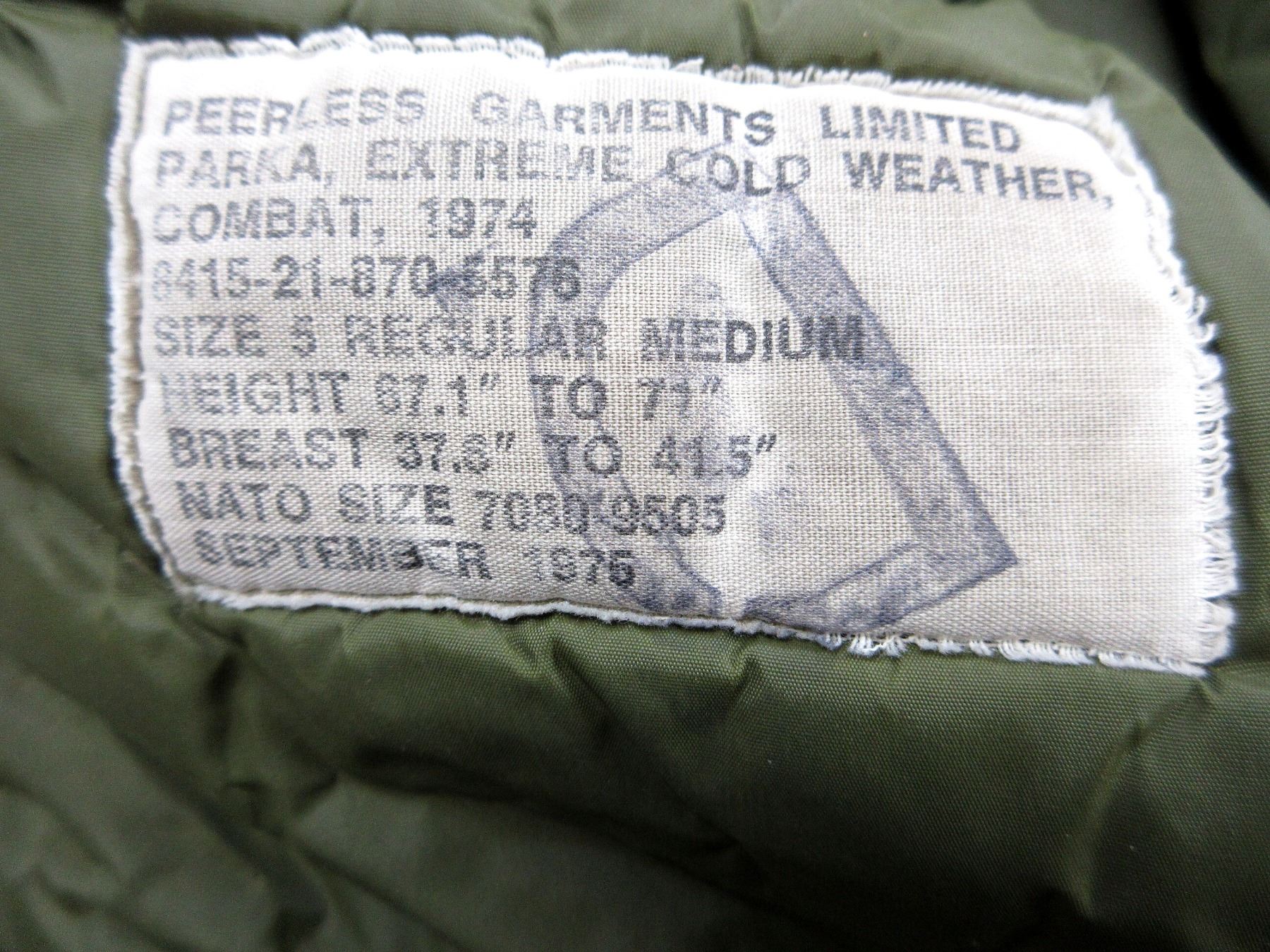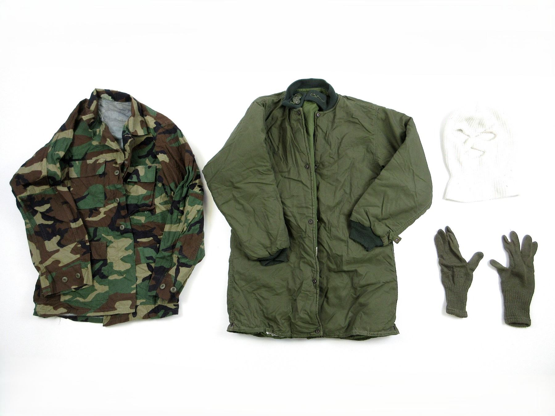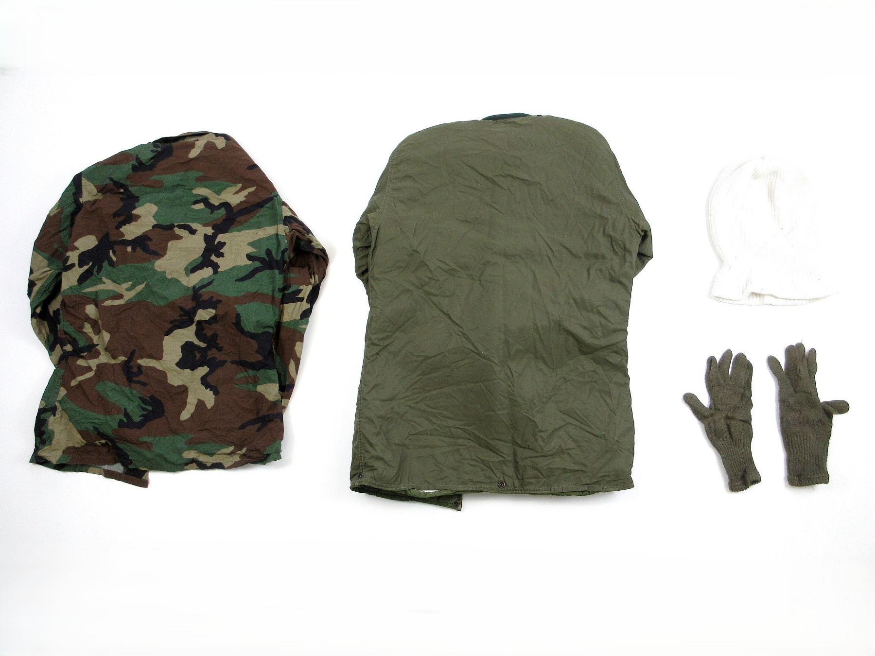 LOT INCLUDES; (1) CANADIAN MILITARY GREEN NYLON EXTREME COLD WEATHER COMBAT PARKA, SIZE 5 REGULAR-MEDIUM, VARIOUS LABELS / MARKINGS, SNAP CLOSURE, SHOWS AGE / WEAR / TEAR, (1) U.S. MILITARY WOODLAND CAMO HOT WEATHER COMBAT SHIRT, SIZE MEDIUM-LONG, VARIOUS LABELS / MARKINGS, BUTTON FRONT, SHOWS WEAR, (1) CANADIAN MILITARY WHITE ACRYLIC BALACLAVA, VARIOUS MARKINGS ON LABEL, SHOWS WEAR & (1) PAIR OF GREEN WOOL / ACRYLIC GLOVES, VARIOUS HAND-WRITTEN MARKINGS, SHOWS WEAR. SEE PHOTOS.