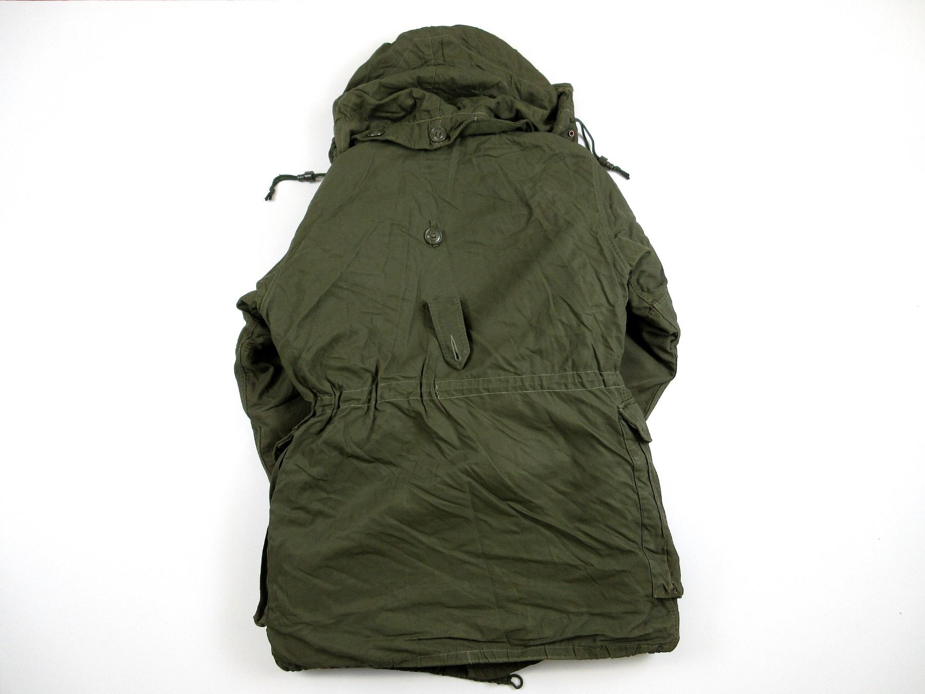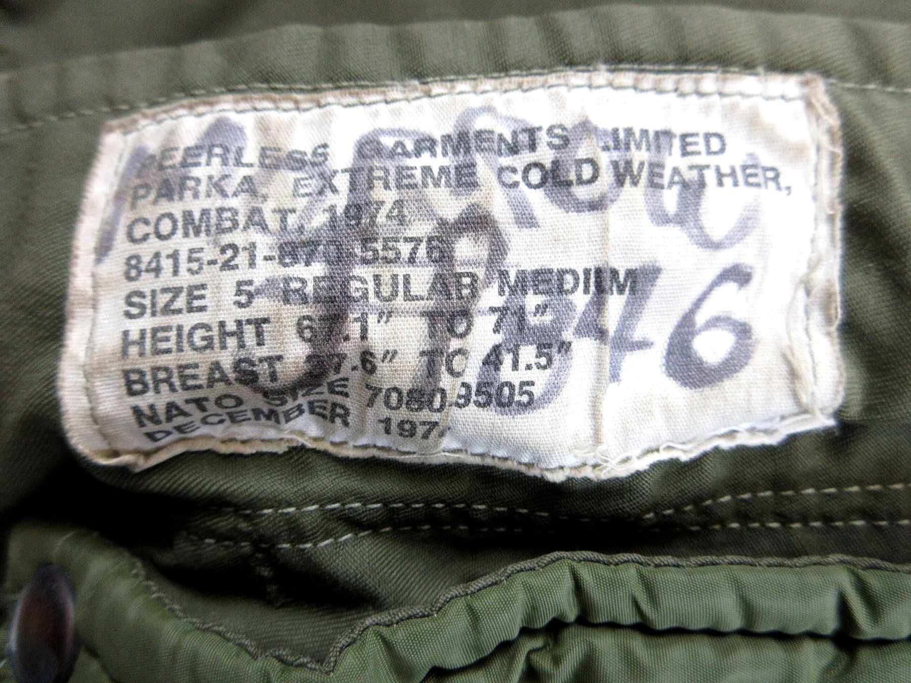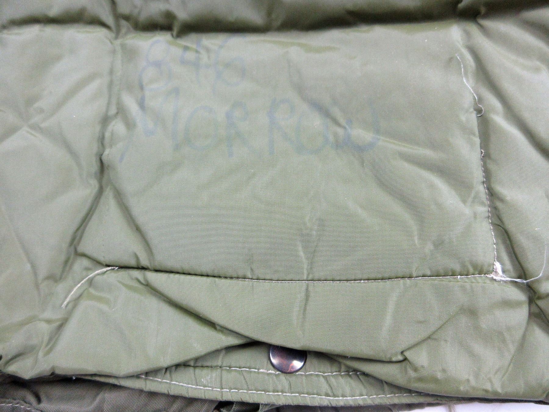(1) GREEN NYLON EXTREME COLD WEATHER COMBAT PARKA WITH REMOVEABLE LINER & HOOD, COAT / LINER SIZE 5 REGULAR-MEDIUM, VARIOUS LABELS / MARKINGS, BUTTON / ZIPPERED-FRONT (WORKS), SHOWS WEAR. SEE PHOTOS.