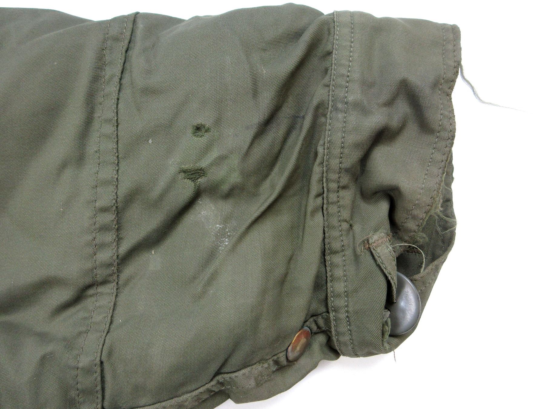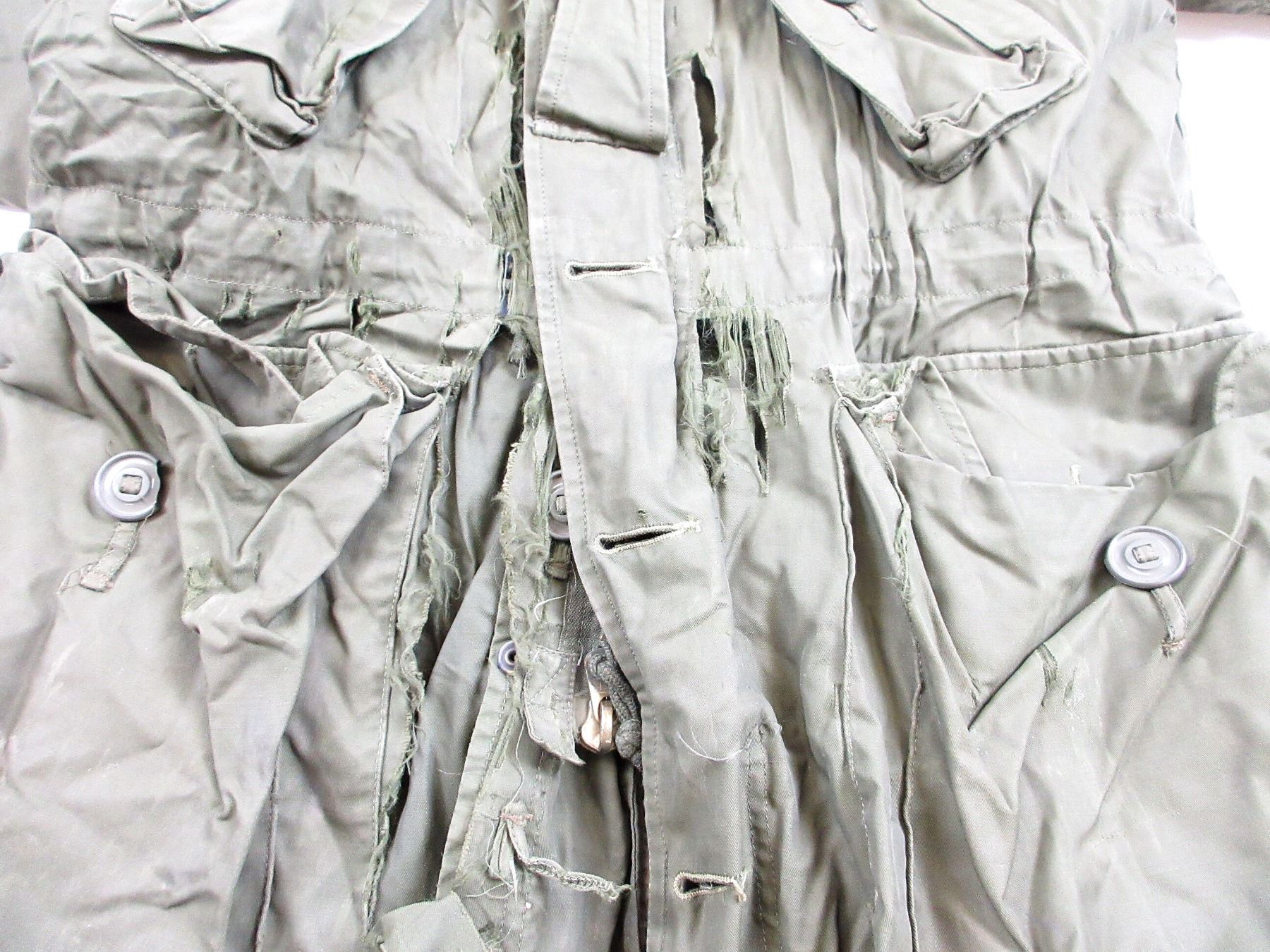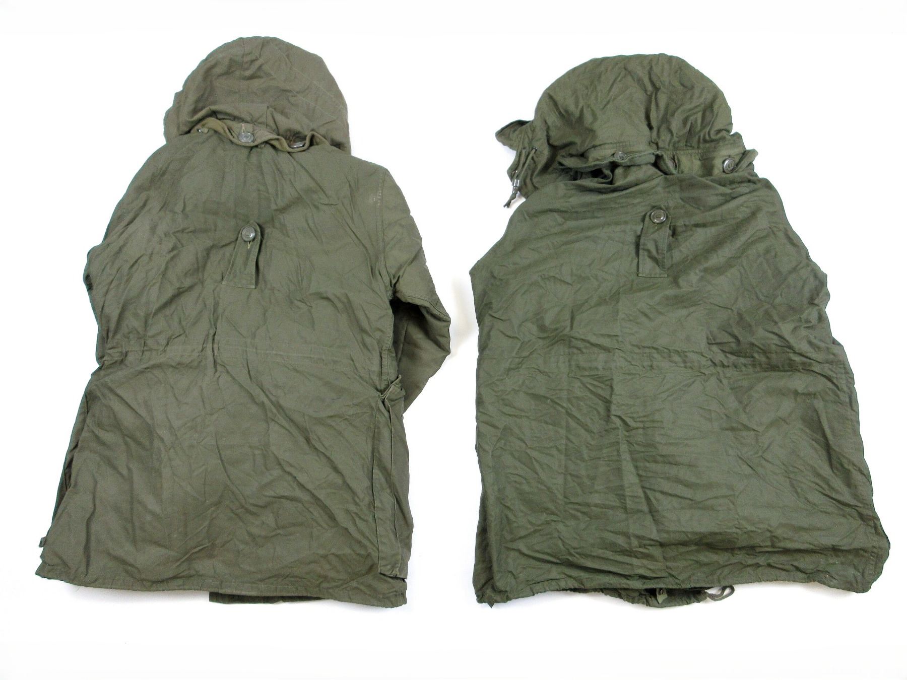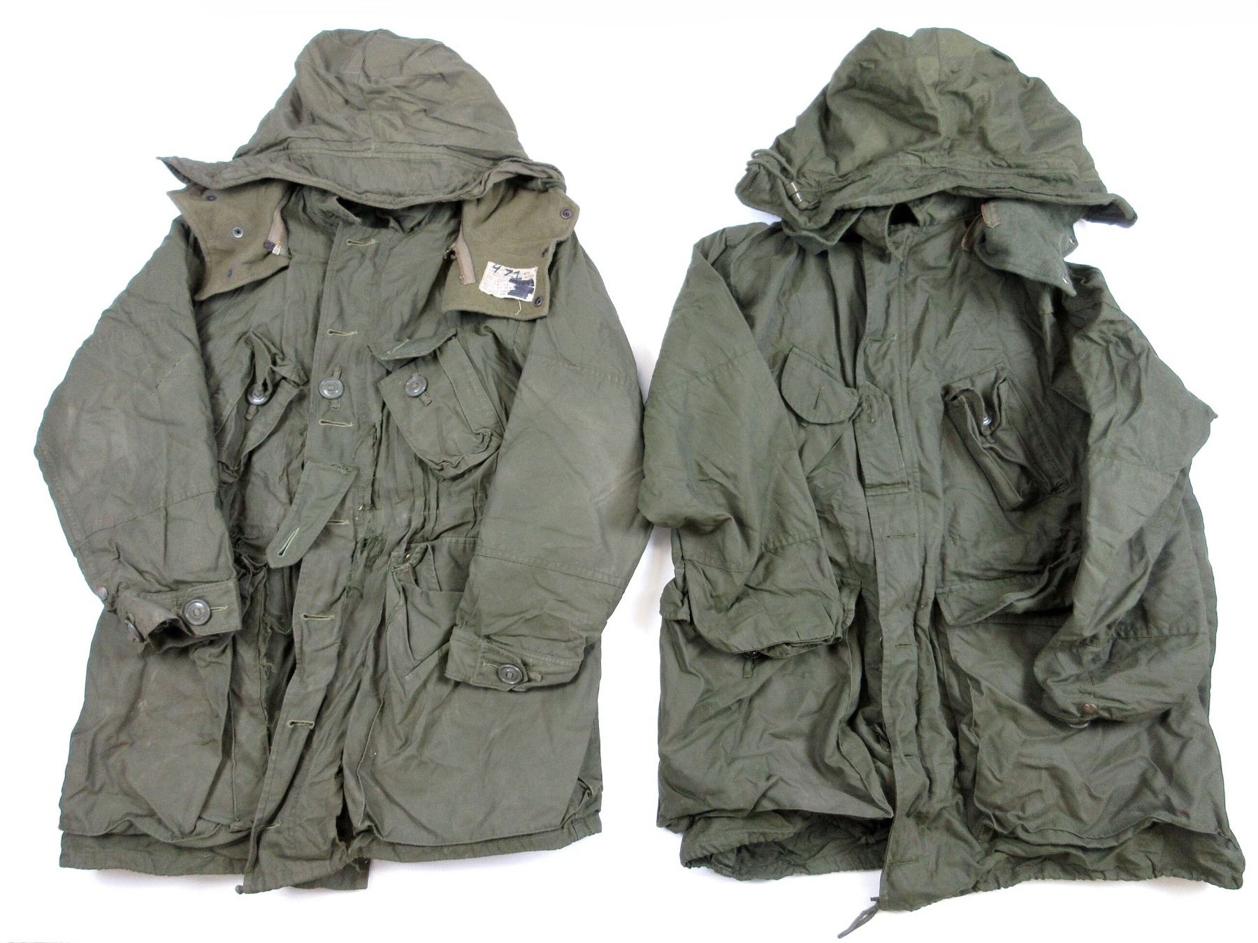 LOT INCLUDES; (1) GREEN NYLON EXTREME COLD WEATHER COMBAT PARKA WITH REMOVEABLE LINER & HOOD, COAT / LINER SIZE 2 SHORT-MEDIUM, VARIOUS LABELS / MARKINGS, BUTTON / ZIPPERED-FRONT (WORKS), SHOWS AGE / WEAR / TEAR & (1) GREEN NYLON EXTREME COLD WEATHER COMBAT PARKA WITH REMOVEABLE HOOD, NO LINER, SIZE 6X REGULAR-XLARGE, VARIOUS LABELS / MARKINGS, BUTTON / ZIPPERED-FRONT (WORKS), SHOWS WEAR. SEE PHOTOS.
