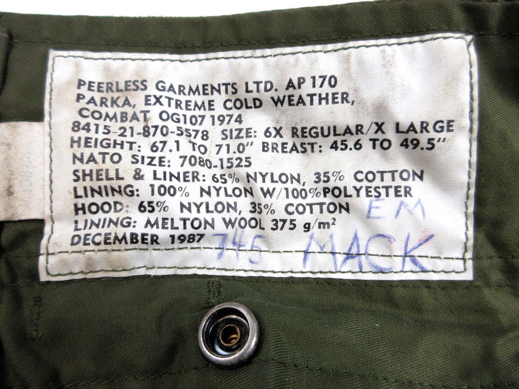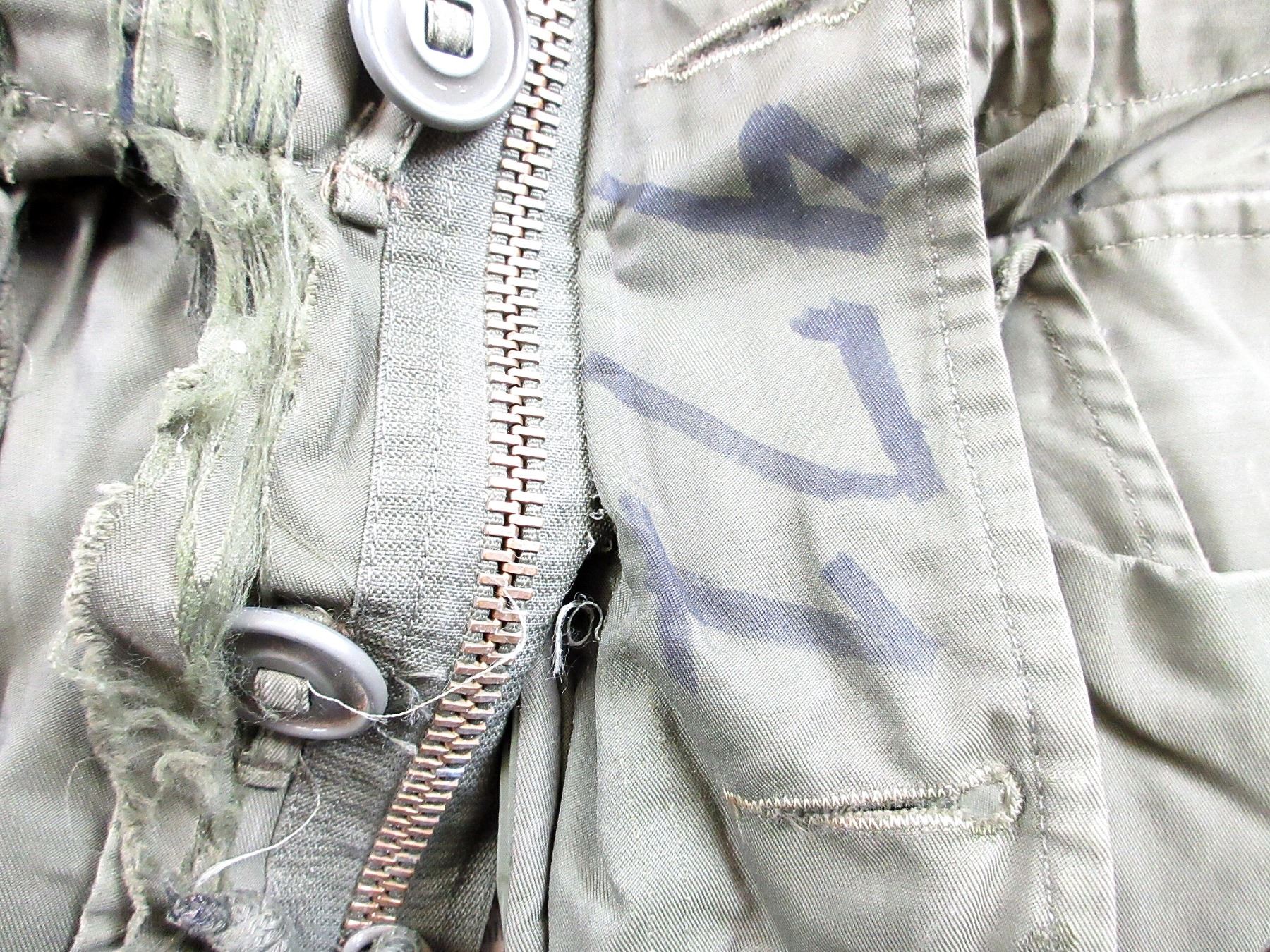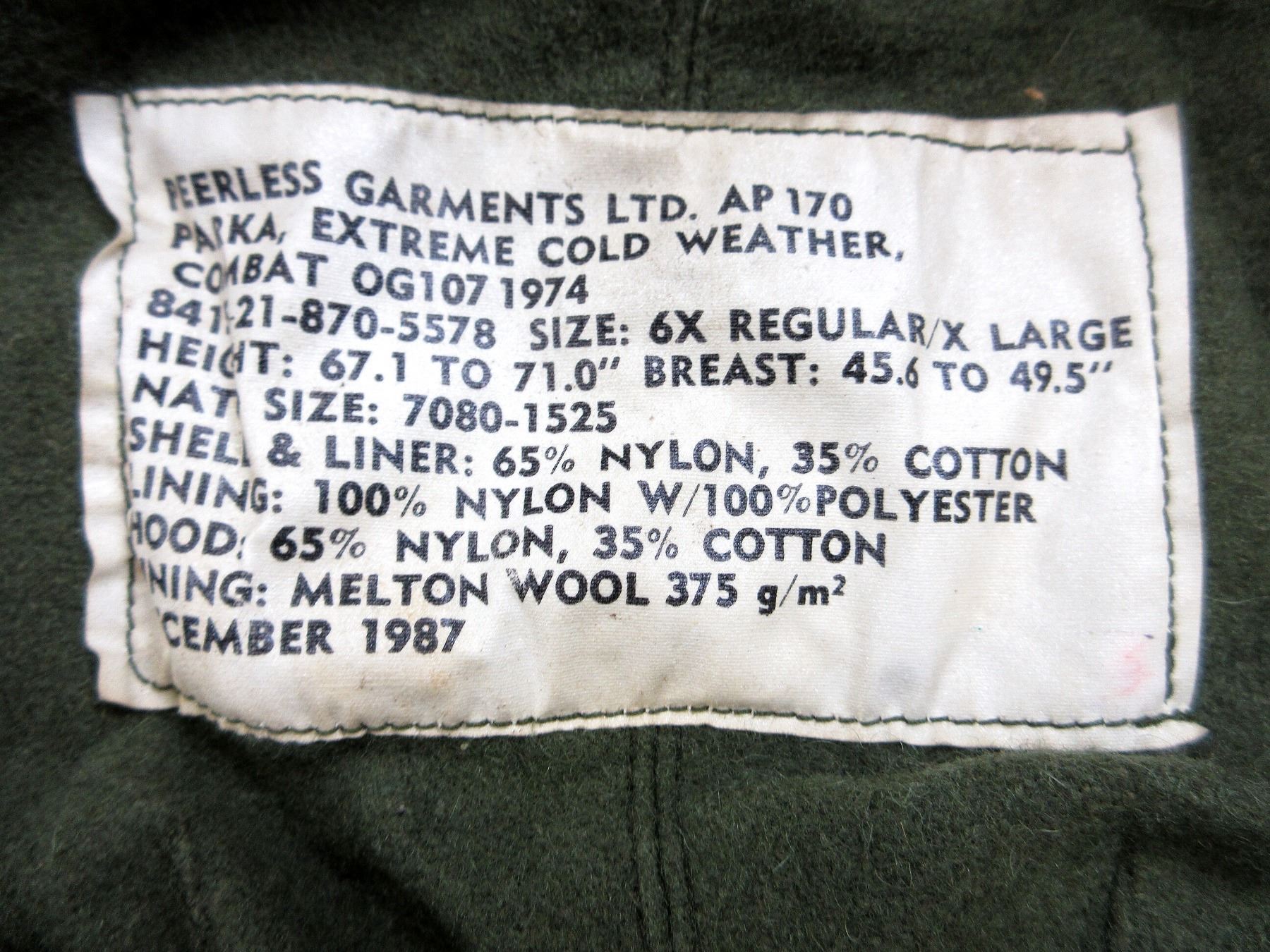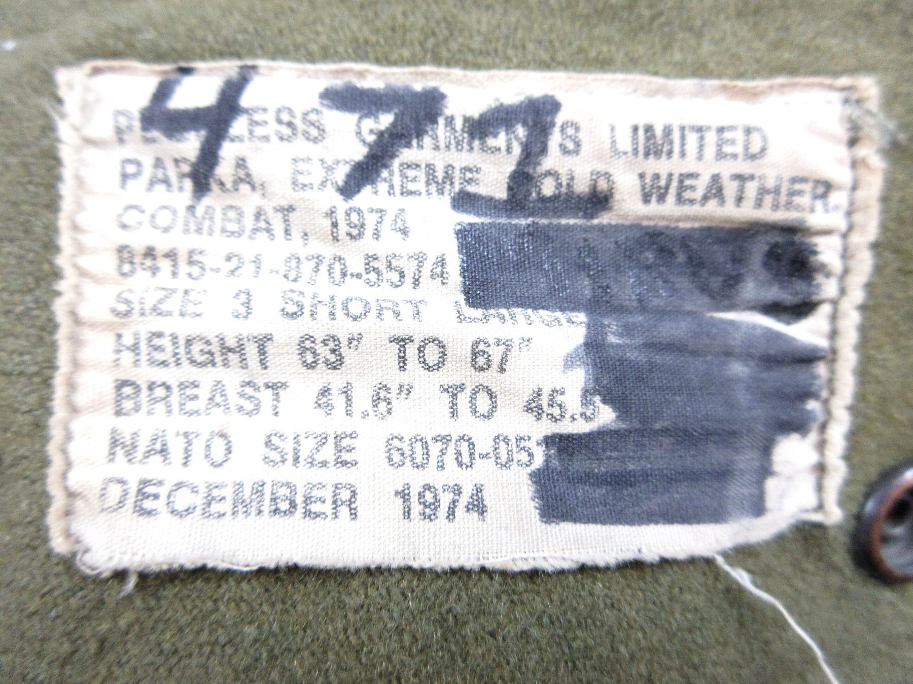 LOT INCLUDES; (1) GREEN NYLON EXTREME COLD WEATHER COMBAT PARKA WITH REMOVEABLE LINER & HOOD, COAT / LINER SIZE 2 SHORT-MEDIUM, VARIOUS LABELS / MARKINGS, BUTTON / ZIPPERED-FRONT (WORKS), SHOWS AGE / WEAR / TEAR & (1) GREEN NYLON EXTREME COLD WEATHER COMBAT PARKA WITH REMOVEABLE HOOD, NO LINER, SIZE 6X REGULAR-XLARGE, VARIOUS LABELS / MARKINGS, BUTTON / ZIPPERED-FRONT (WORKS), SHOWS WEAR. SEE PHOTOS.