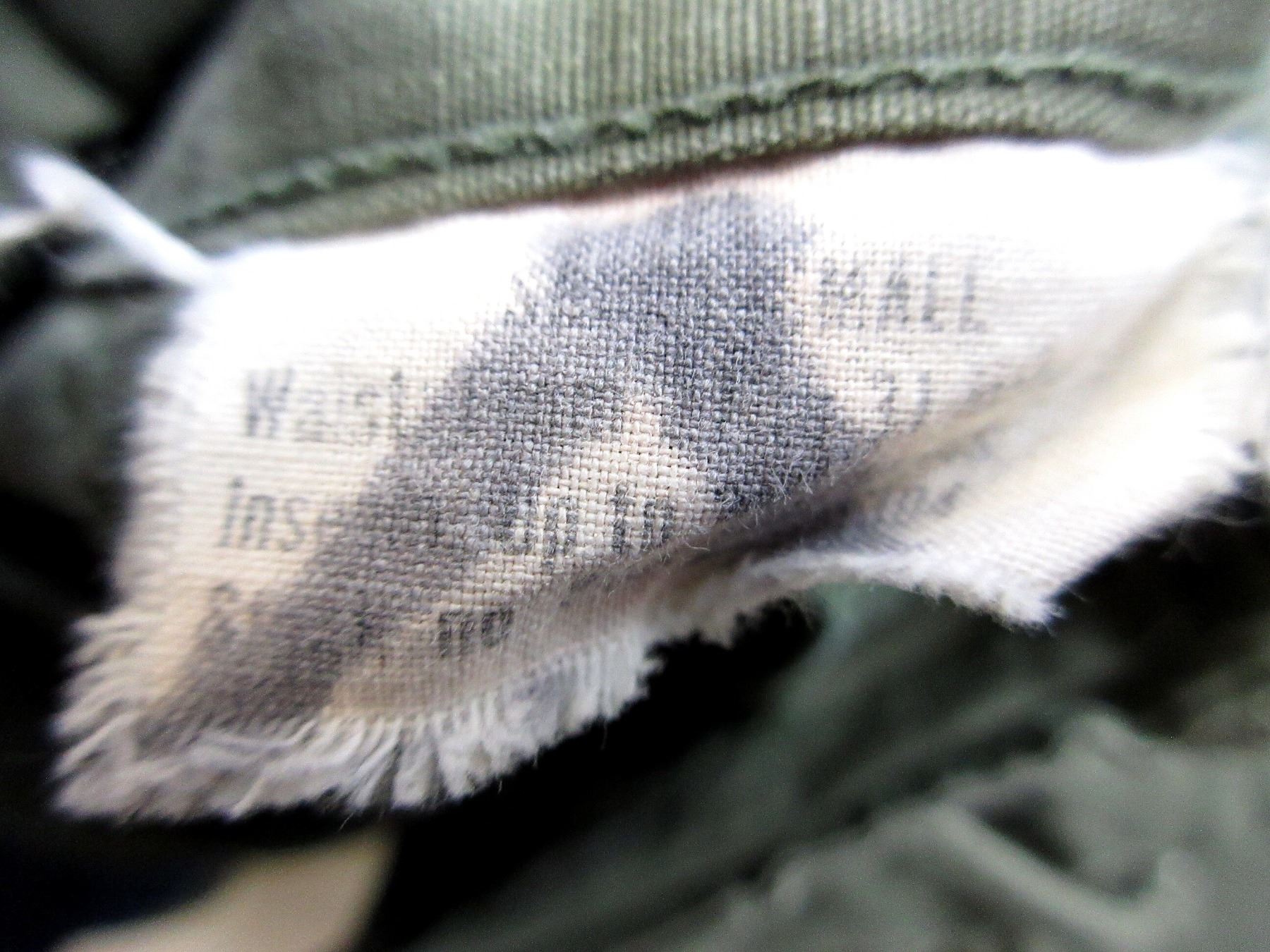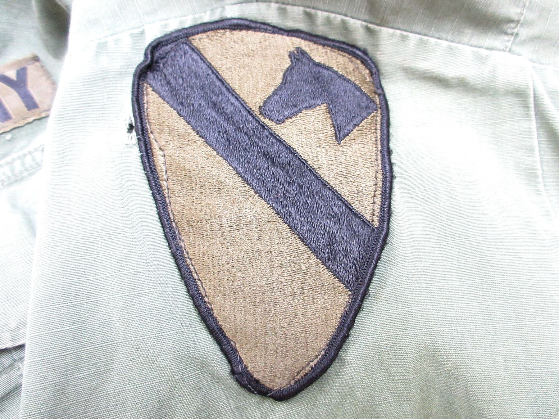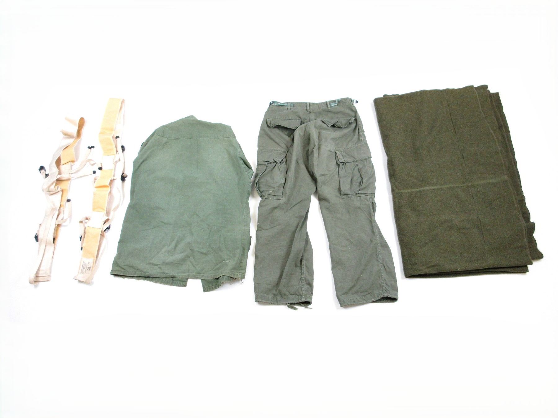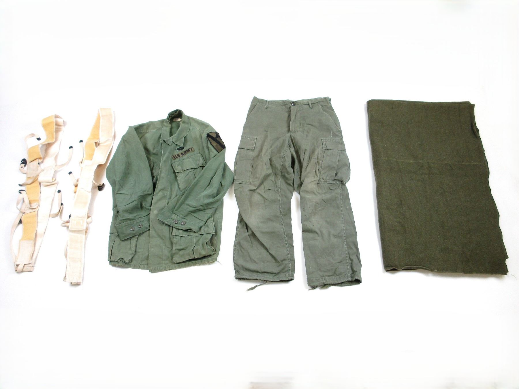 LOT INCLUDES; (1) GREEN COTTON JACKET, SIZE SMALL-SHORT, MARKED: "COAT, MAN'S, COTTON W/R RIP-STOP POPLIN OG 107-CLASS 1, DSA 100-69-C-1347" ETC. & VARIOUS OTHER MARKINGS, 1ST CAVALRY DIVISION BADGE, PARACHUTIST BADGE, U.S. ARMY BADGE, BUTTON FRONT, SHOWS AGE / WEAR / TEAR, (1) GREEN COTTON PANTS, SIZE SHORT-SMALL, MARKED: "TROUSERS, MAN'S, COTTON WIND RESISTANT, RIP STOP POPLIN, OG-107 CLASS 1, DSA 100-69-C-2149" ETC. & VARIOUS OTHER MARKINGS, BUTTON-FLY, SHOWS AGE / WEAR / TEAR, (1) U.S. MILITARY GREEN WOOL BLANKET, MARKED: "US", TIME-FRAME UNKNOWN, SHOWS WEAR / TEAR, APPROX. 82" X 66" & (1) U.S. MILITARY PAIR OF WHITE CANVAS SKI SKINS / CLIMBERS, MARKED: "US, CLIMBER, SKII, DLA100-82-C-432?" ETC., OALS APPROX. 71.5". SEE PHOTOS.