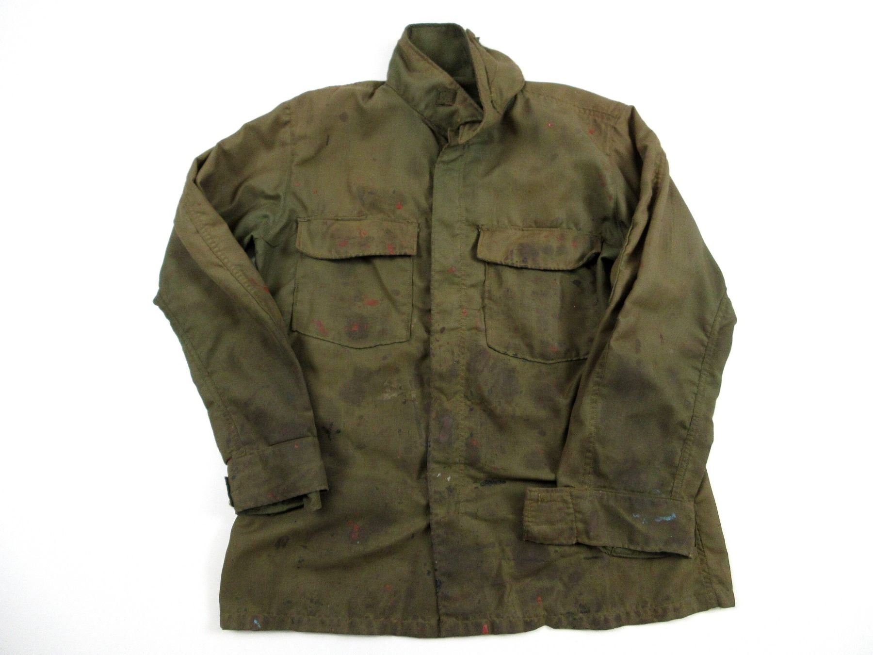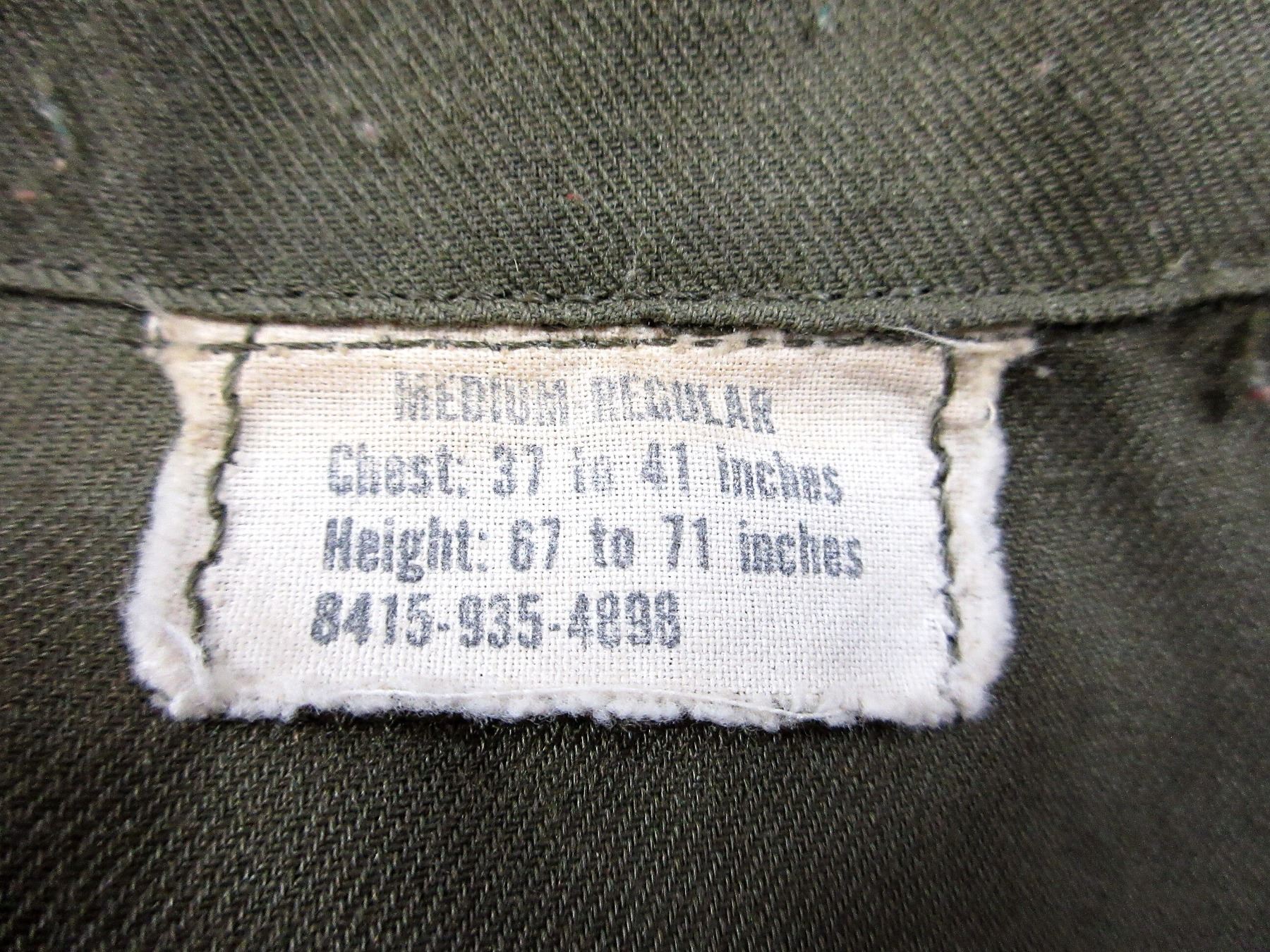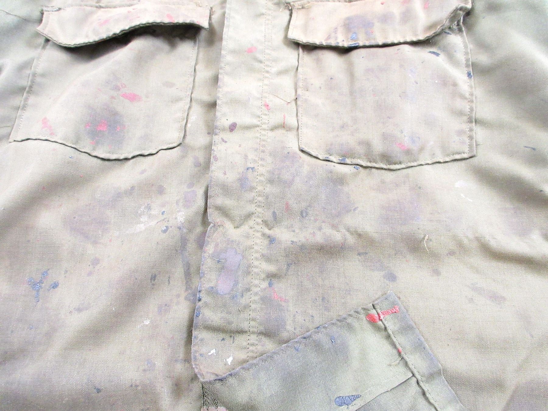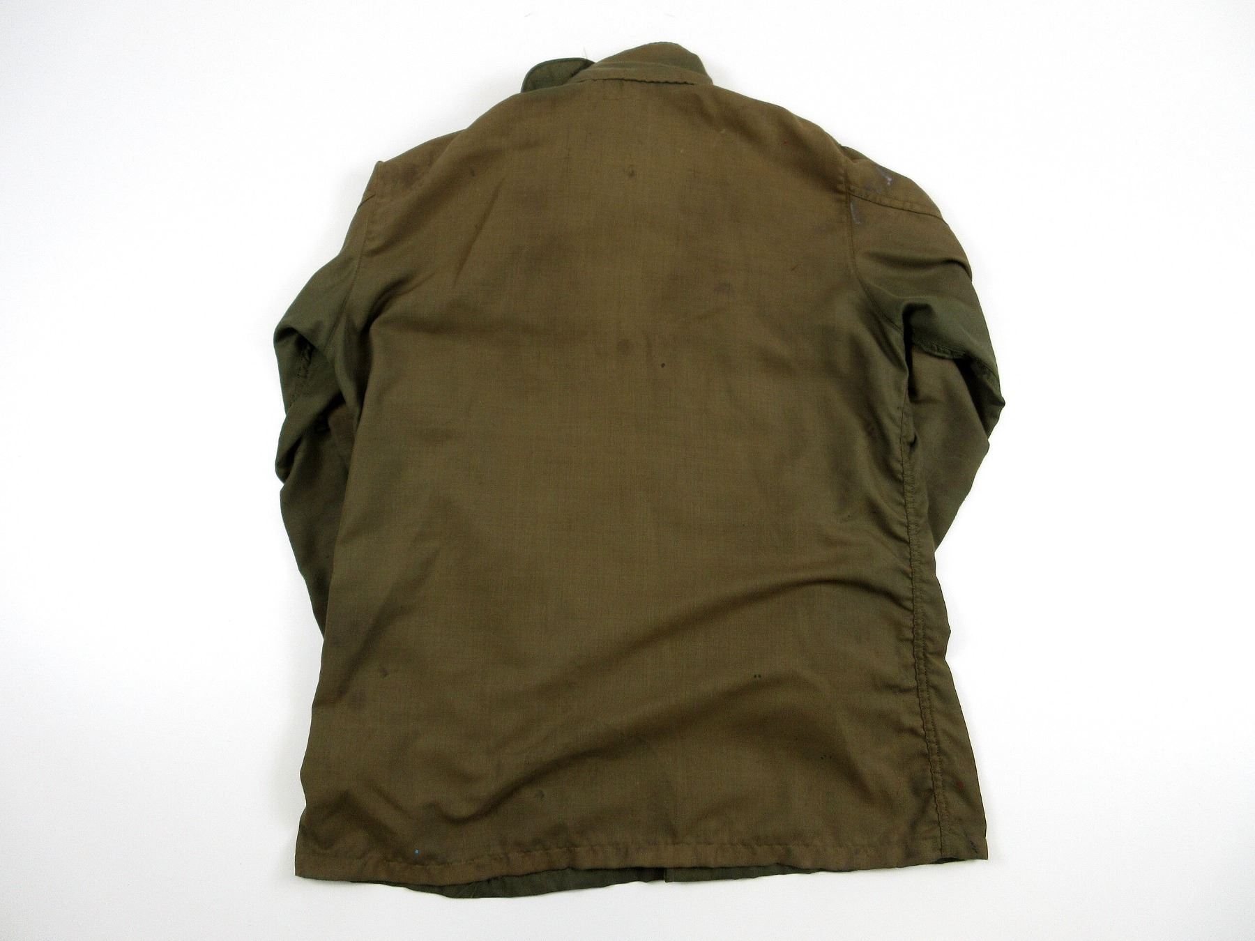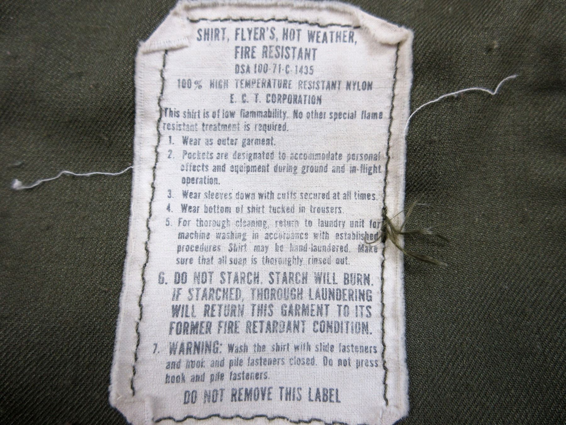 (1) GREEN NYLON HELICOPTER JACKET, SIZE MEDIUM-REGULAR, ZIPPERED-FRONT (WORKS), MARKED: "SHIRT, FLYER'S, HOT WEATHER, FIRE RESISTANT, DSA 100-71-C-1435" ETC., SHOWS AGE / WEAR / TEAR. SEE PHOTOS.
