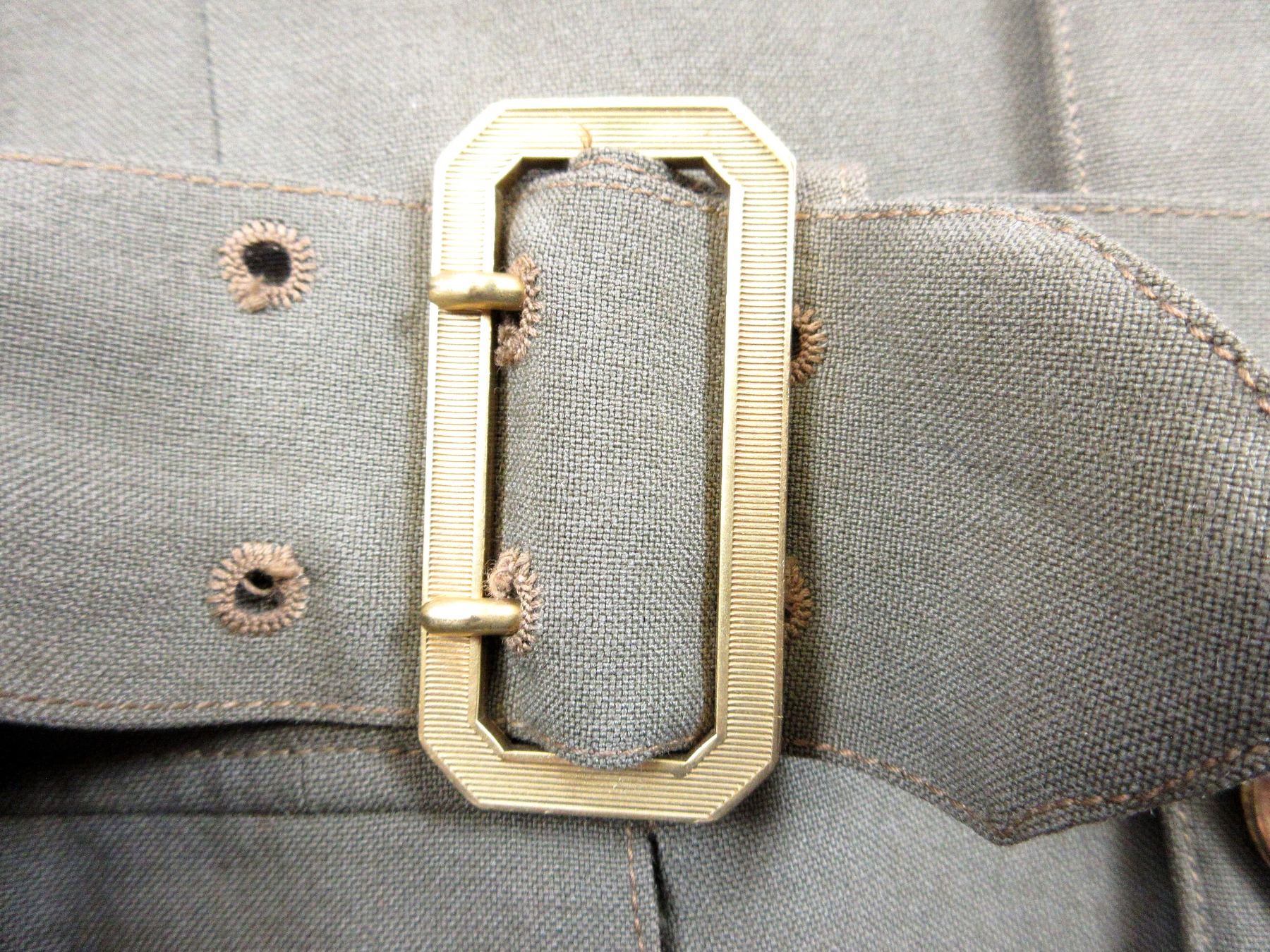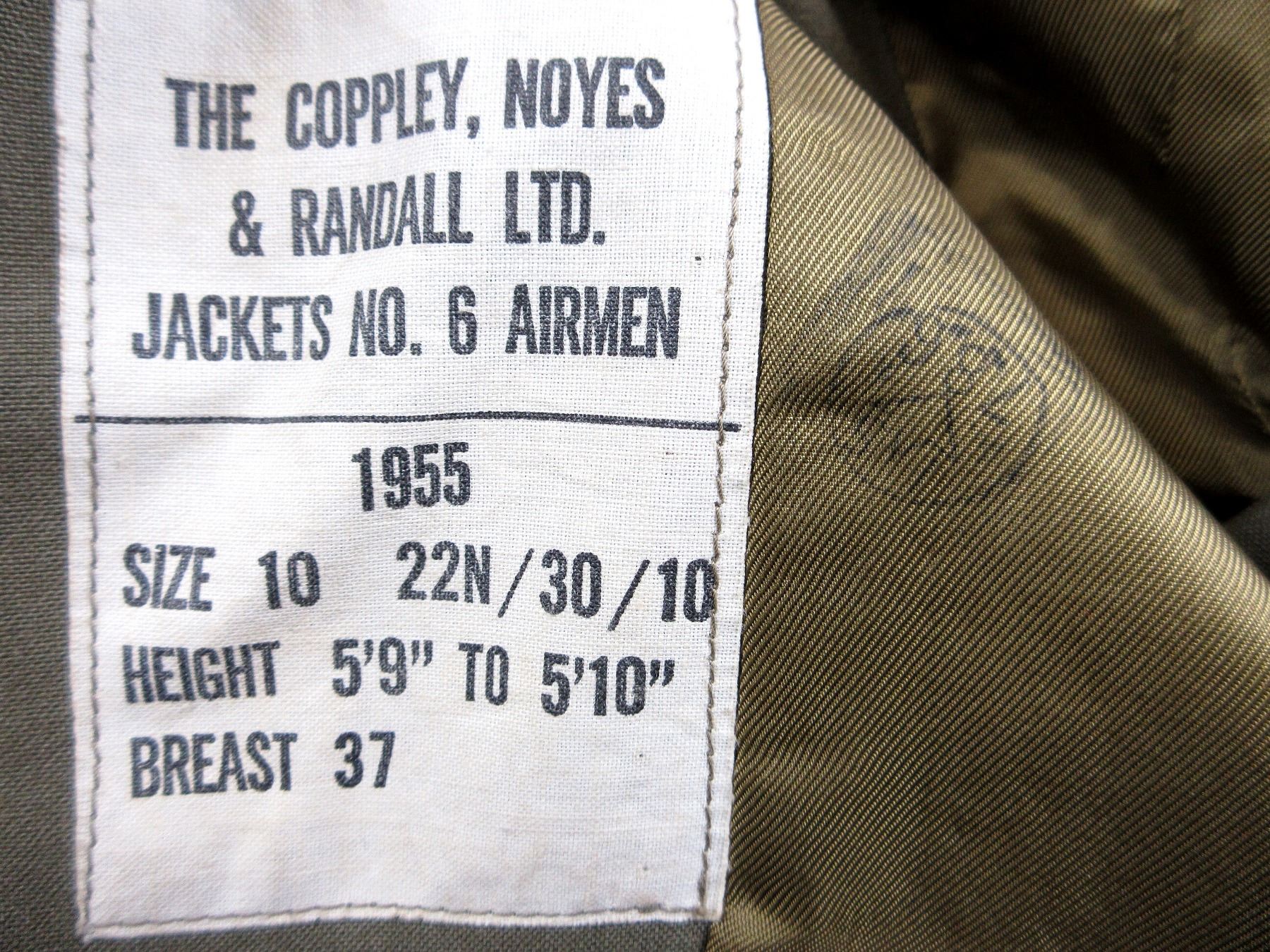 (1) KHAKI TUNIC, MARKED: "THE COPPLEY, NOYES & RANDALL LTD., JACKETS NO. 6 AIRMEN, 1955, SIZE 10 22N / 30/ 10, HEIGHT 5'9" TO 5'10", BREAST 37" WITH MAPLE LEAF PROOF MARK, CANADA WITH EAGLE SHOULDER BADGES, BRASS QUEEN'S CROWN RCAF BUTTONS, BUTTON FRONT, WITH WAIST BELT. SEE PHOTOS.