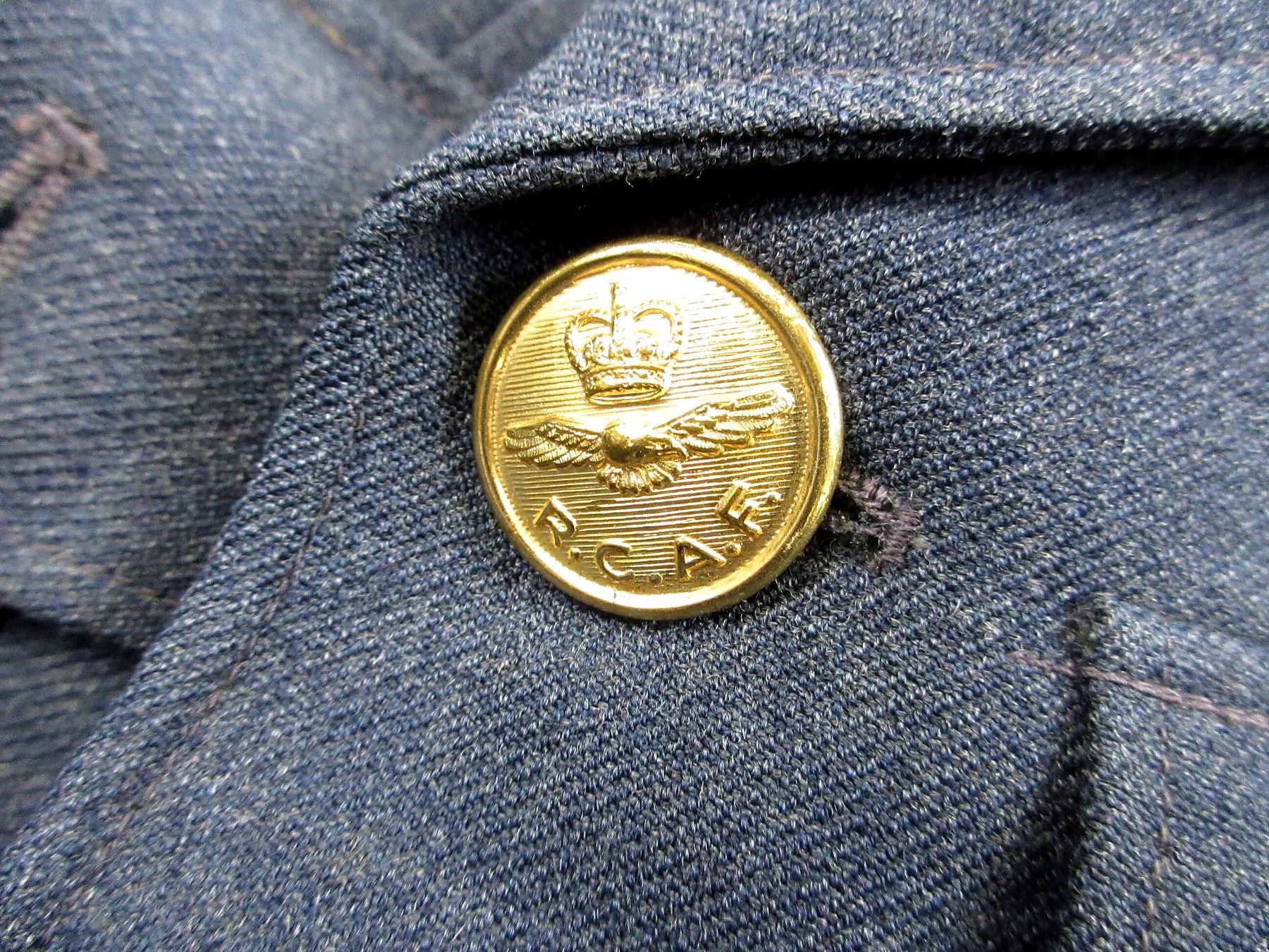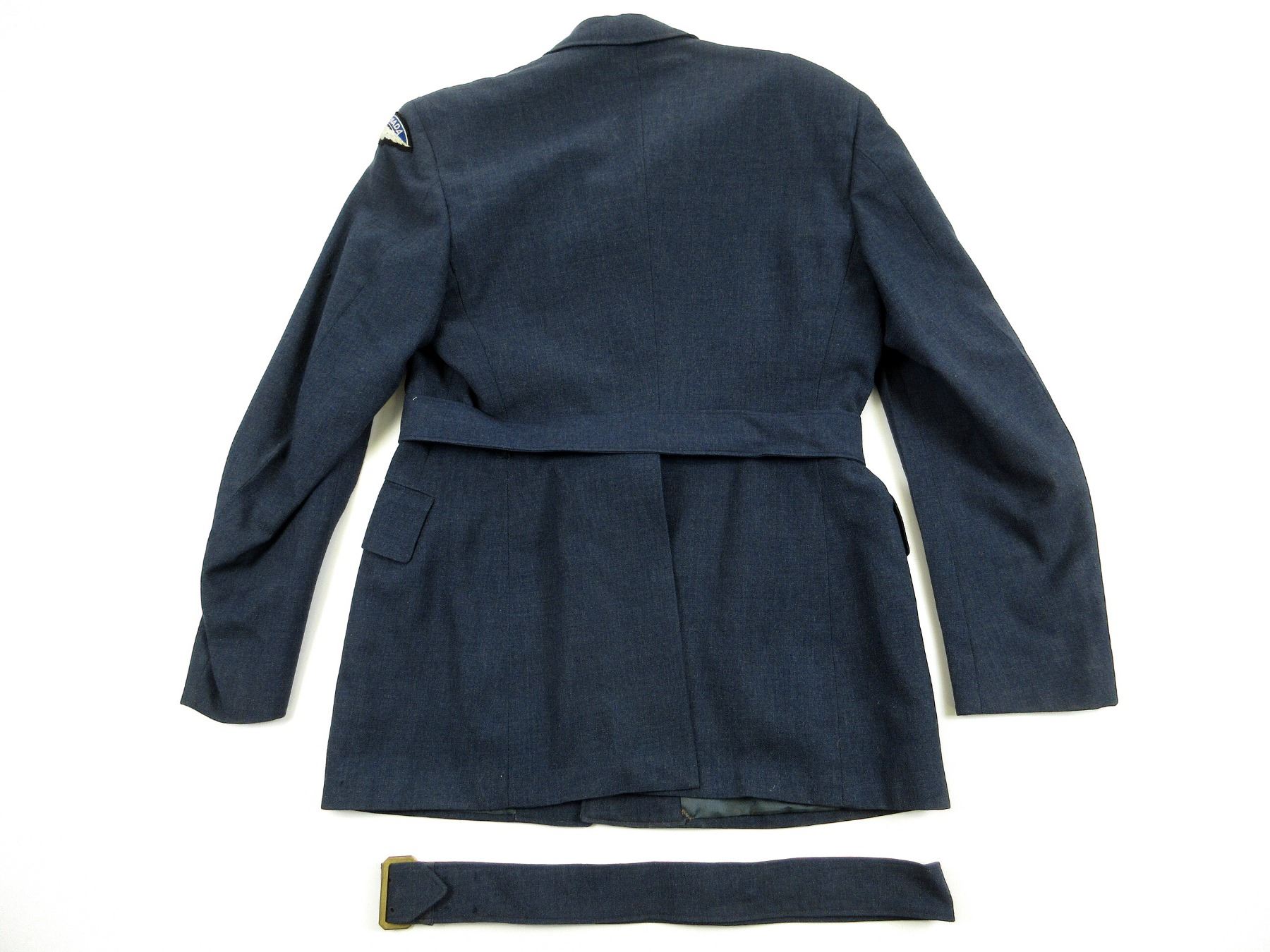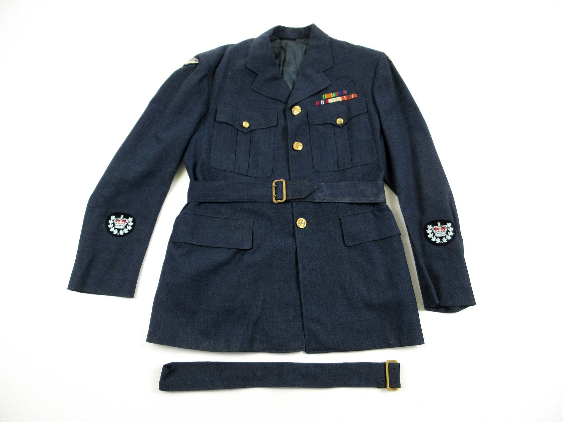 (1) BLUE DENIM STYLE RCAF TUNIC, MARKED: "THE FREEDMAN COMPANY LTD., JACKETS NO. 5 (AIRMEN), 1952, SIZE 12, HEIGHT 5'9" TO 5'10", BREAST 41", CANADA WITH EAGLE SHOULDER BADGES, MASTER WARRANT OFFICER SLEEVE BADGES, RIBBON BAR (DEFENCE MEDAL, CANADIAN VOLUNTARY SERVICE MEDAL, 1939-1945 WAR MEDAL, UN KOREA MEDAL, CANADIAN FORCES' DECORATION MEDAL WITH ROSET), BRASS QUEEN'S CROWN RCAF BUTTONS, BUTTON FRONT, WITH WAIST BELT. SEE PHOTOS.