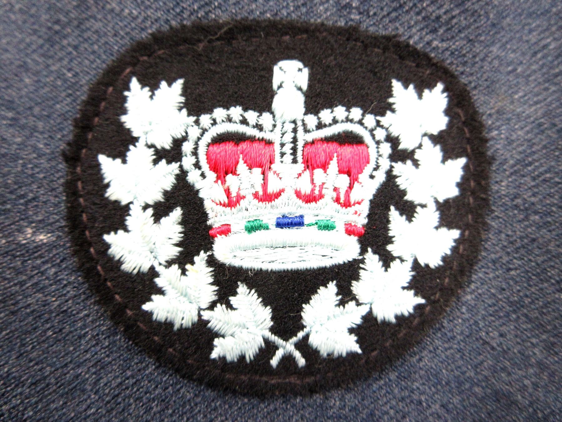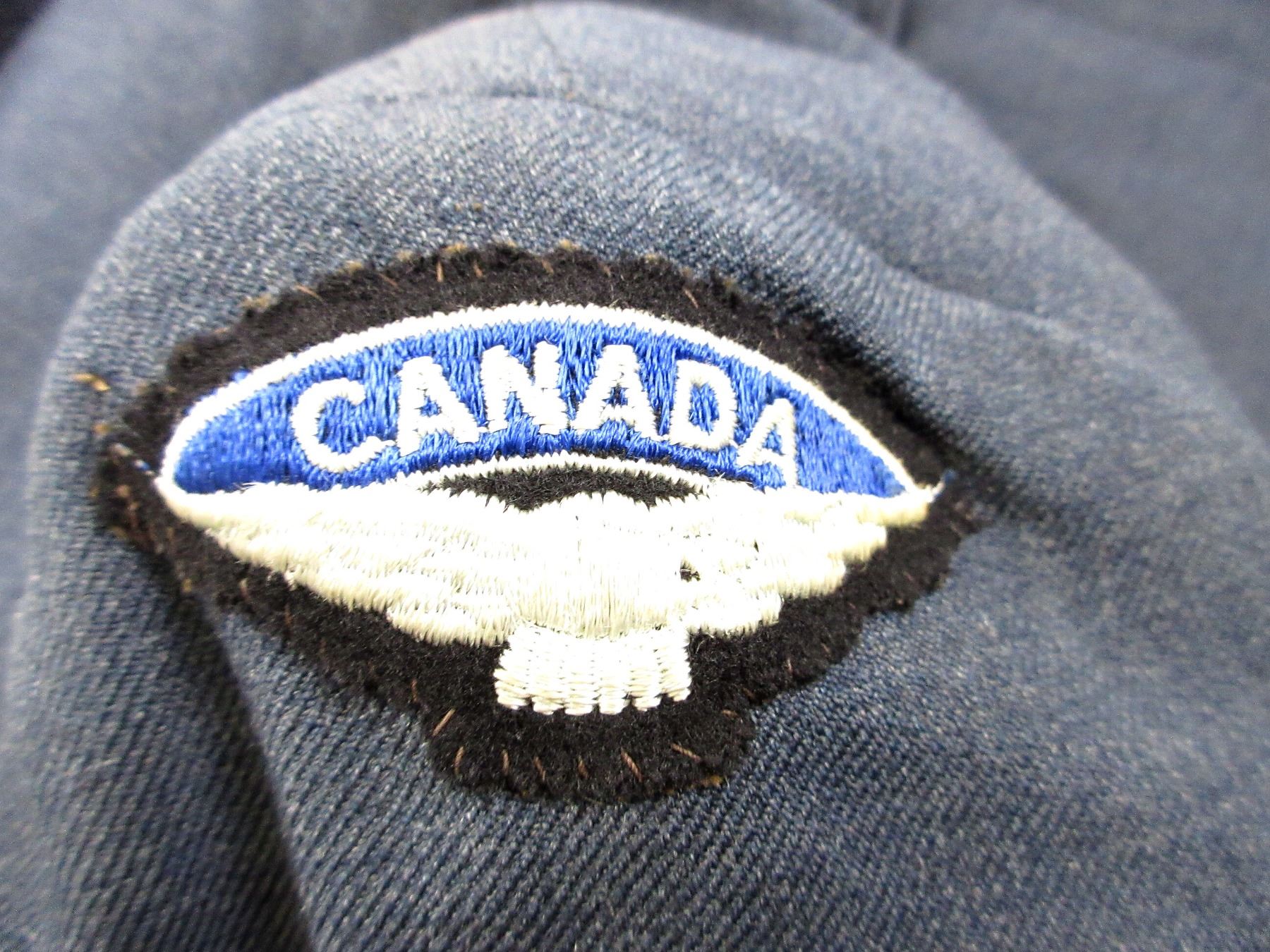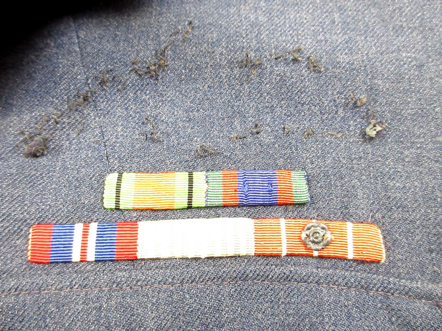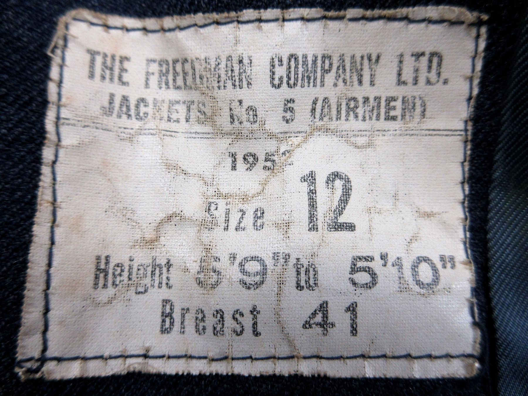 (1) BLUE DENIM STYLE RCAF TUNIC, MARKED: "THE FREEDMAN COMPANY LTD., JACKETS NO. 5 (AIRMEN), 1952, SIZE 12, HEIGHT 5'9" TO 5'10", BREAST 41", CANADA WITH EAGLE SHOULDER BADGES, MASTER WARRANT OFFICER SLEEVE BADGES, RIBBON BAR (DEFENCE MEDAL, CANADIAN VOLUNTARY SERVICE MEDAL, 1939-1945 WAR MEDAL, UN KOREA MEDAL, CANADIAN FORCES' DECORATION MEDAL WITH ROSET), BRASS QUEEN'S CROWN RCAF BUTTONS, BUTTON FRONT, WITH WAIST BELT. SEE PHOTOS.
