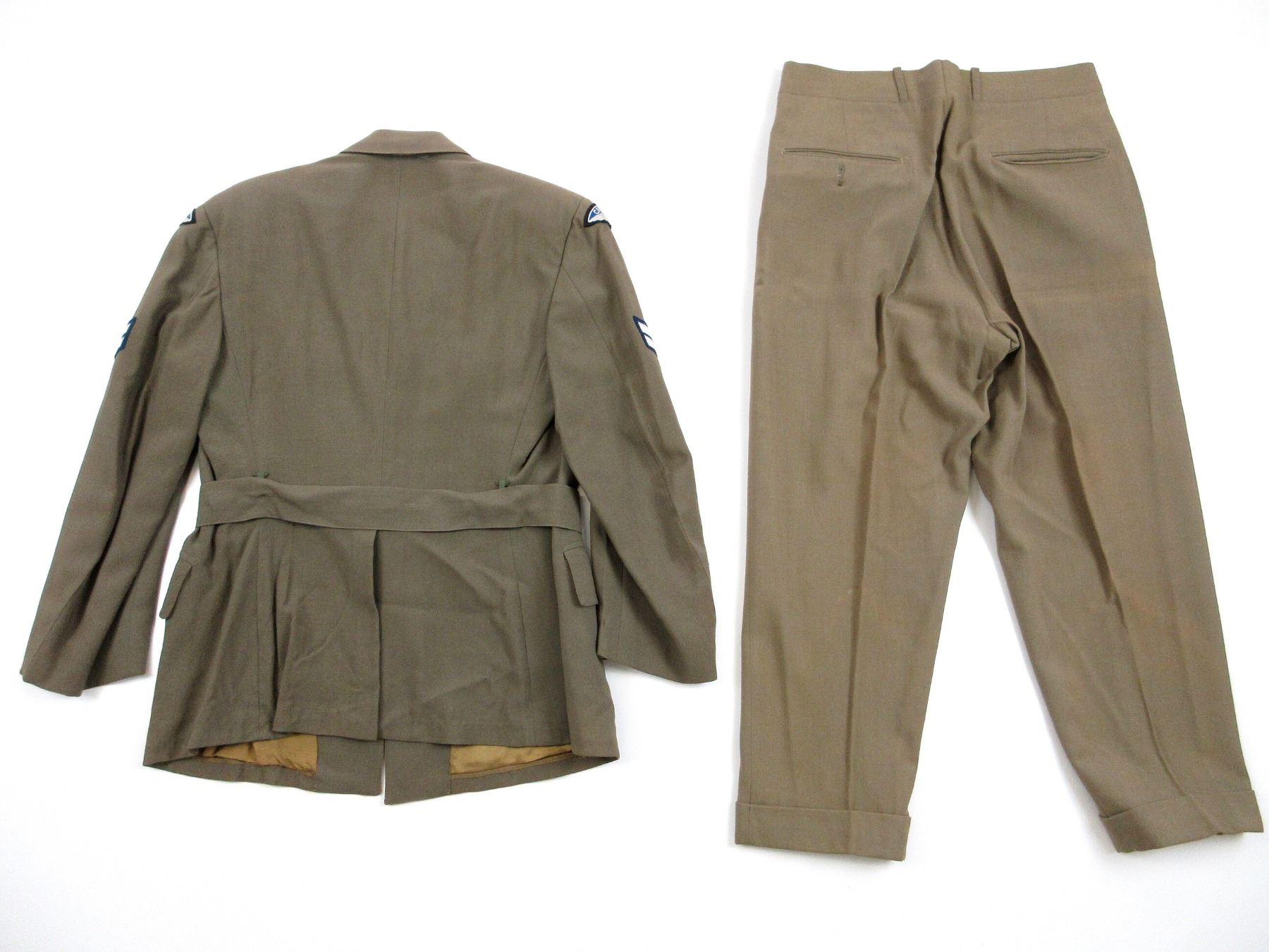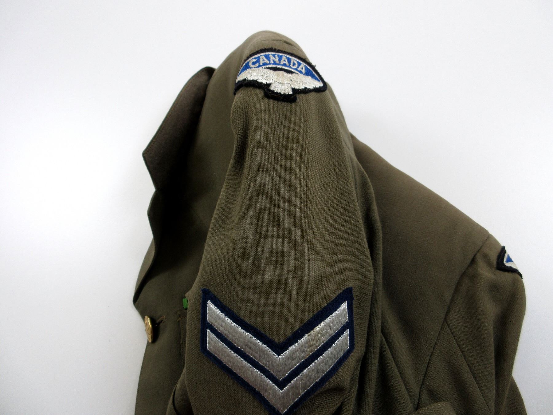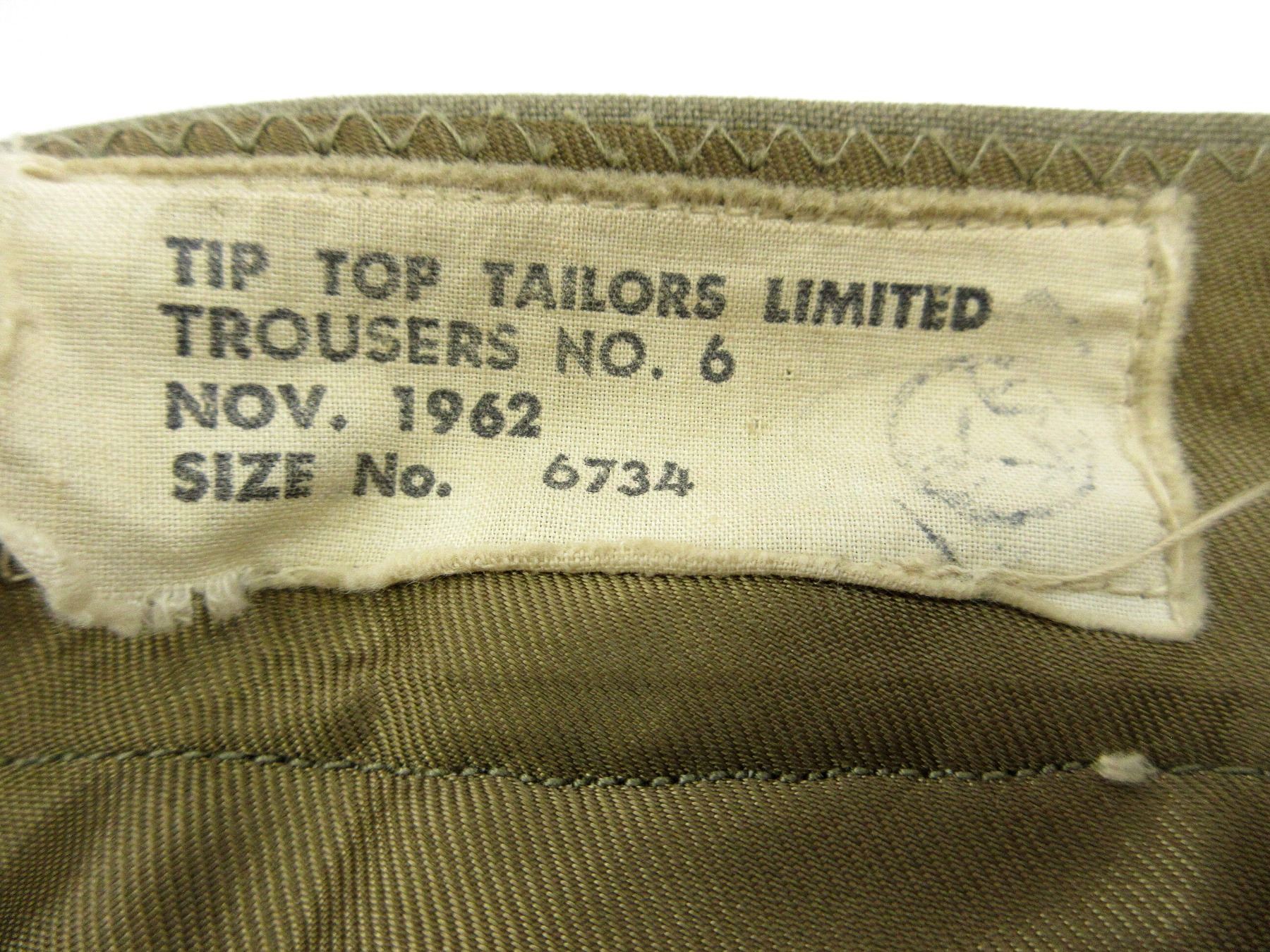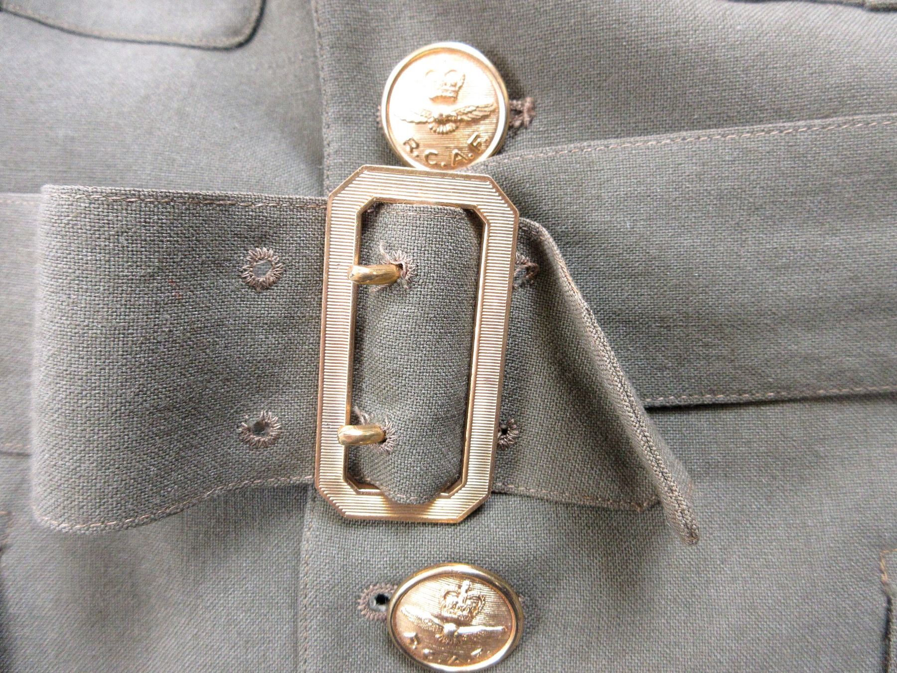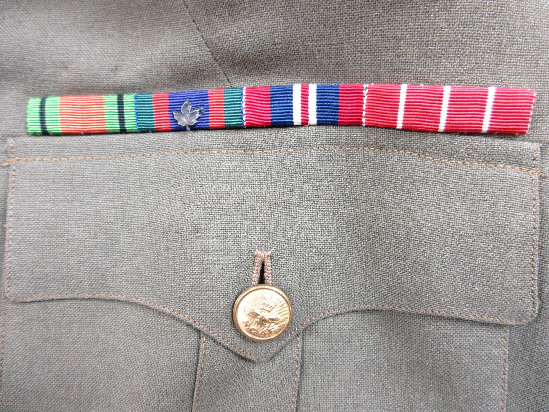 LOT INCLUDES; (1) KHAKI TUNIC, MARKED: "S & G CLOTHING CO. LTD., JACKETM KHAKI, S.D., 1952, SIZE 6, HEIGHT 5'5" TO 5'6", BREAST 39" WITH MAPLE LEAF PROOF MARK & VARIOUS OTHER MARKINGS, CANADA WITH EAGLE SHOULDER BADGES, CORPORAL RANK CHEVRONS, RIBBON BAR (DEFENCE MEDAL, CANADIAN VOLUNTARY SERVICE MEDAL, 1939-1945 WAR MEDAL, CANADIAN FORCES' DECORATION MEDAL), BRASS QUEEN'S CROWN RCAF BUTTONS, BUTTON FRONT, WITH WAIST BELT & (1) PAIR OF KHAKI PANTS, MARKED: "TIP TOP TAILORS LIMITED, TROUSERS NO. 6, NOV. 1962, SIZE NO. 6734", WITH MAPLE LEAF PROOF MARK, ZIPPER-FLY (WORKS), WAIST APPROX. 34". SEE PHOTOS.