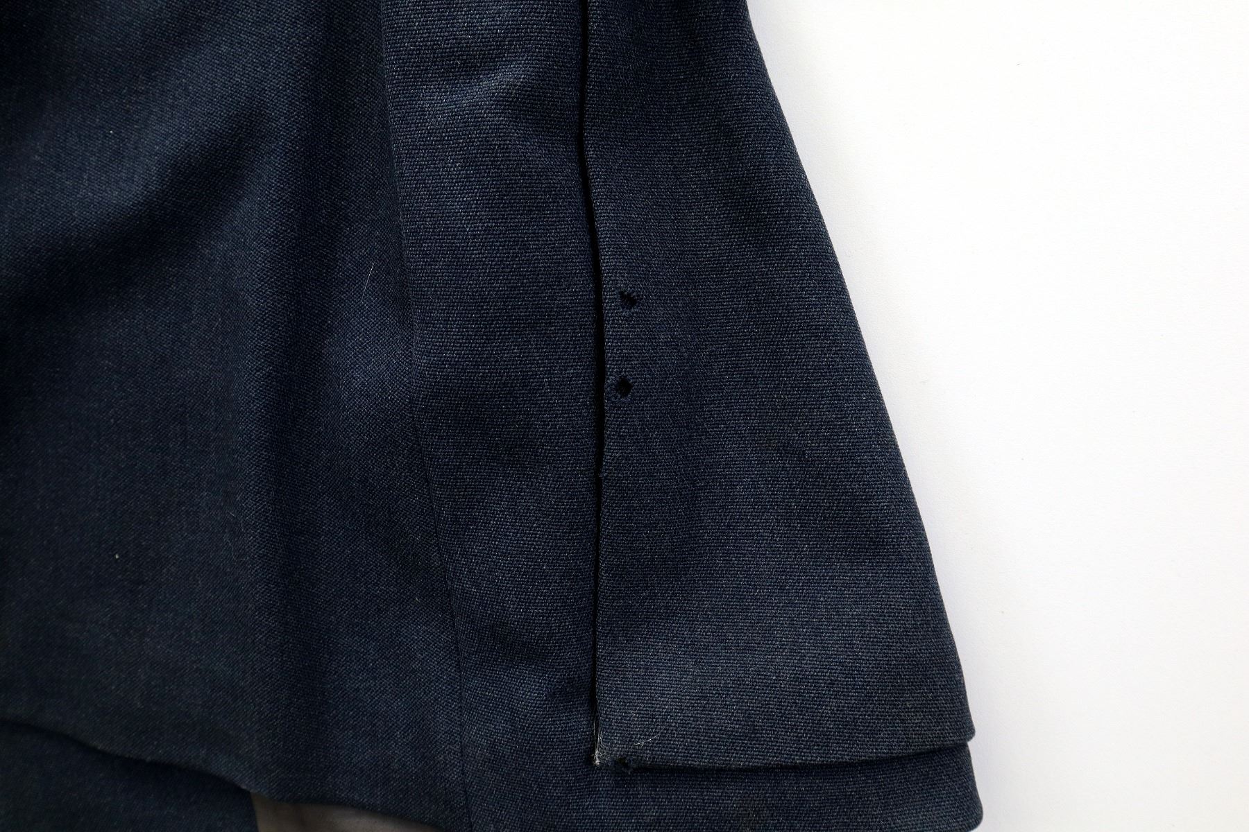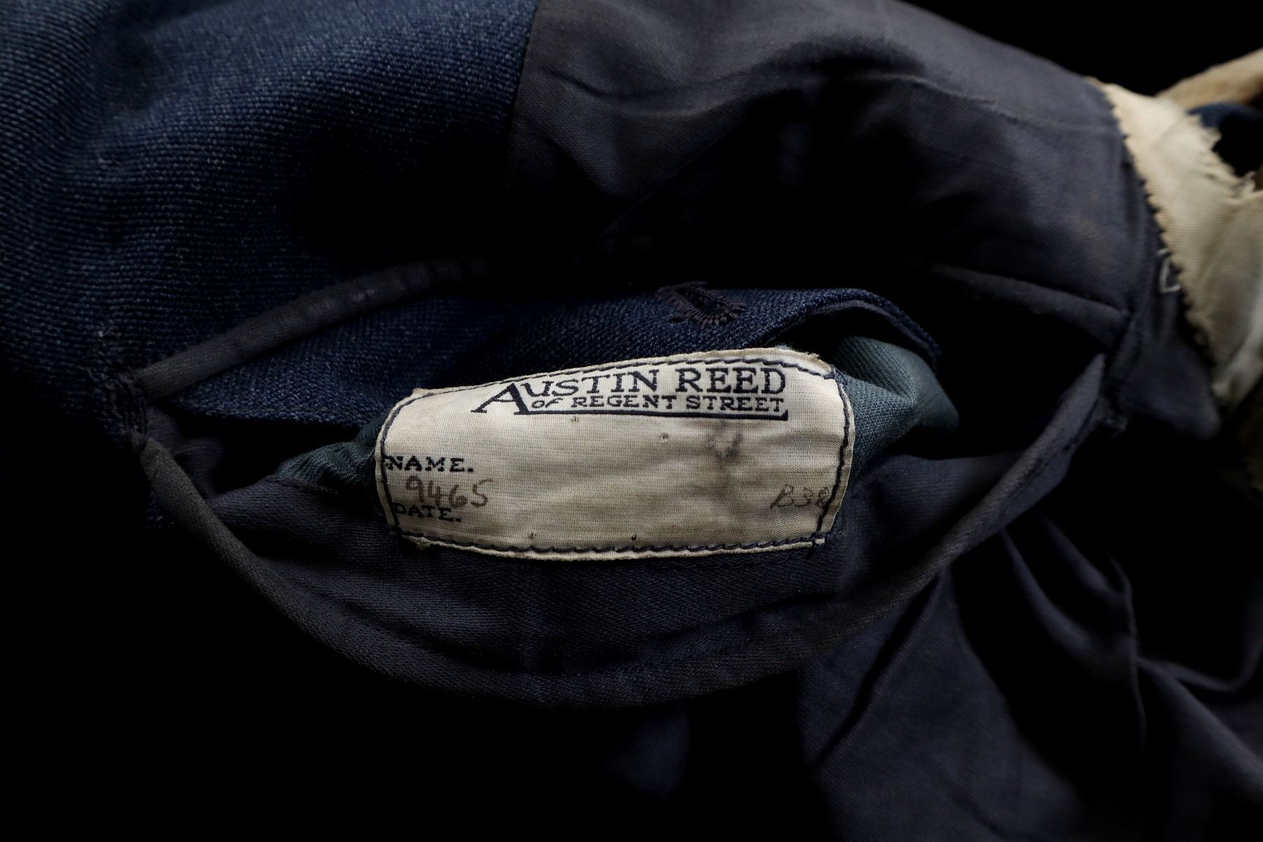 (1) BLUE DENIM STYLE RCAF TUNIC, MARKED: "AUSTIN REED OF REGENT STREET, 9465, B38", CANADA SHOULDER BADGES, FLIGHT LIEUTENANT / CAPTAIN RANK, BRASS KING'S CROWN BUTTONS, BUTTON FRONT, WITH WAIST BELT, SOME WEAR / TEAR, SHOULDER WIDTH APPROX. 17". SEE PHOTOS.