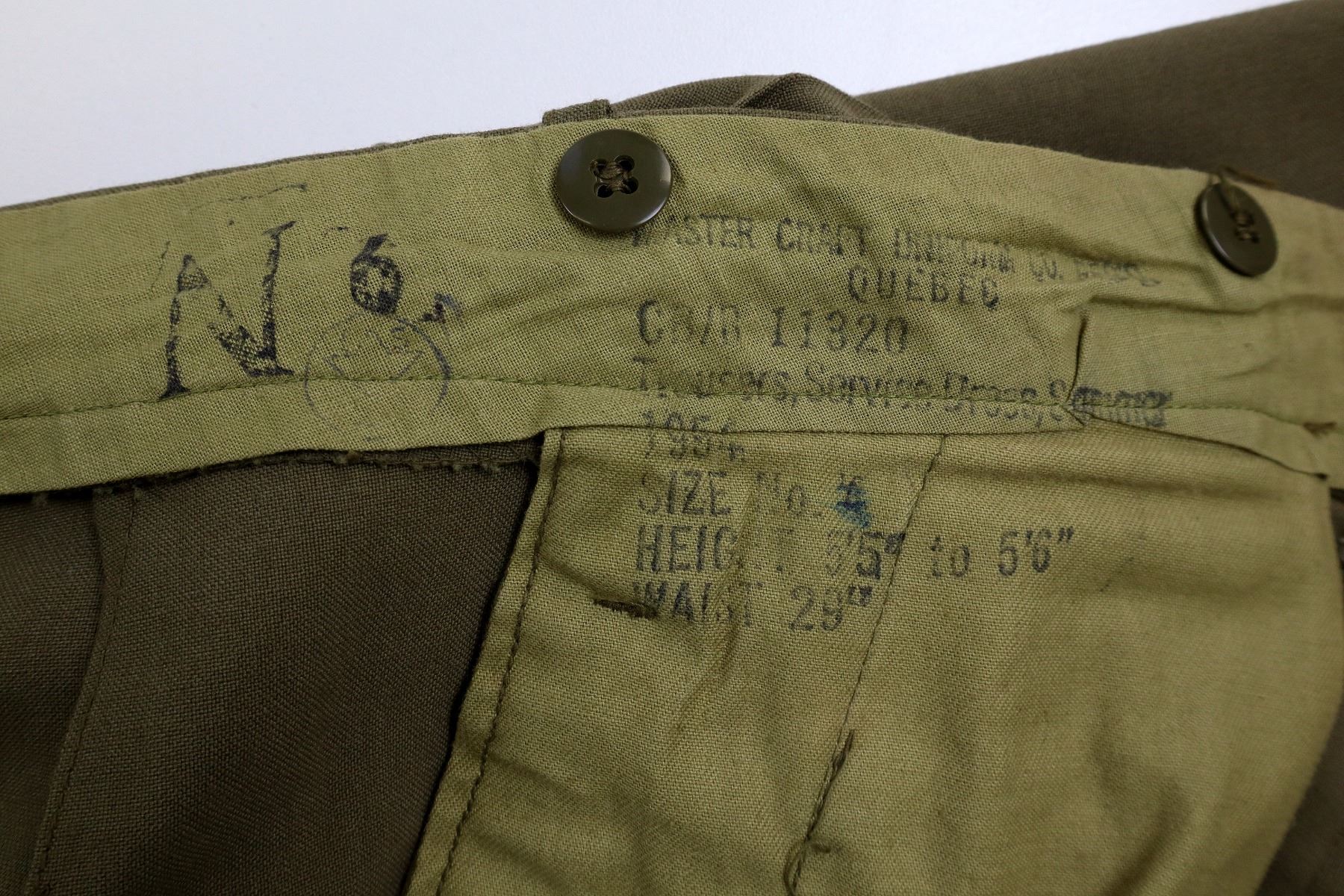 LOT INCLUDES; (1) KHAKI TUNIC, MARKED: "THE COPPLEY, NOYES & RANDALL LTD., COATS, SERVICE DRESS, KHAKI, SUMMER, 1954, 1956, SIZE N10, HEIGHT 67.4" TO 69.6", BREAST 35-36" WITH MAPLE LEAF PROOF MARK, RCOC BRASS SHOULDER BUTTONS / BADGES, MOBILE COMMAND SHOULDER BADGES, RED / BLUE PISTOL LANYARD, BRASS RCOC COLLAR BADGES / BUTTONS, BUTTON FRONT, (1) KHAKI LONG-SLEEVED SHIRT, VARIOUS FAINT / UN-CLEAR MARKINGS, BUTTON FRONT, (1) GREEN CANVAS ARMLET WITH RCOC BADGE, MOBILE COMMAND BADGE, CORPORAL RANK CHEVRON, VARIOUS MARKINGS ON BACK, (1) GREEN CLOTH TIE & (1) KHAKI PAIR OF PANTS, MARKED: "N6, MASTER CRAFT UNIFORM CO. REG'D., QUEBEC, CB/B 11320, TROUSERS, SERVICE DRESS, SUMMER, 1954, SIZE NO. ?, HEIGHT 5'5" TO 5'6", WAIST 29" ", WITH MAPLE LEAF PROOF MARK, ZIPPERED-FLY (WORKS). SEE PHOTOS.