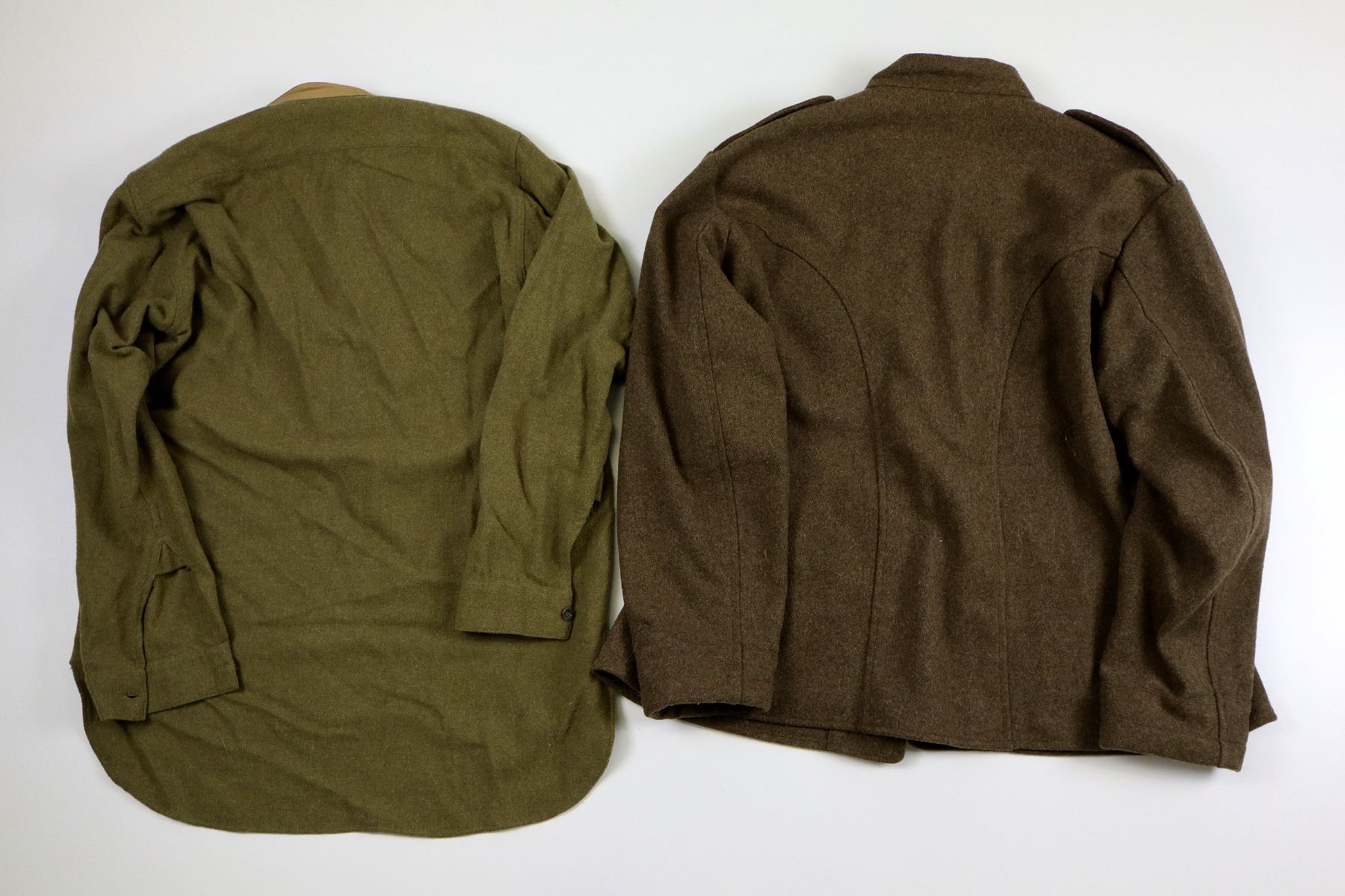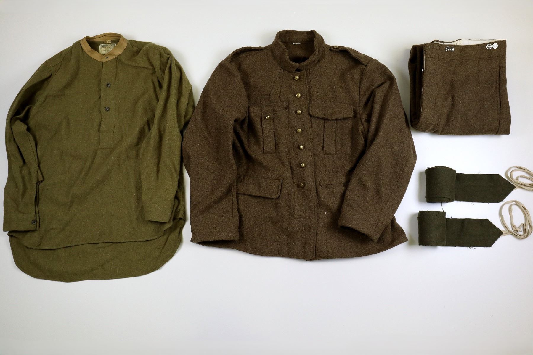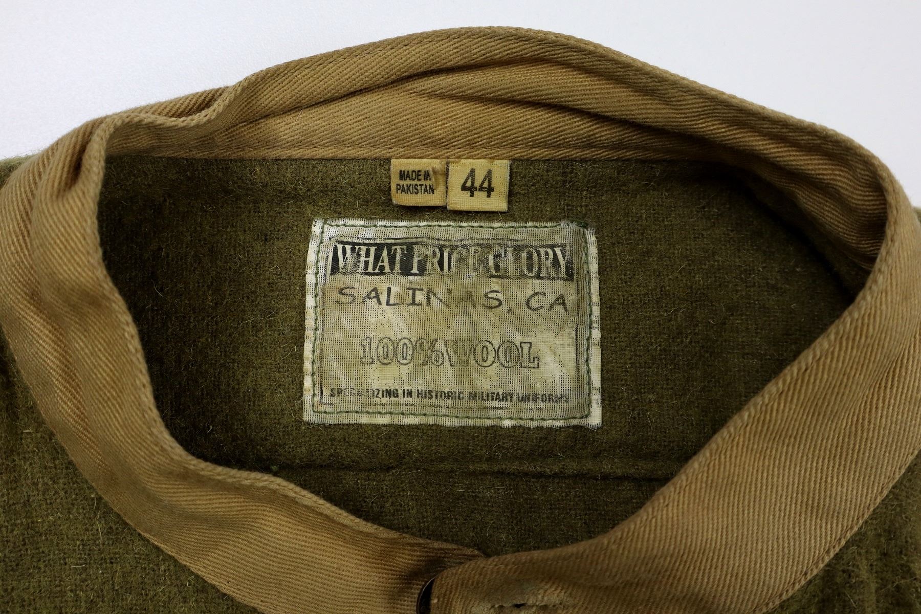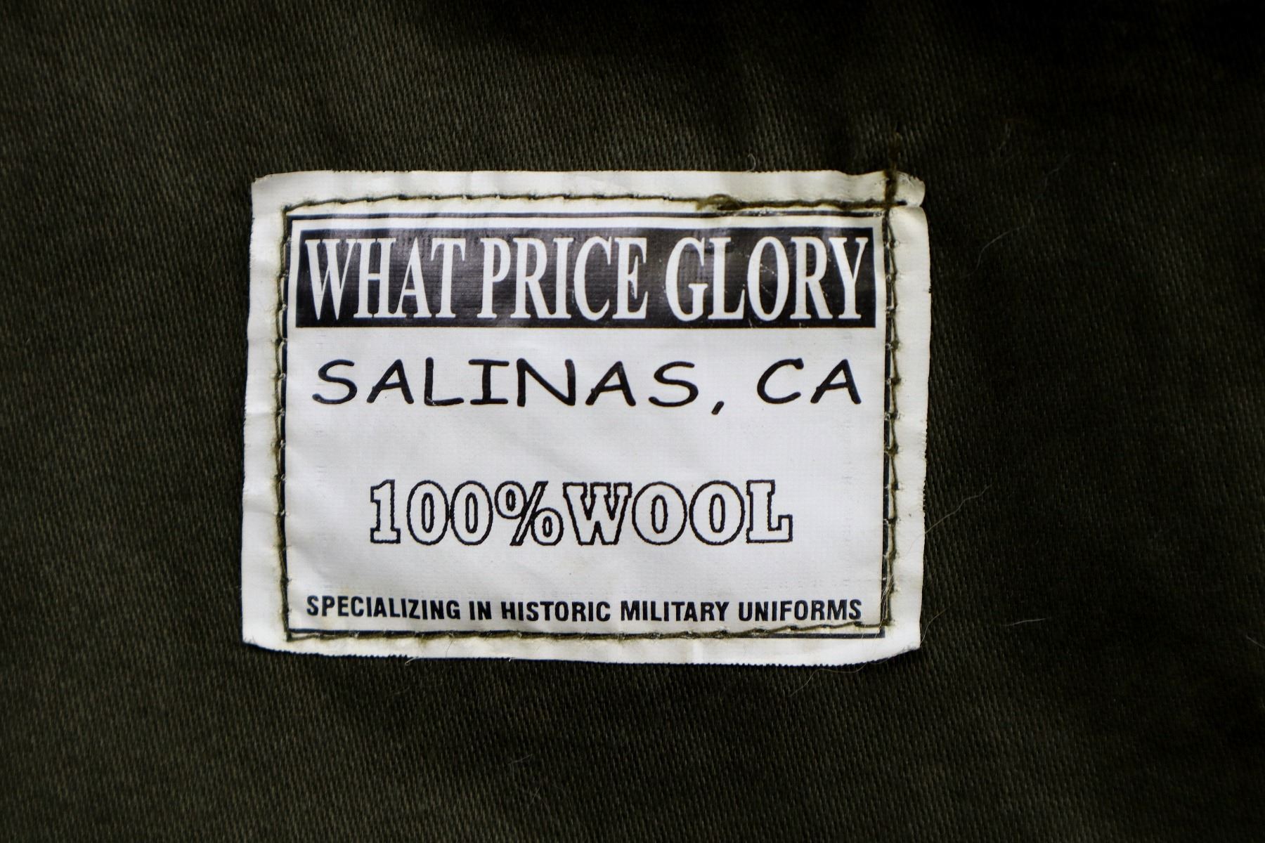 LOT INCLUDES; (1) TAN WOOL TUNIC, MARKED: "WHAT PRICE GLORY, SALINAS, CA, 100% WOOL, SPECIALIZING IN HISTORIC MILITARY UNIFORMS", "46" & "MADE IN PAKISTAN", SIZE 46, CLOSED COLLAR, BUTTON FRONT, BRASS KING'S CROWN CANADA BUTTONS, (1) GREEN WOOL LONG-SLEEVED SHIRT, MARKED: "WHAT PRICE GLORY, SALINAS, CA, 100% WOOL, SPECIALIZING IN HISTORIC MILITARY UNIFORMS", "44" & "MADE IN PAKISTAN", SIZE 44, CLOSED COLLAR, BUTTON FRONT, (1) TAN WOOL PAIR OF PANTS, MARKED: "WHAT PRICE GLORY, SALINAS, CA, 100% WOOL, SPECIALIZING IN HISTORIC MILITARY UNIFORMS", "44" & "MADE IN PAKISTAN", SIZE 44, BUTTON-FLY & (1) PAIR OF GREEN WOOL PUTTEES, NO VISIBLE MARKINGS, APPROX. 4" WIDTH. SEE PHOTOS.