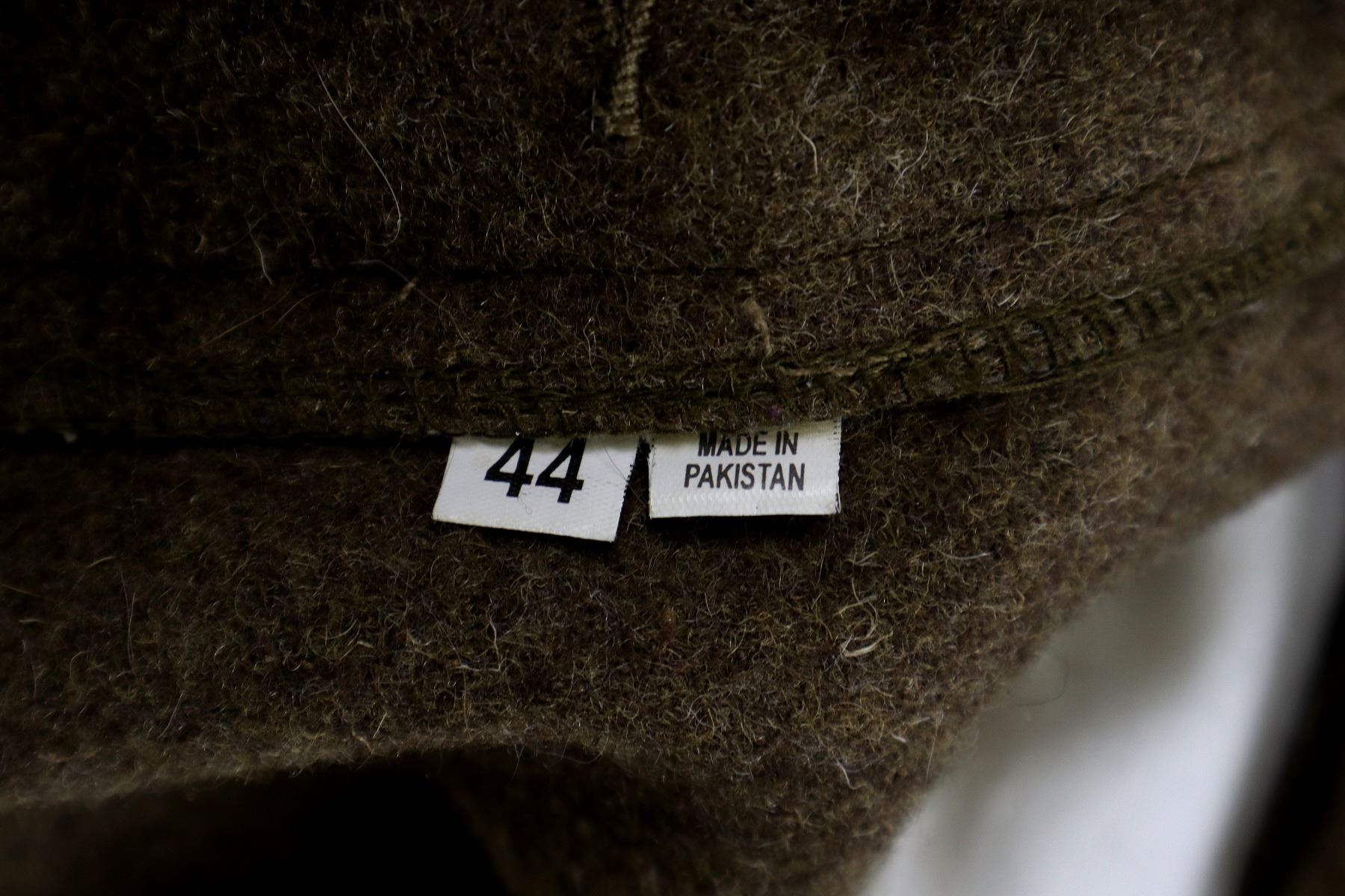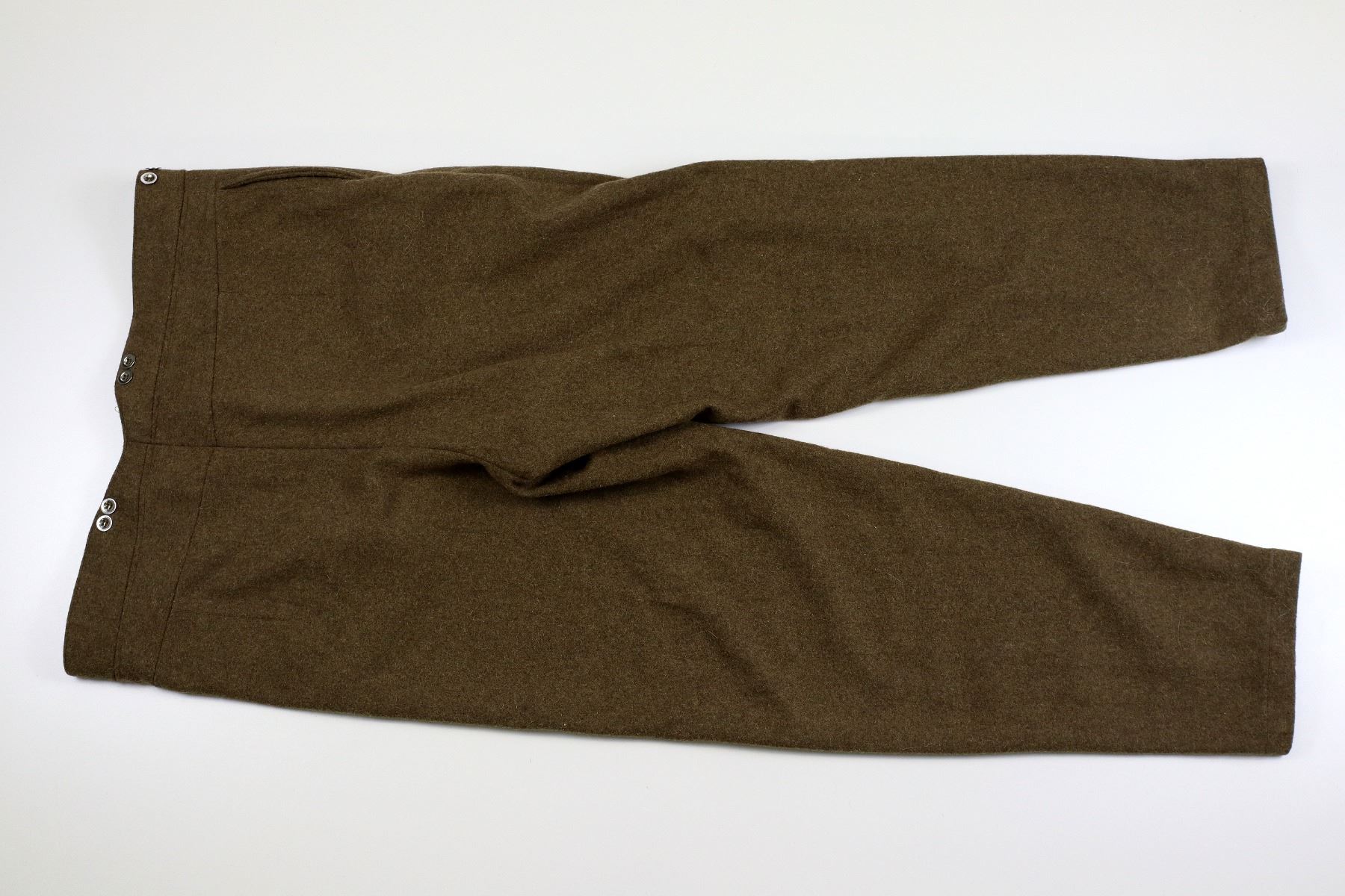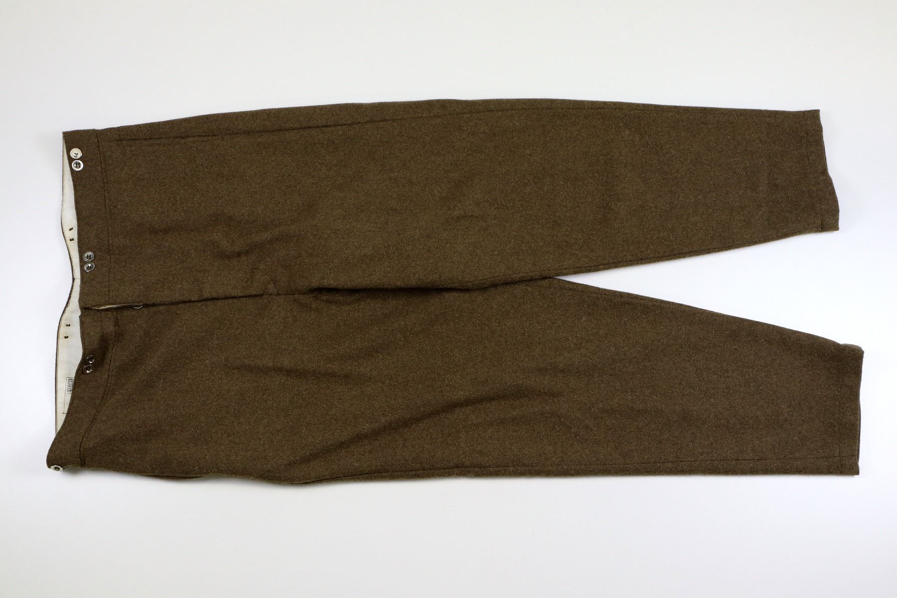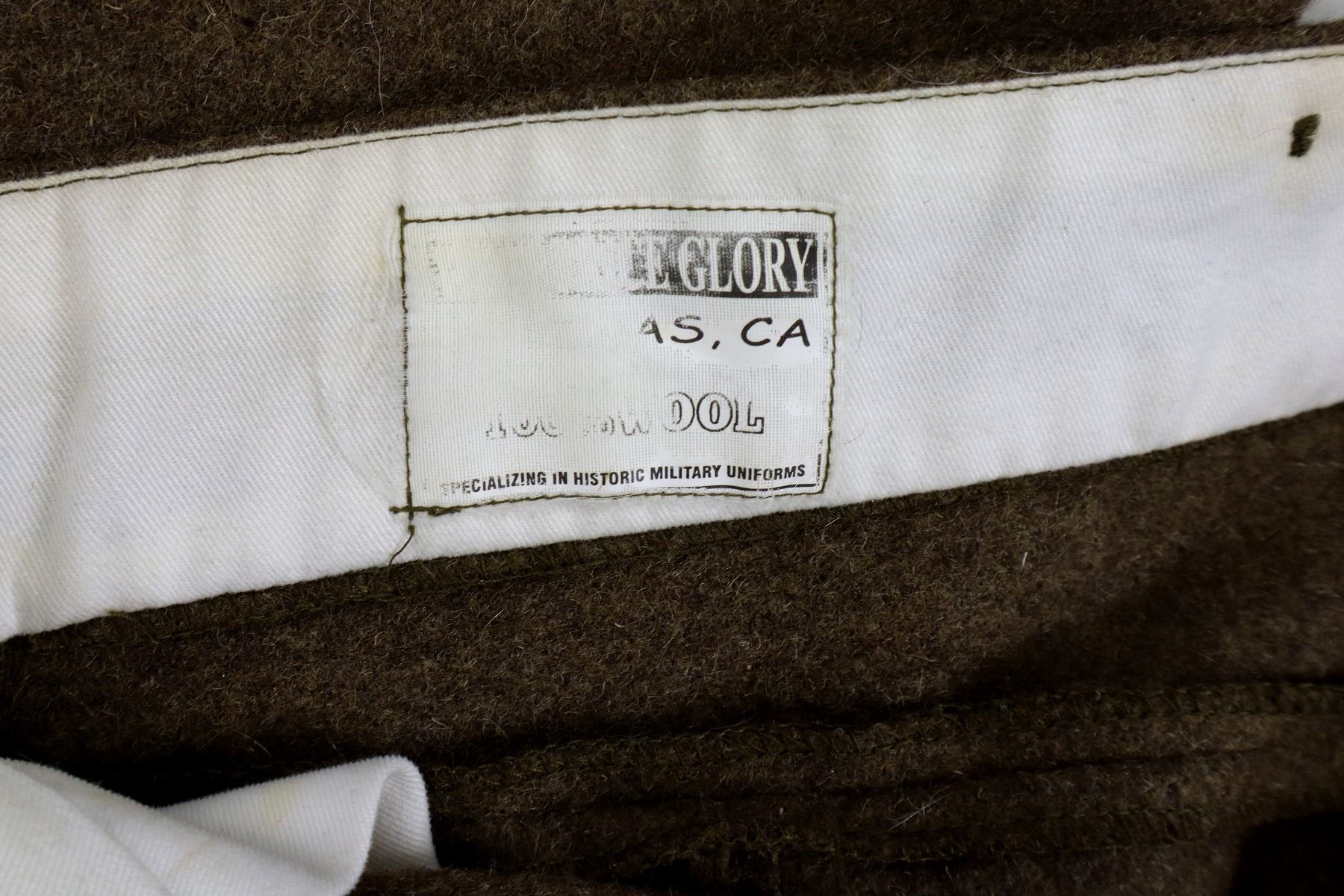 LOT INCLUDES; (1) TAN WOOL TUNIC, MARKED: "WHAT PRICE GLORY, SALINAS, CA, 100% WOOL, SPECIALIZING IN HISTORIC MILITARY UNIFORMS", "46" & "MADE IN PAKISTAN", SIZE 46, CLOSED COLLAR, BUTTON FRONT, BRASS KING'S CROWN CANADA BUTTONS, (1) GREEN WOOL LONG-SLEEVED SHIRT, MARKED: "WHAT PRICE GLORY, SALINAS, CA, 100% WOOL, SPECIALIZING IN HISTORIC MILITARY UNIFORMS", "44" & "MADE IN PAKISTAN", SIZE 44, CLOSED COLLAR, BUTTON FRONT, (1) TAN WOOL PAIR OF PANTS, MARKED: "WHAT PRICE GLORY, SALINAS, CA, 100% WOOL, SPECIALIZING IN HISTORIC MILITARY UNIFORMS", "44" & "MADE IN PAKISTAN", SIZE 44, BUTTON-FLY & (1) PAIR OF GREEN WOOL PUTTEES, NO VISIBLE MARKINGS, APPROX. 4" WIDTH. SEE PHOTOS.