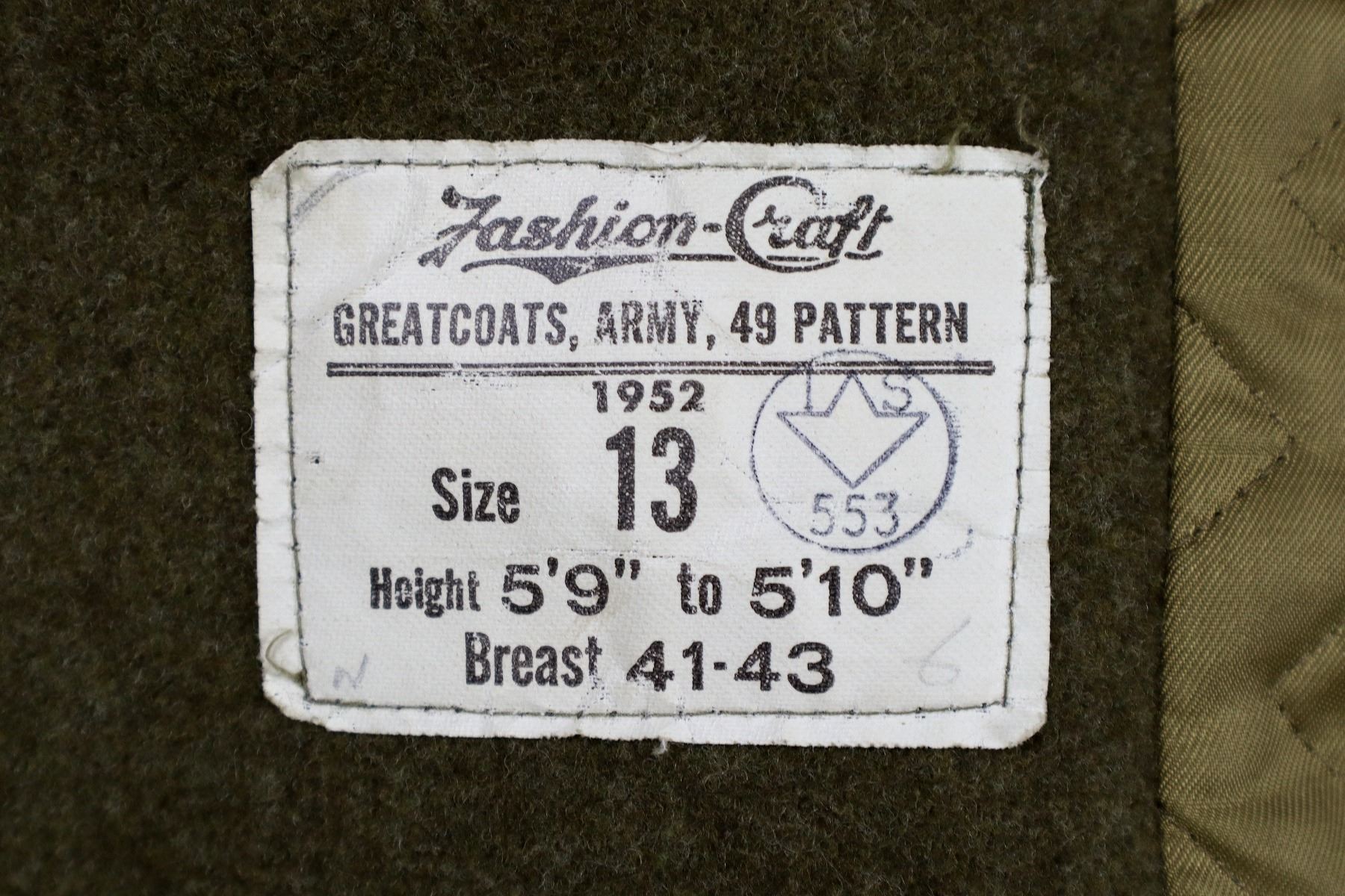 (1) GREEN WOOL GREAT COAT, MARKED: "FASHION-CRAFT, GREATCOATS, ARMY, 49 PATTERN, 1952, SIZE 13, HEIGHT 5'9" TO 5'10", BREAST 41-43" WITH MAPLE LEAF PROOF MARK, DOUBLE-BREASTED, BRASS KING'S CROWN CANADA BUTTONS, BUTTON FRONT. SEE PHOTOS.