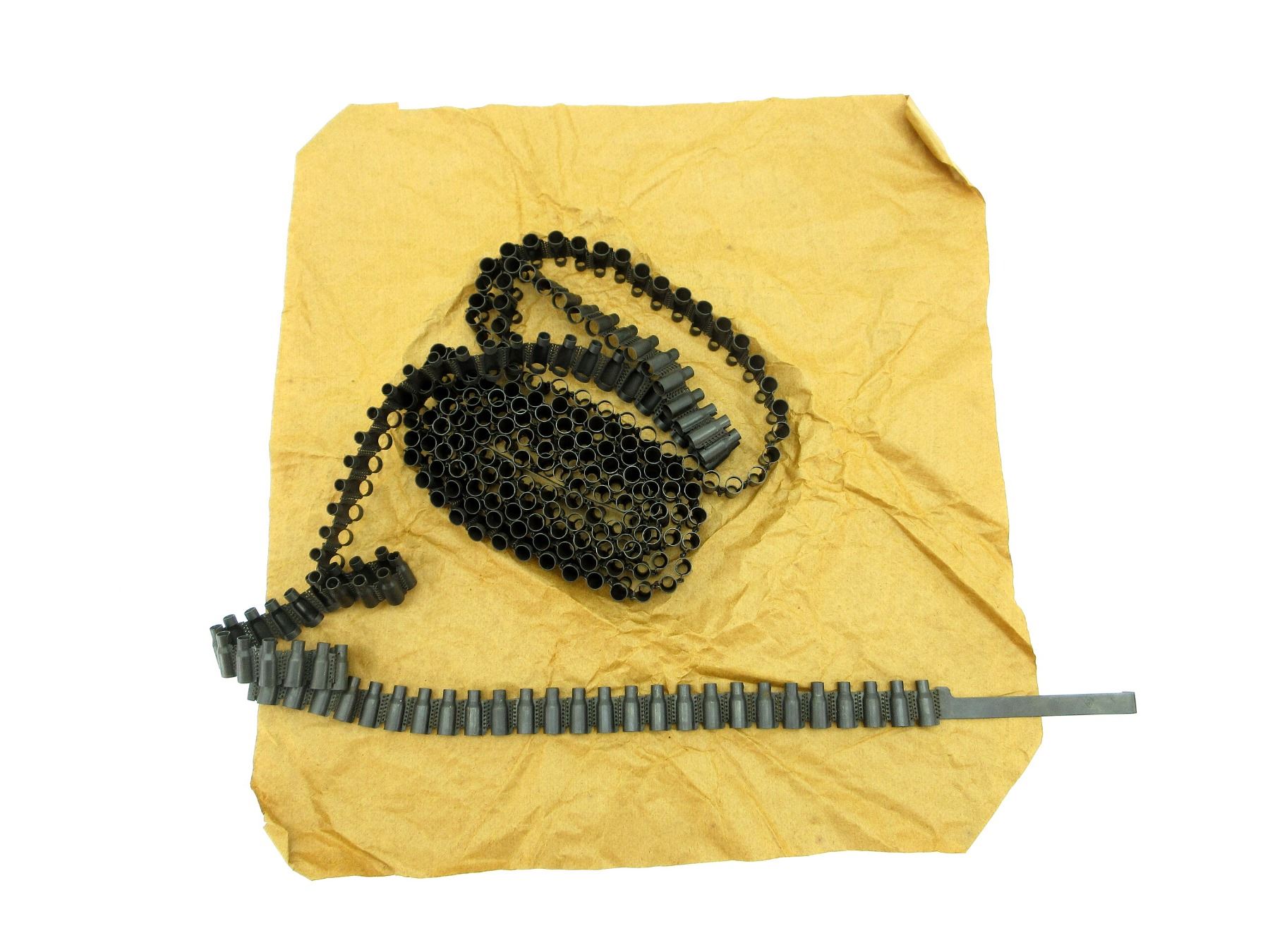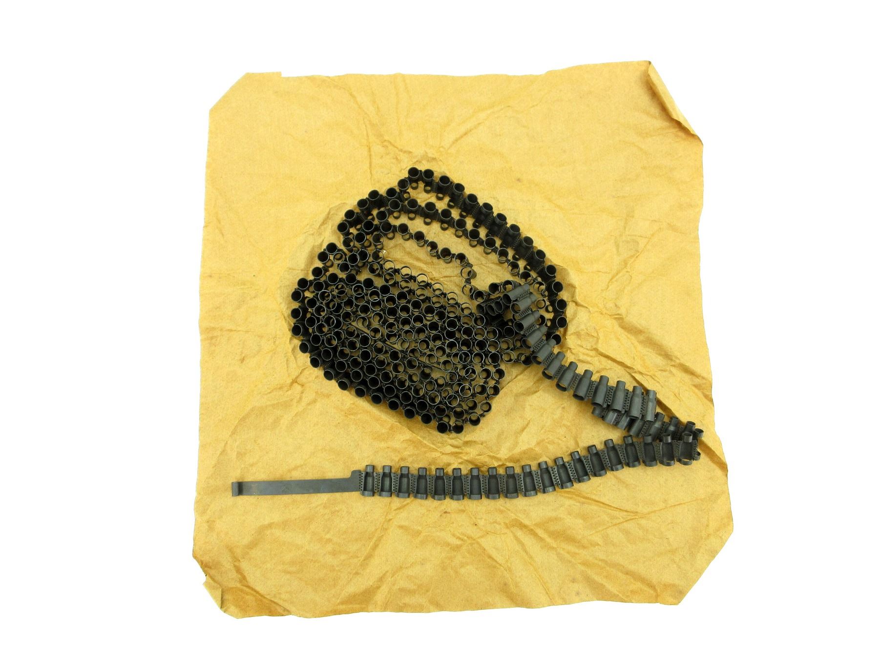 (1) MAXIM MG BELT, 7.62x54R, 250 ROUND. STEEL WITH STARTER TABS WITH VARIOUS PROOF MARKS. ORIGINAL PAPER WRAP. SEE PHOTOS.