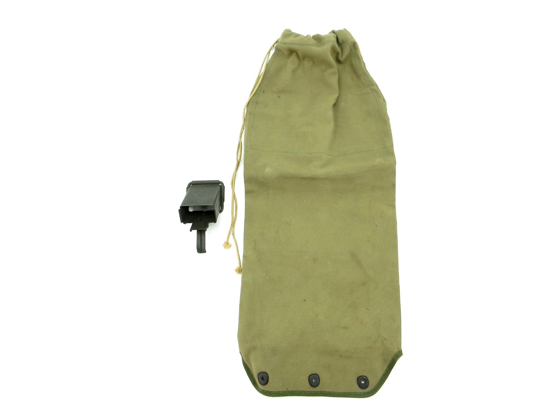 LOT INCLUDES: (1) STEEL .50 CAL. M2 LINK CHUTE, NO VISIBLE MARKINGS & (1) TAN CANVAS LINK BAG, SNAP CLOSURE & TIE-UP, MARKED: BAG, METALLIC BELT LINK D34338", APPROX. 24" X 11". SEE PHOTOS.