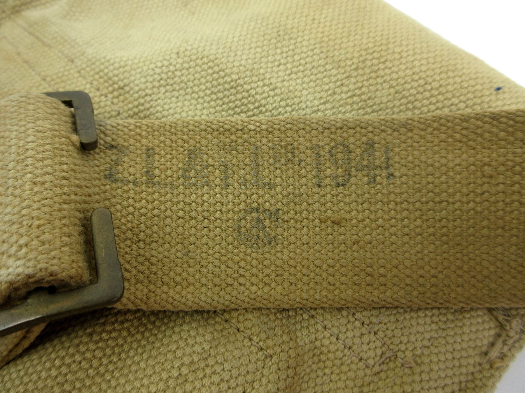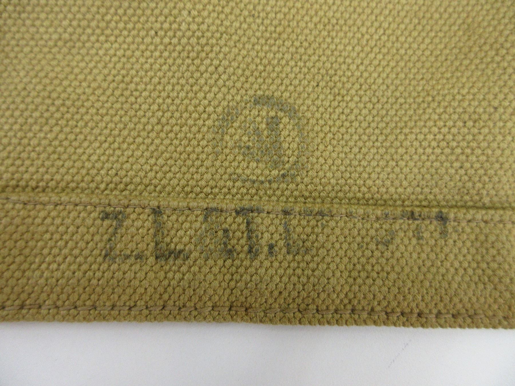 (1) TAN CANVAS FOOD CANNISTER BACKPACK, MARKED: "ZL&T.L", C BROAD ARROW MARKING, VARIOUS FAINT / UN-CLEAR MARKINGS, BRASS BUCKLES, APPROX. DIA. 8", APPROX. OAL 14.5". SEE PHOTOS.