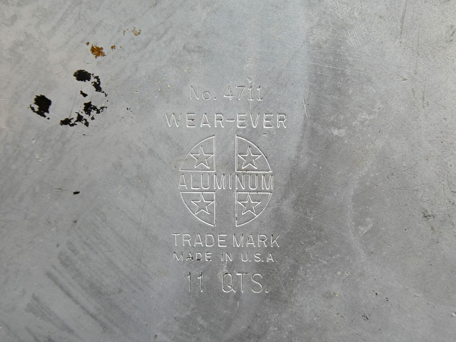 (1) MILITARY STYLE KETTLE, ALUMINUM, BLACK PAINTED WOODEN HANDLE, MARKED: "NO. 4711 WEAR-EVER, TRADE MARK MADE IN U.S.A, 11 QTS", APPROX. DIA. 11", APPROX. OAH 13". SEE PHOTOS.