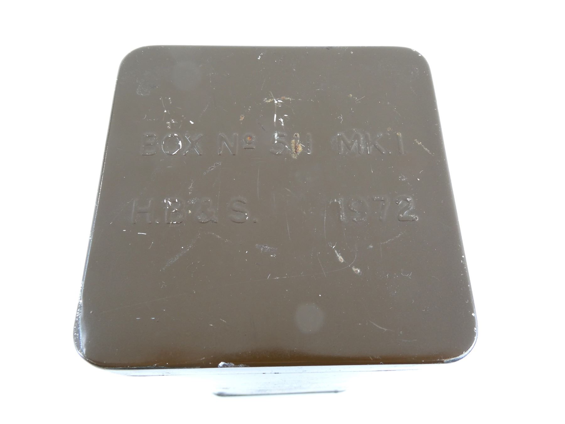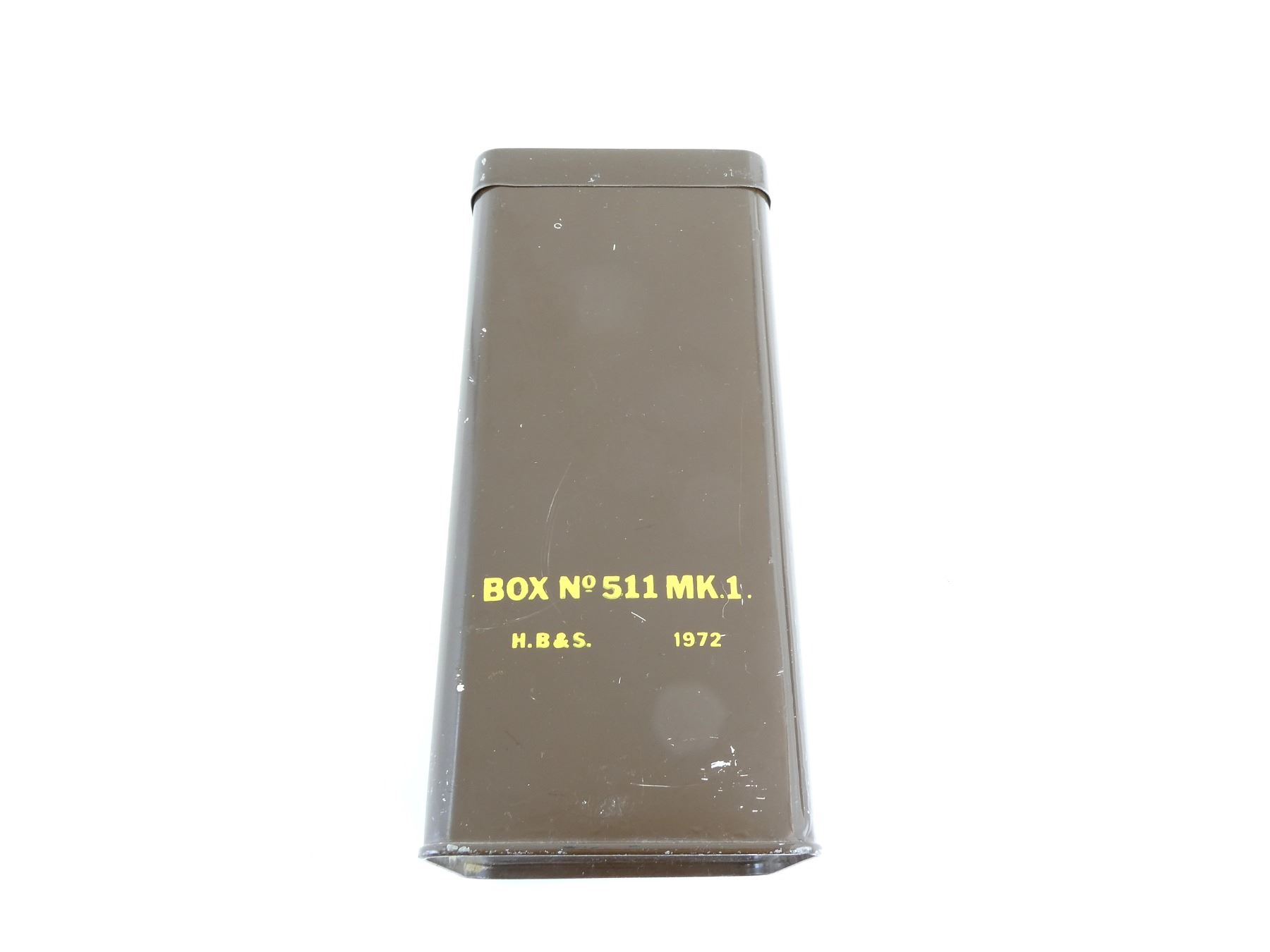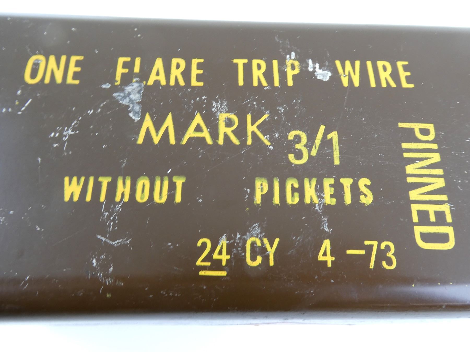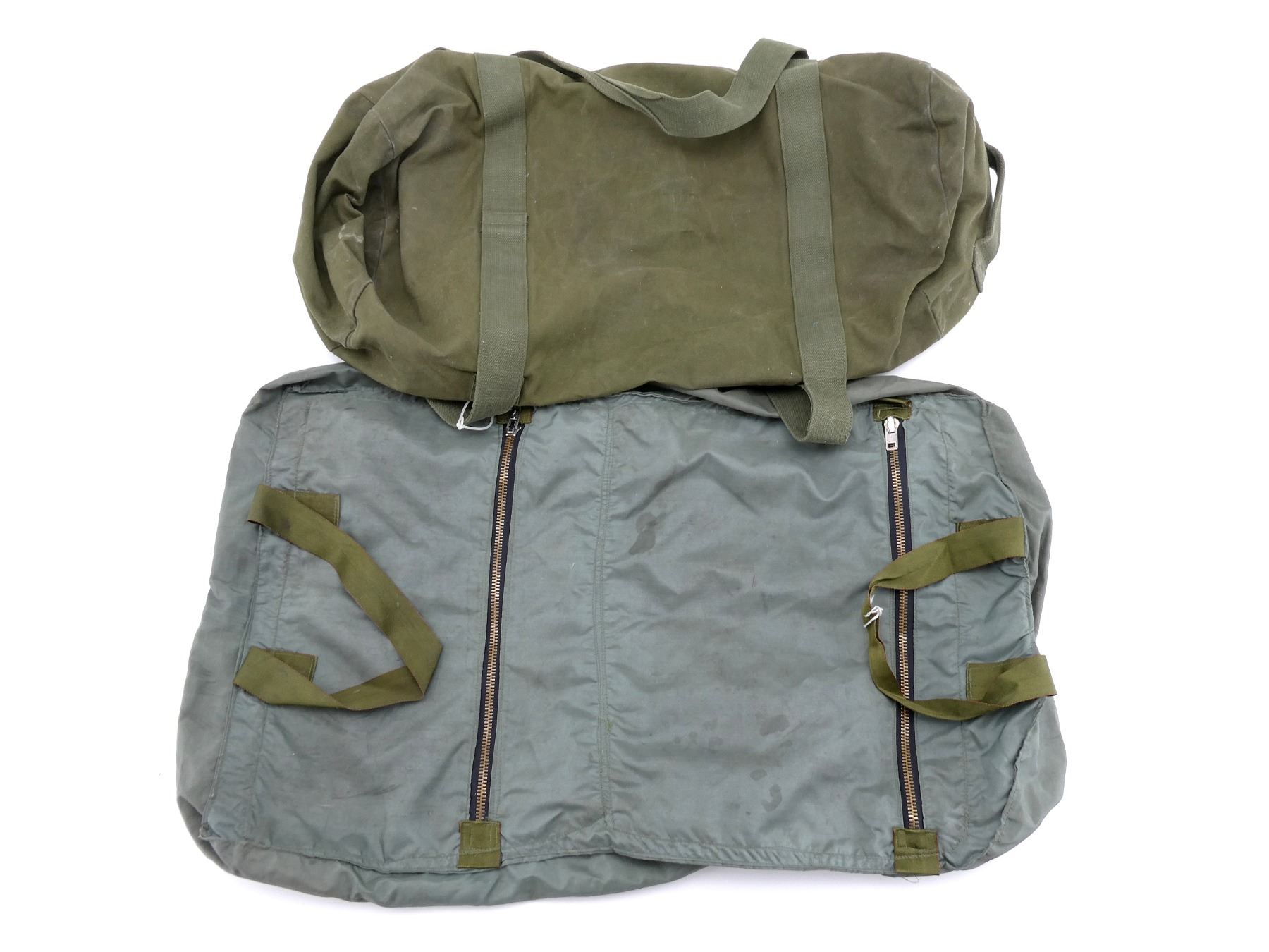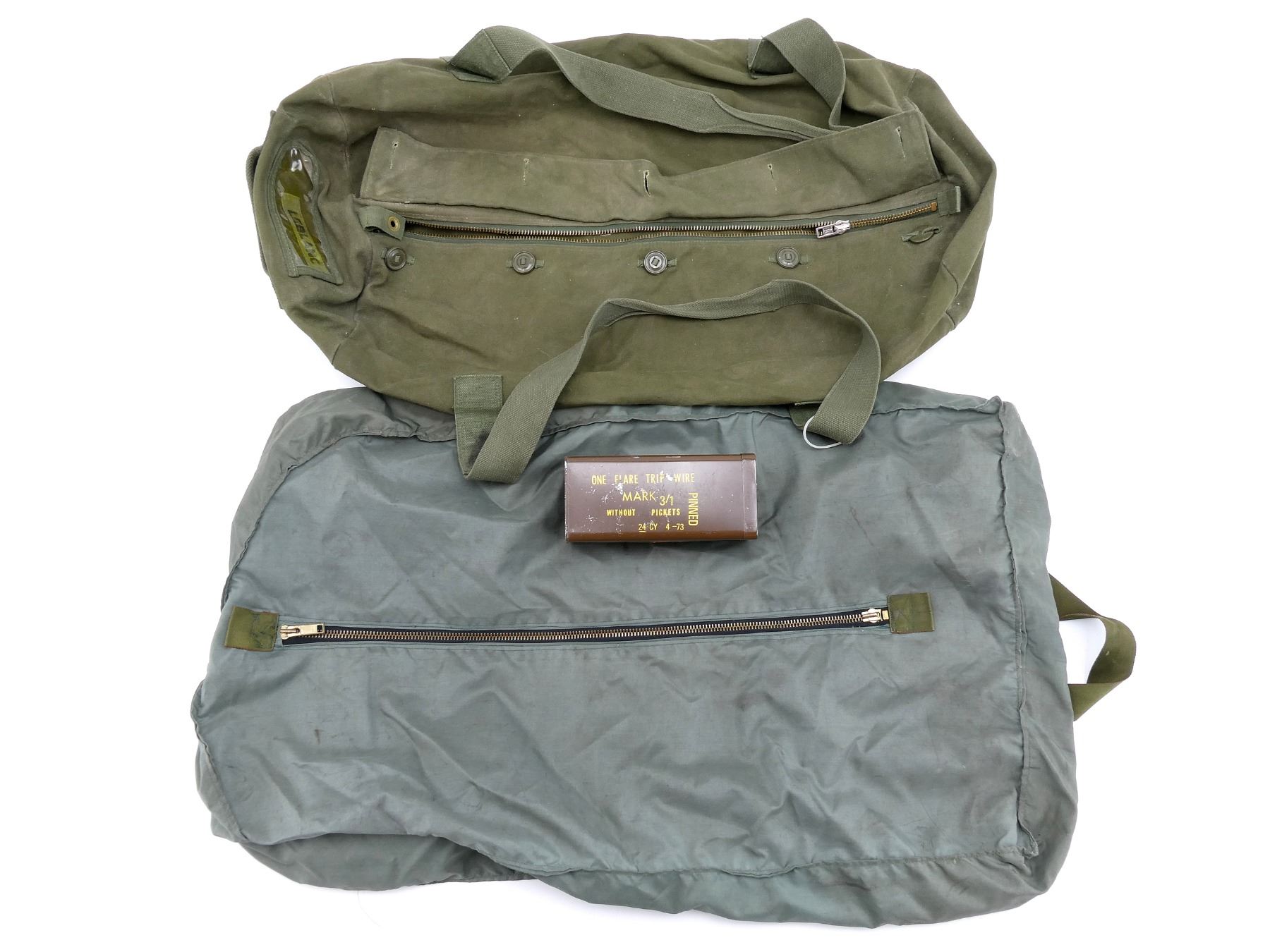 LOT INCLUDES; (1) GREEN NYLON STYLE DUFFEL BAG WITH ZIPPER (WORKS) & CARRYING HANDLES, NO VISIBLE MARKINGS, APPROX. OAL 32", (1) GREEN CANVAS DUFFEL BAG WITH ZIPPER (WORKS) & BUTTONS, NO VISIBLE MARKINGS, APPROX. OAL 32" & (1) BRITISH BROWN ONE FLARE TRIP WIRE TIN, MARKED: "MARK 3/1, PINNED, WITHOUT PICKETS, 24 CY 4-73", "H.B. & S. 1972", ETC. SEE PHOTOS.