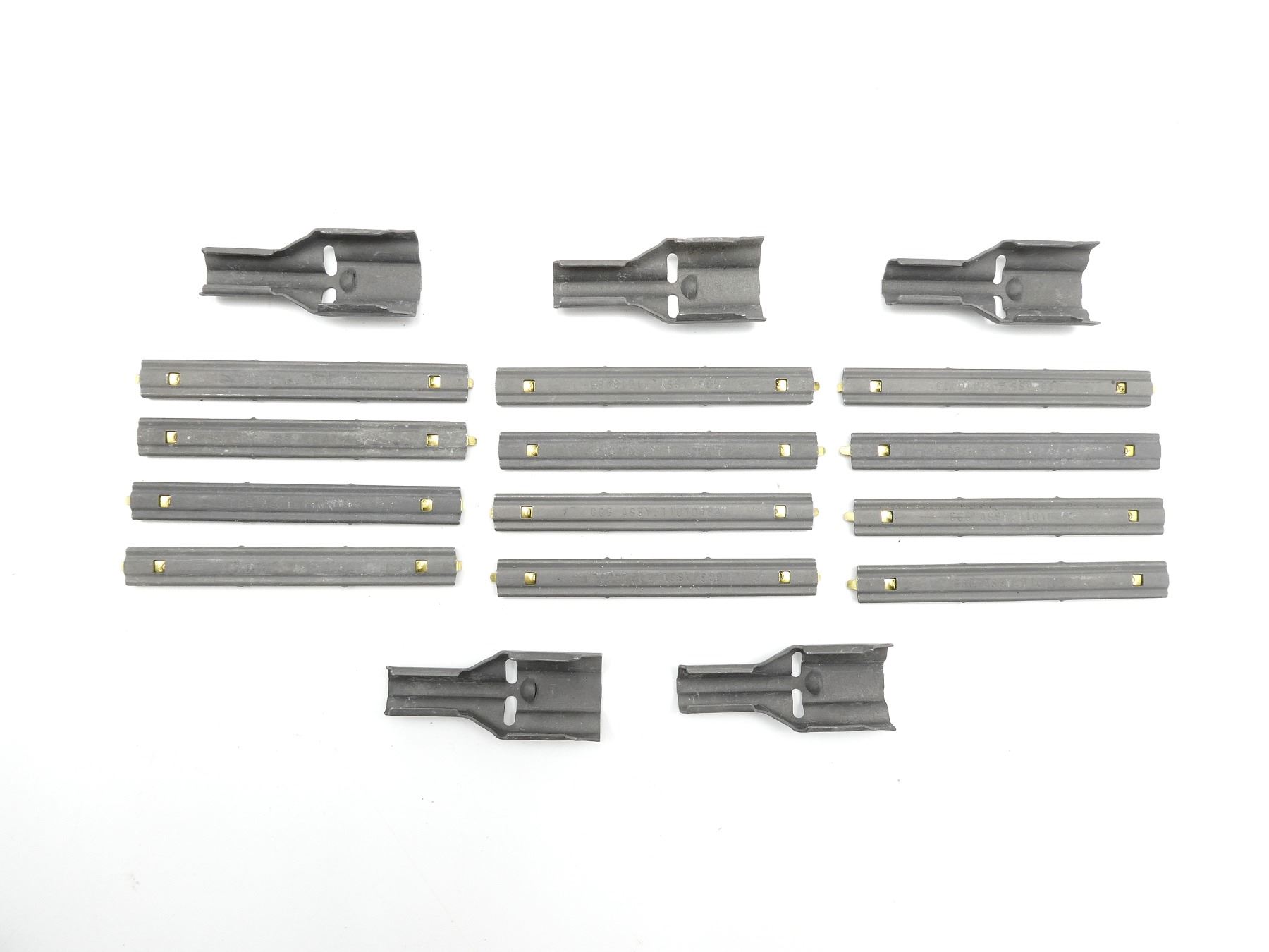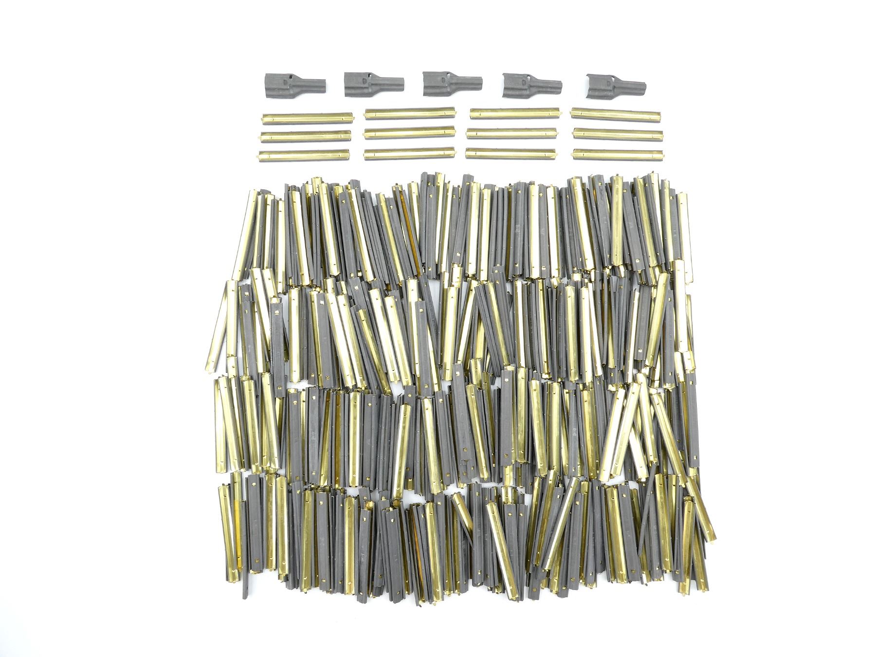 LOT INCLUDES; APPROX. (500) 5.56 NATO STRIPPER CLIPS, FITS M-16 / AR-15 / ETC., METAL, 10 RNDS, MOST MARKED: "GGG ASSY 11010483" & (5) STEEL 5.56MM STRIPPER CLIP GUIDES, MARKED: "G.G.G., 11010484". SEE PHOTOS.