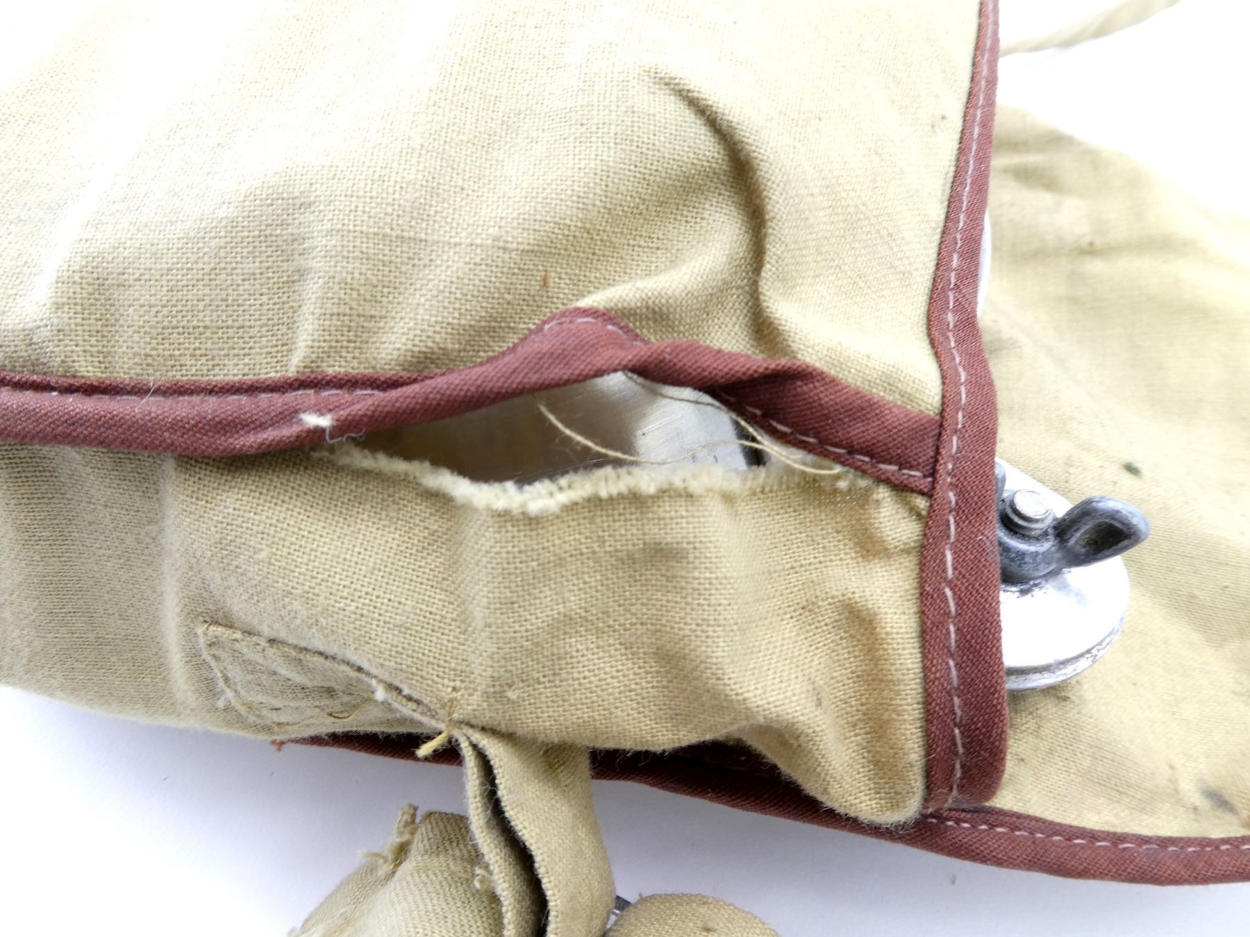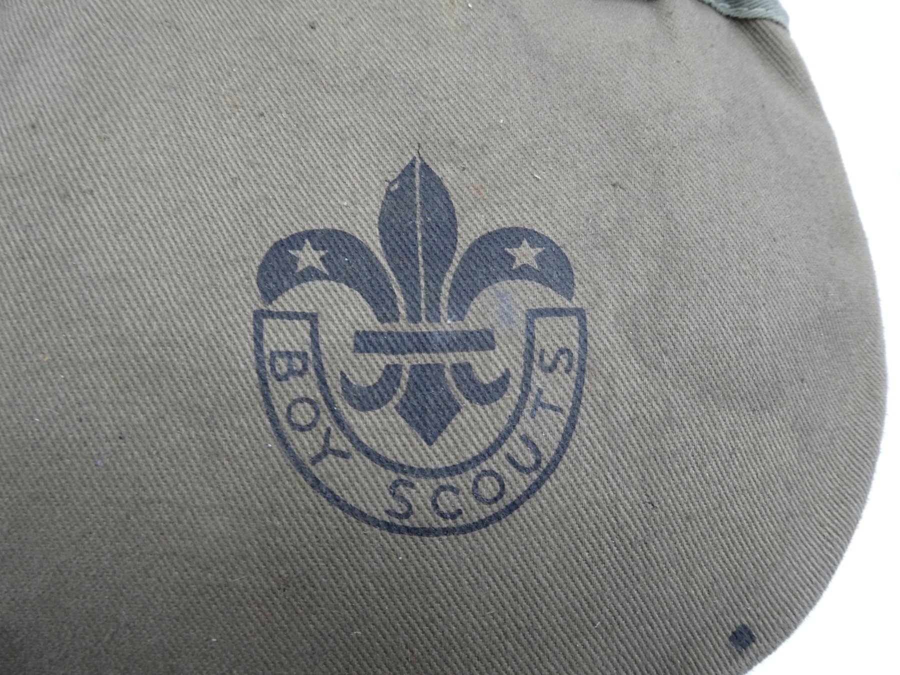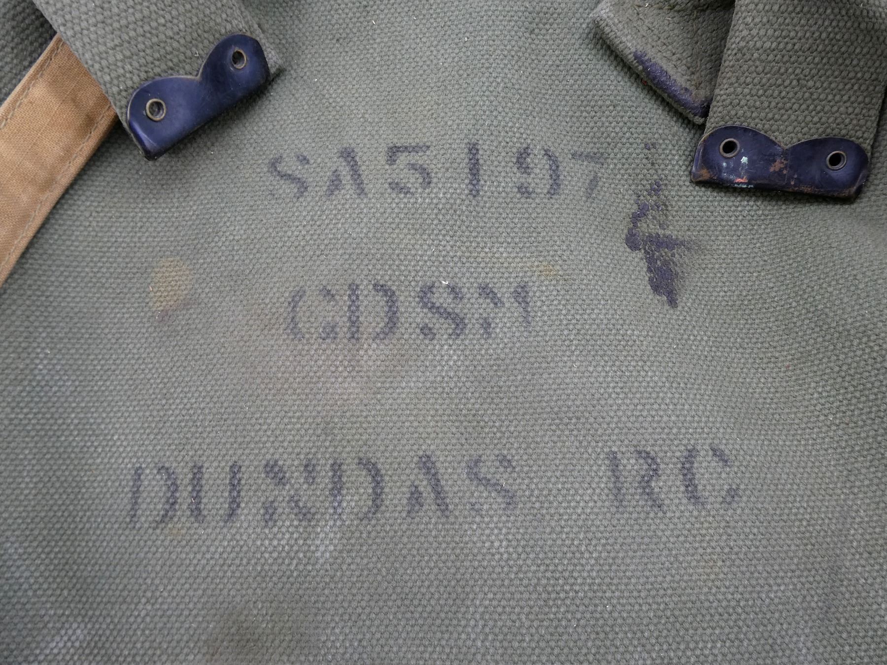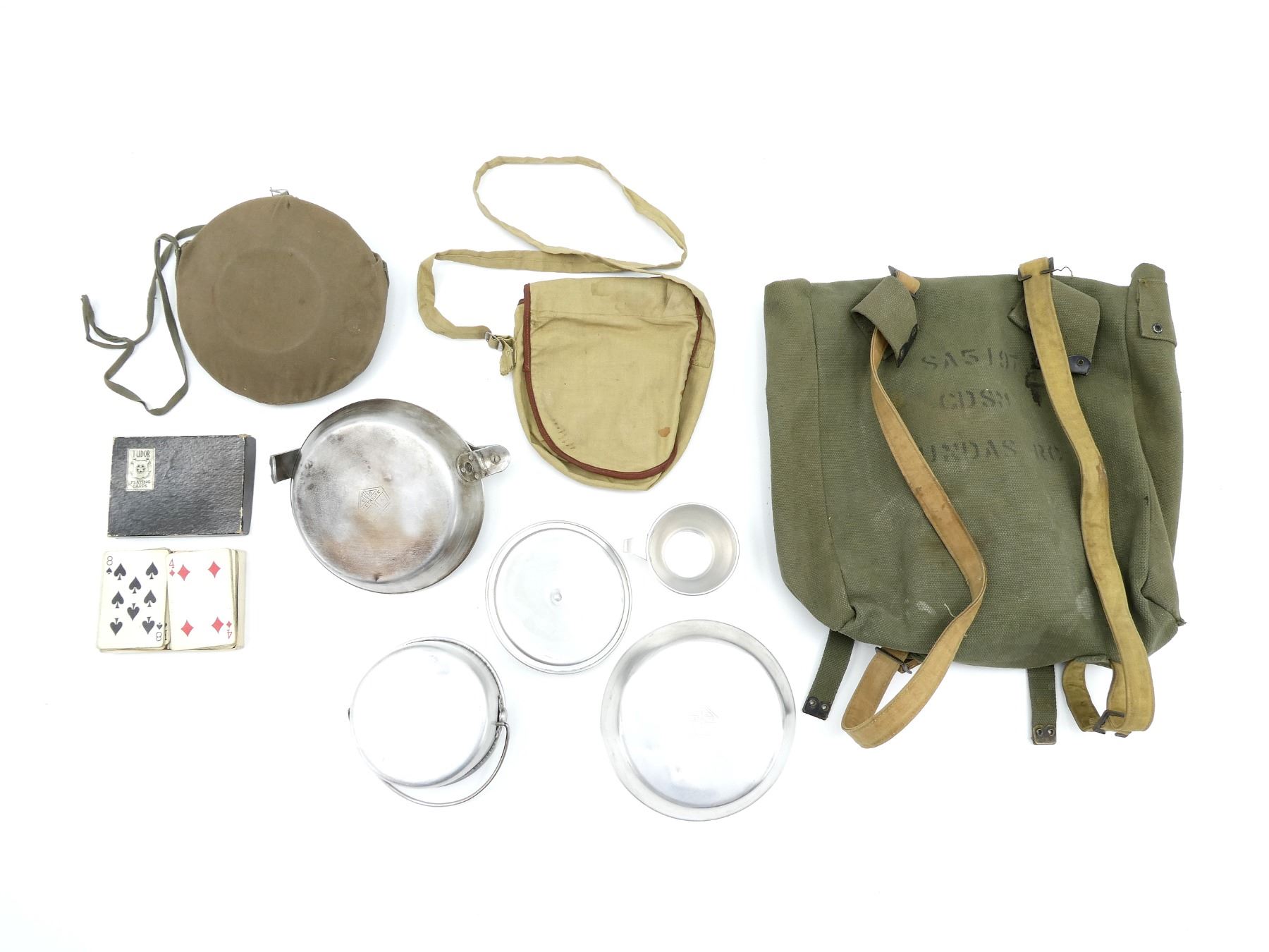 LOT INCLUDES; (1) CANADIAN / BRITISH GREEN CANVAS WEB FIELD PACK, MARKED: "SA5197, CDSM, DUNDAS RC", TAN CANVAS SHOULDER STRAPS, ONE MARKED: "D & M LTD. 41", BROAD ARROWS, "40", OTHER MARKED: "VC LTD, 1941", BROAD ARROW OVER "?5", SHOWS AGE / WEAR, (1) SET OF PLAYING CARDS, TWO DECKS WORTH, 108 CARDS (INCLUDING TWO JOKERS & TWO GAME INSTRUCTION CARDS), BOX LID MARKED: "TUDOR", SHIELD WITH ROSE, "PLAYING CARDS", INSIDE LID MARKED: "CANADIAN PLAYING CARD CO., LIMITED, MONTREAL, CANADA", SHOWS AGE / WEAR, AGE UNKNOWN, (1) MILITARY STYLE MESS TIN SET, WITH BOWL, CUP, MINI POT WITH LID & BOWL WITH DETACHABLE HANDLE, BOWLS MARKED: "METALITE, MADE IN CANADA", NO VISIBLE MARKINGS ON OTHER PIECES, TIN / ALUMINUM CONSTRUCTION, WITH TAN / BROWN CLOTH CARRIER, NO VISIBLE MARKINGS & (1) BOY SCOUTS METAL CANTEEN WITH COVER, NO VISIBLE MARKINGS ON CANTEEN, COVER MARKED: "BOY SCOUTS". SEE PHOTOS.