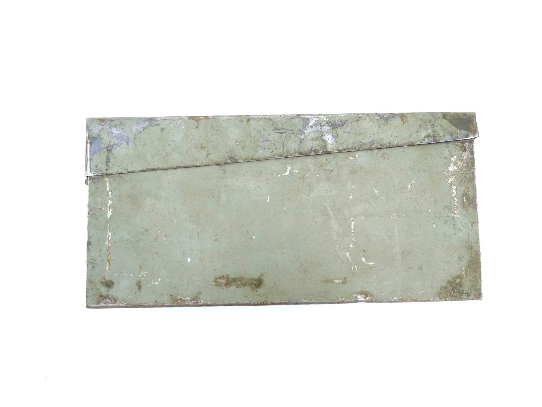 (1) GREEN PAINTED AMMO TIN WITH CARRY HANDLE, NO VISIBLE MARKINGS, LATCH HANDLE BROKEN OFF (IN AMMO TIN), APPROX. 14.5" X 3.5" X 6.75". SEE PHOTOS.