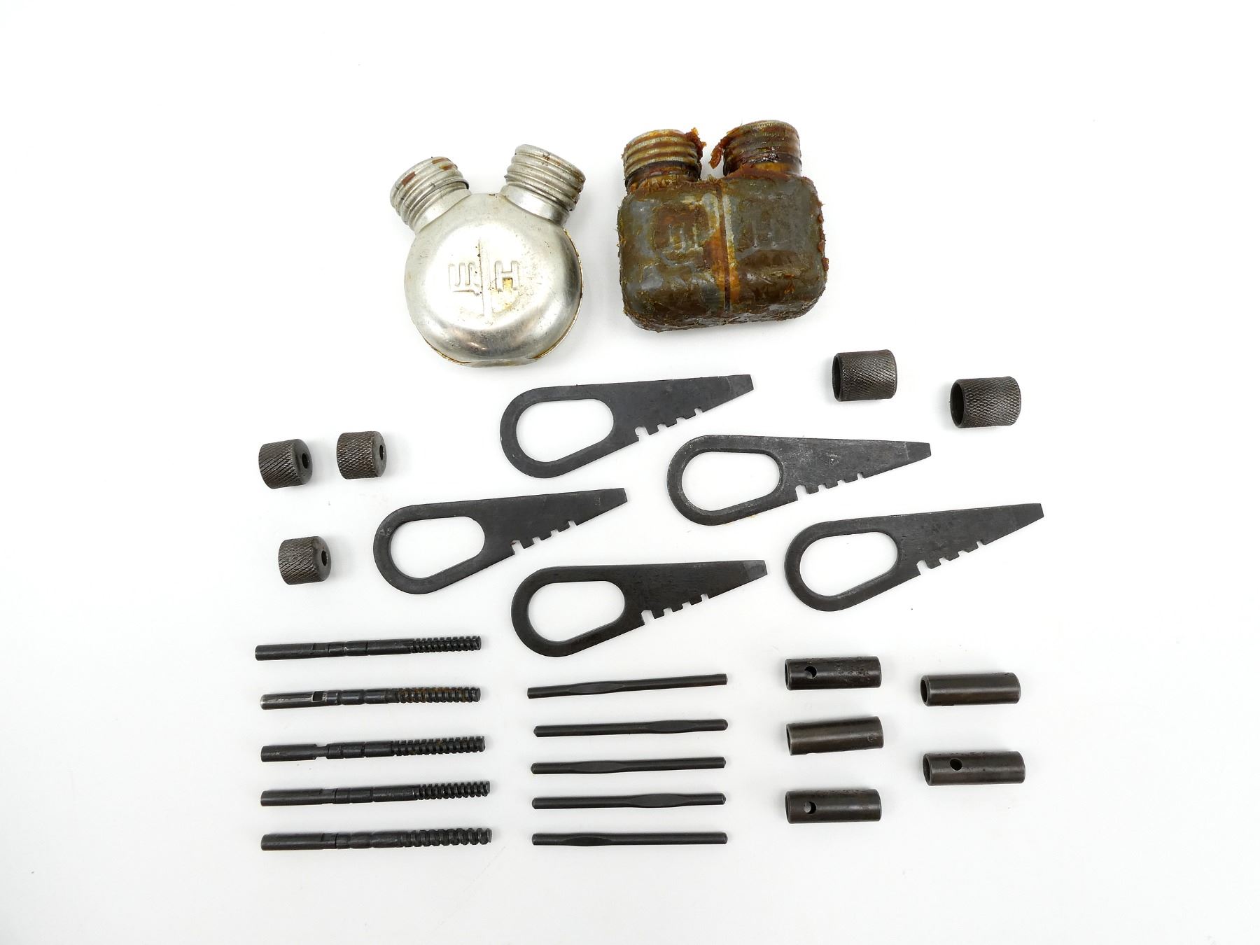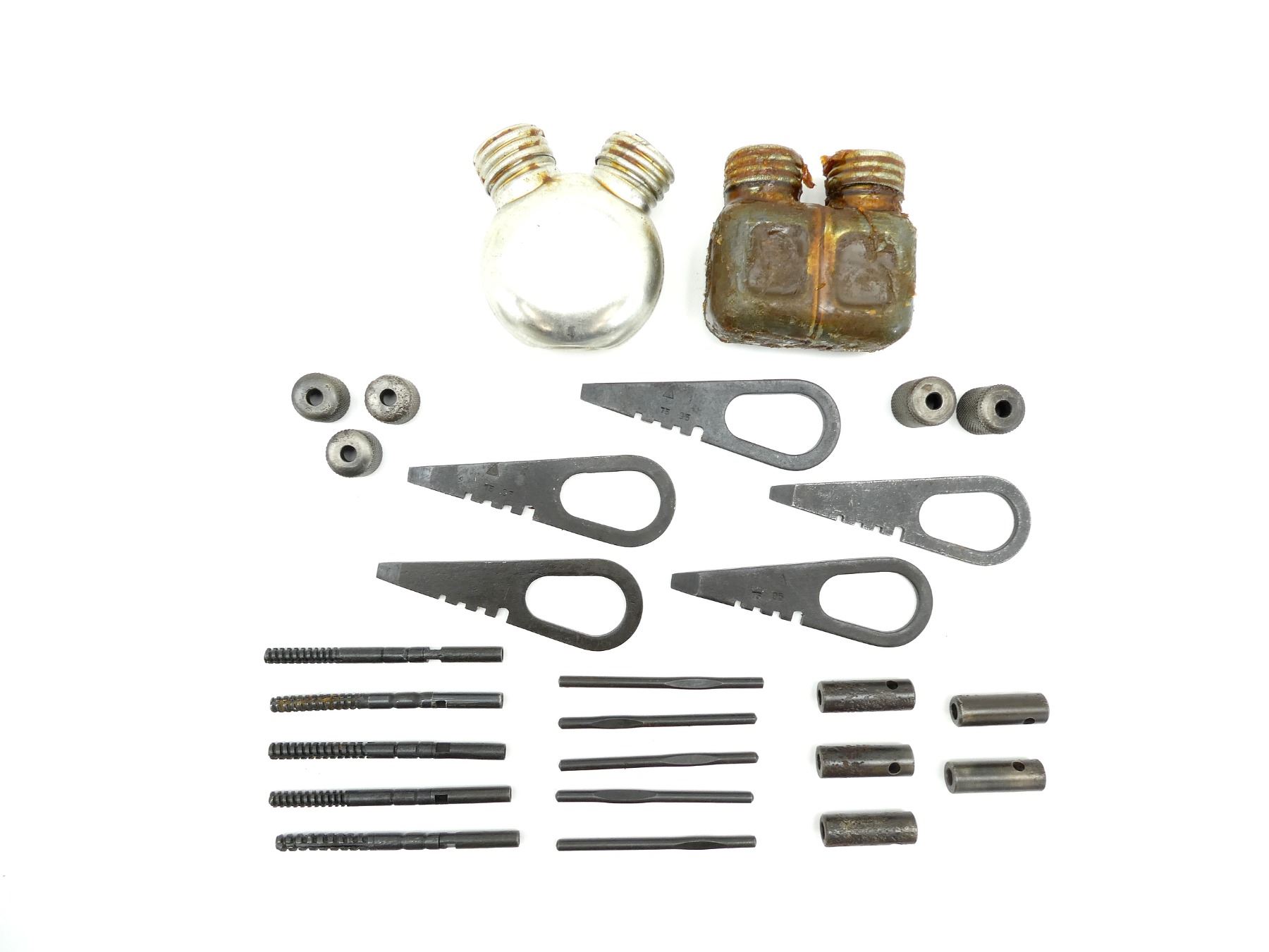 LOT INCLUDES; (2) METAL DOUBLE-SPOUTED OILERS, ONE SQUARE SHAPED, ONE CIRCULAR SHAPED, VARIOUS MARKINGS, (5) COMBO TOOLS, (5) WRENCHES, (5) GUIDES & (5) JAGS. SEE PHOTOS.