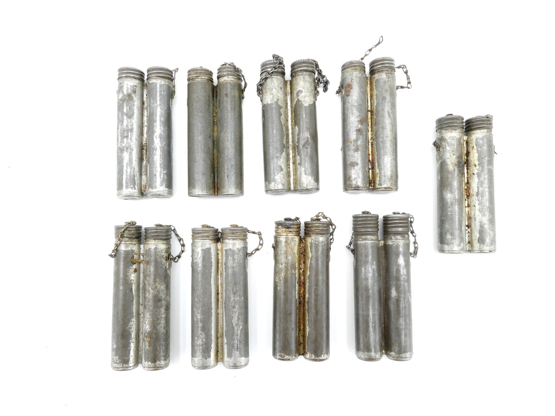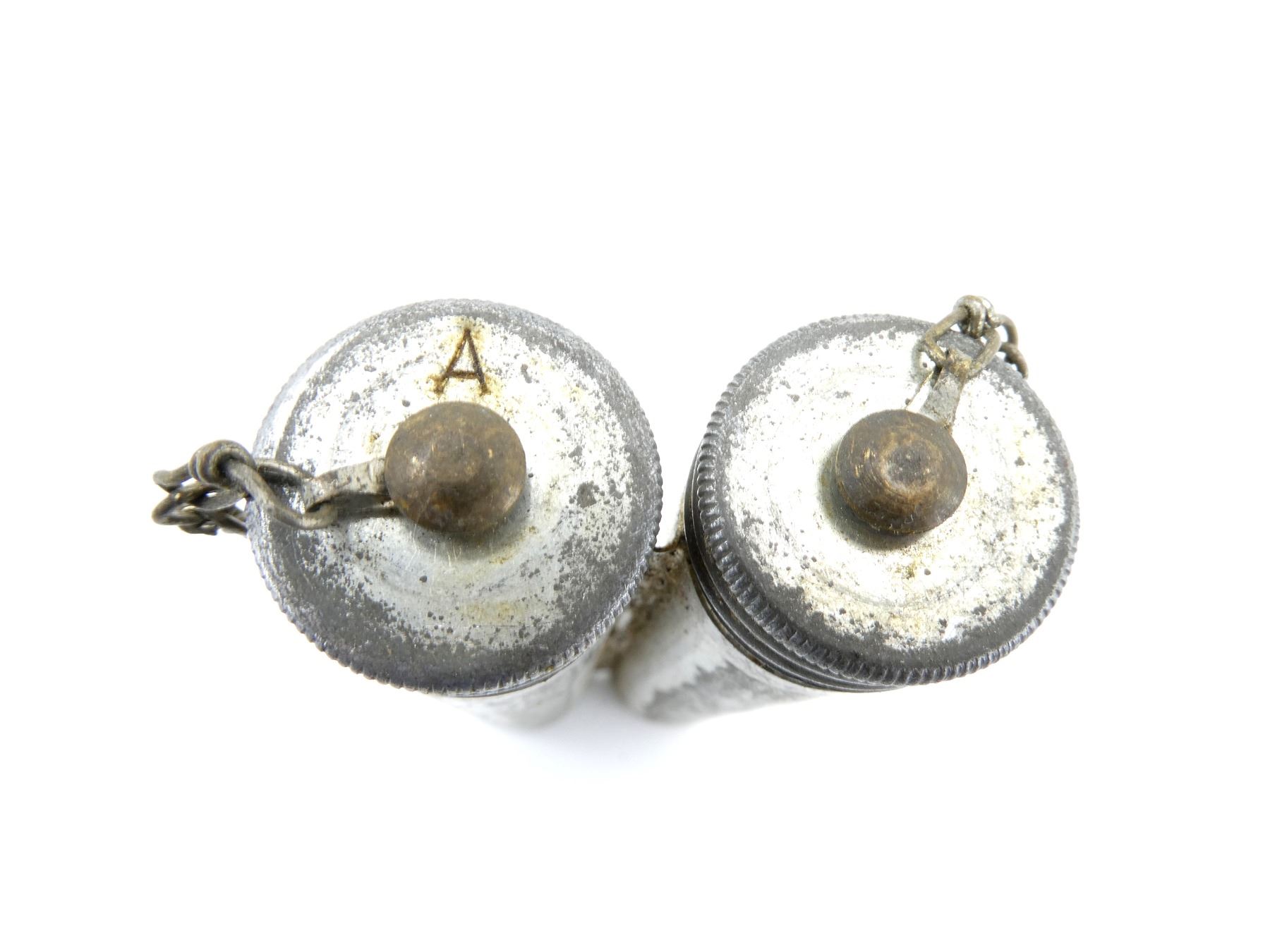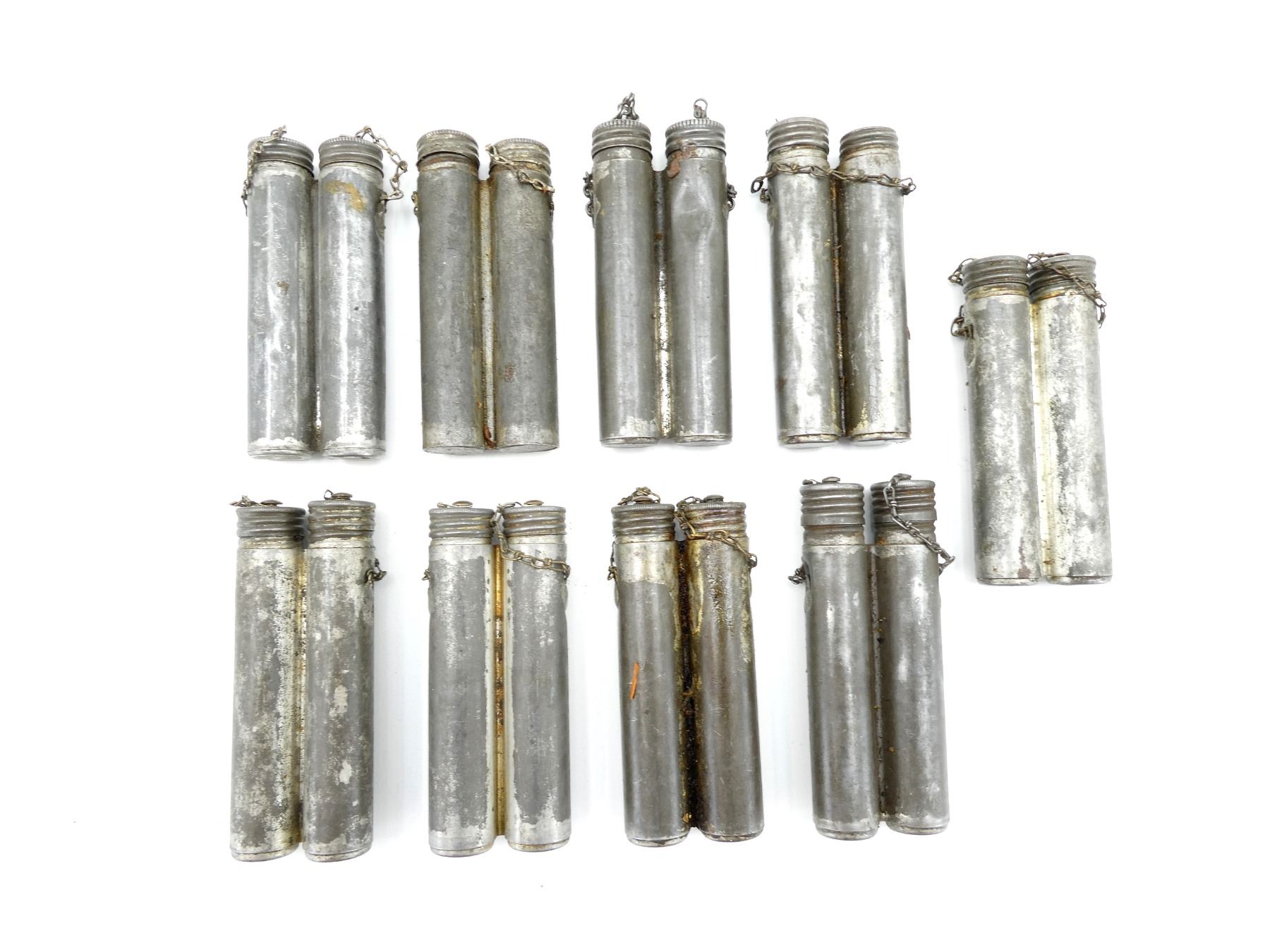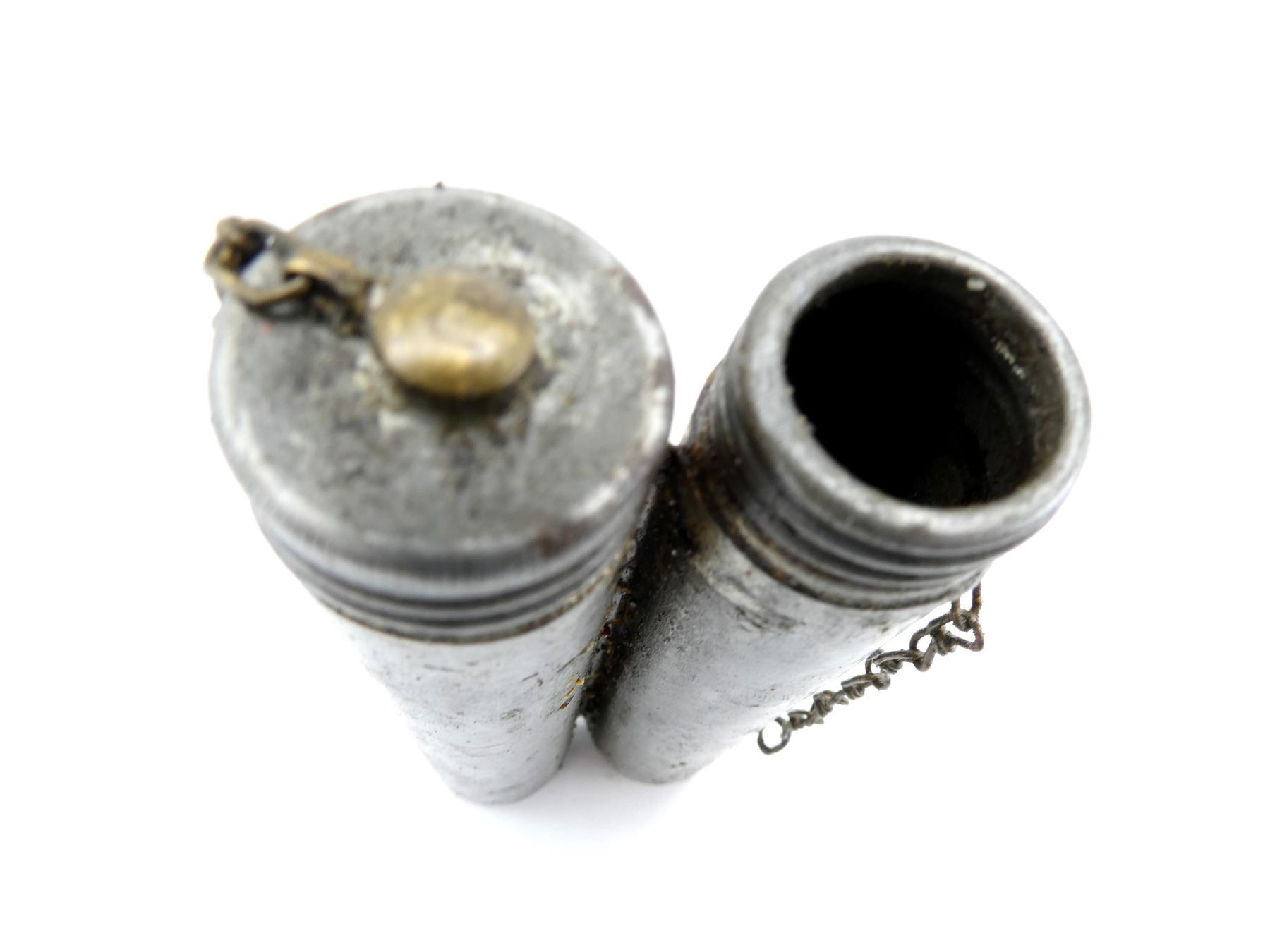 LOT INCLUDES; (9) METAL DOUBLE-TUBE OILERS, FOUR MARKED: "A" ON CAP, ONE MARKED WITH THREE CROWN PROOF MARK ON BOTTOM OF TUBE, TWO HAVE WIRE BRUSHES INSIDE, FOUR HAVE NO VISIBLE MARKINGS, ONE IS MISSING A CAP ON ONE OF THE TUBES. SEE PHOTOS.