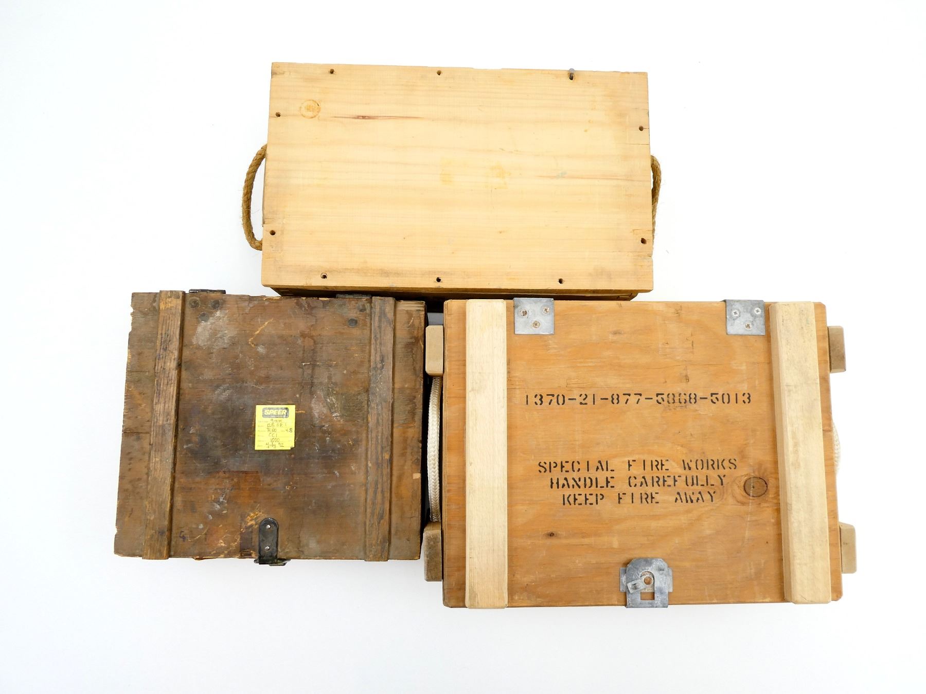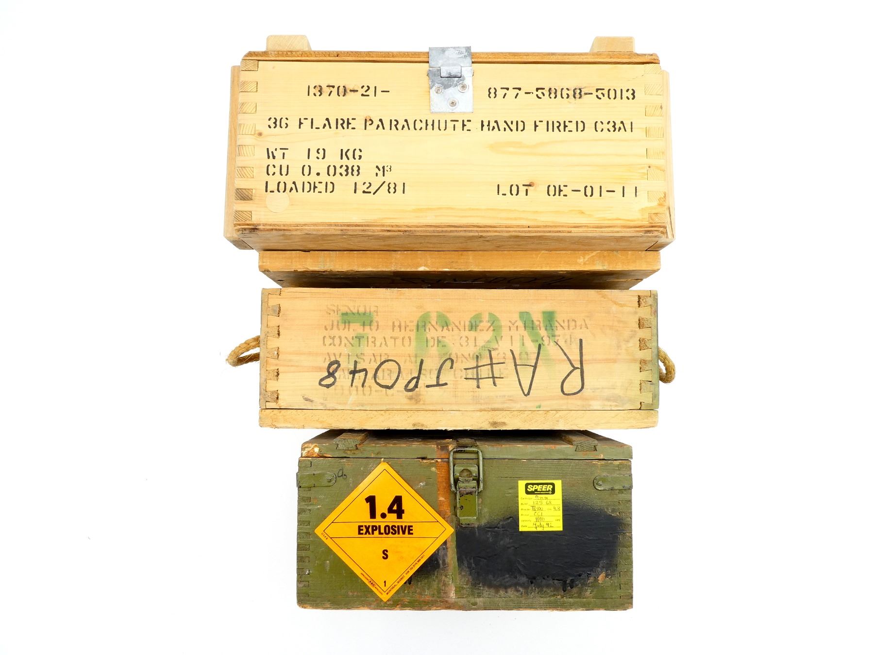 LOT INCLUDES; (1) CANADIAN MILITARY WOODEN AMMO / FLARE CRATE WITH LID, VARIOUS MARKINGS, ROPE HANDLES, METAL HINGES / LATCH, APPROX. 19.5" X 13.5" X 9", (1) UNKNOWN MILITARY STYLE AMMO CRATE WITH LID, VARIOUS MARKINGS, ROPE HANDLES, APPROX. 20" X 10.75" X 7 3/8" & (1) UNKNOWN MILITARY STYLE AMMO CRATE WITH LID, VARIOUS MARKINGS, METAL HANDLES / HINGES / LATCH, APPROX. 13 5/8" X 12 1/8" X 6.75". SEE PHOTOS.