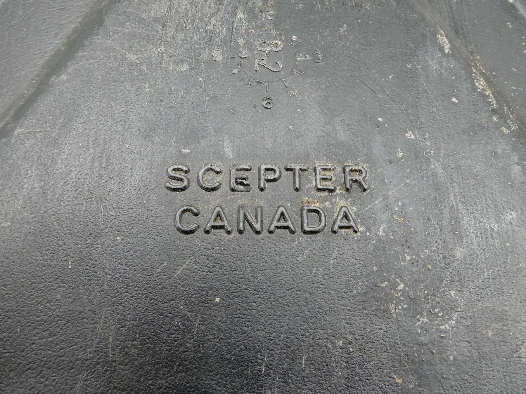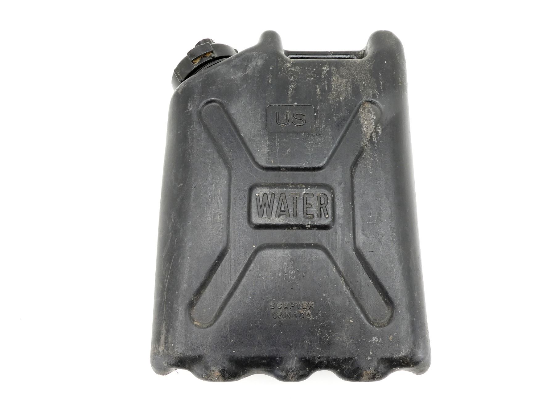 (1) BLACK PLASTIC 5 GALLON WATER CAN WITH CAP, MARKED: "US", "WATER", "SCEPTER, CANADA" & "B-2-108", APPROX. 13.5" X 6.25" X 18.5". SEE PHOTOS.