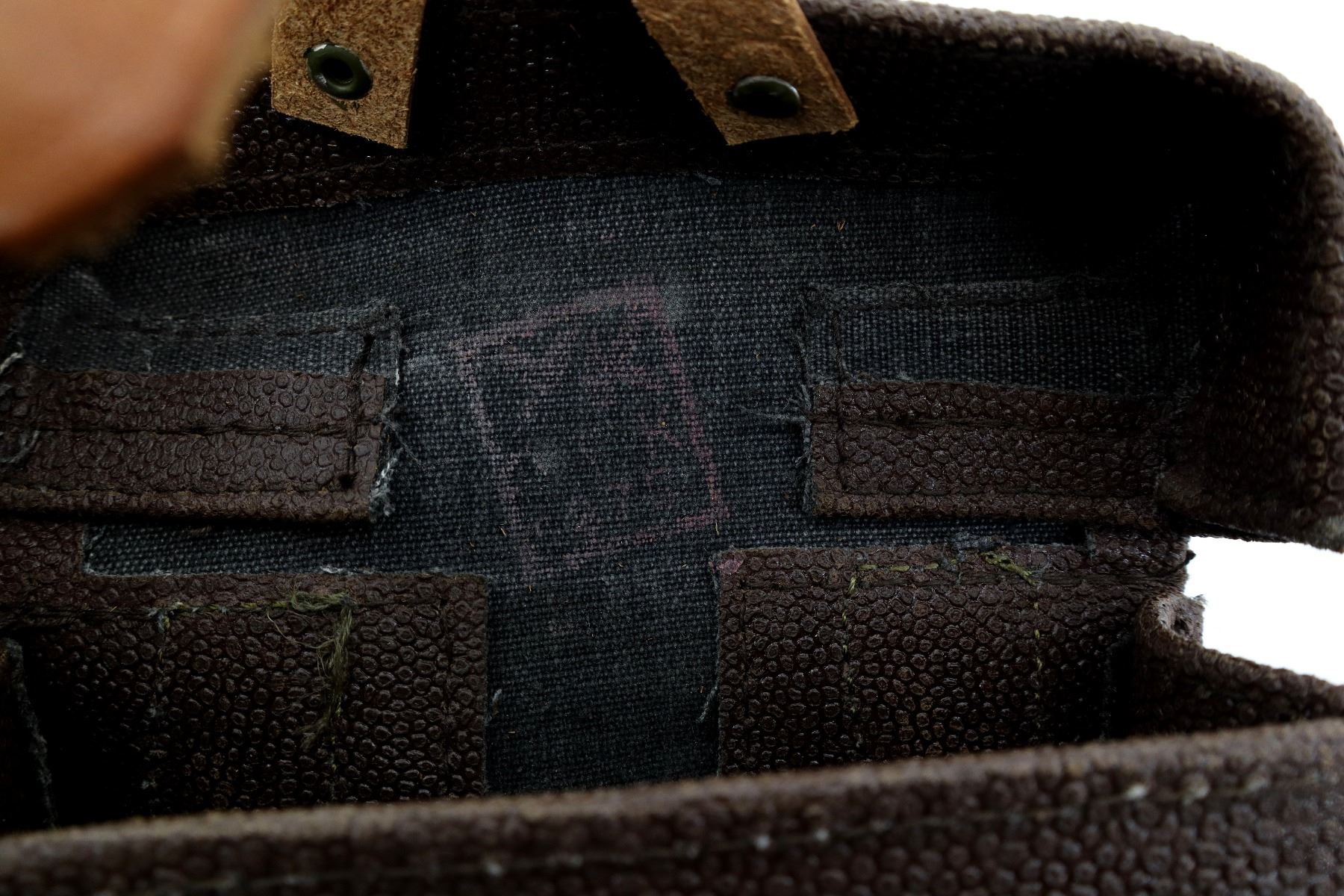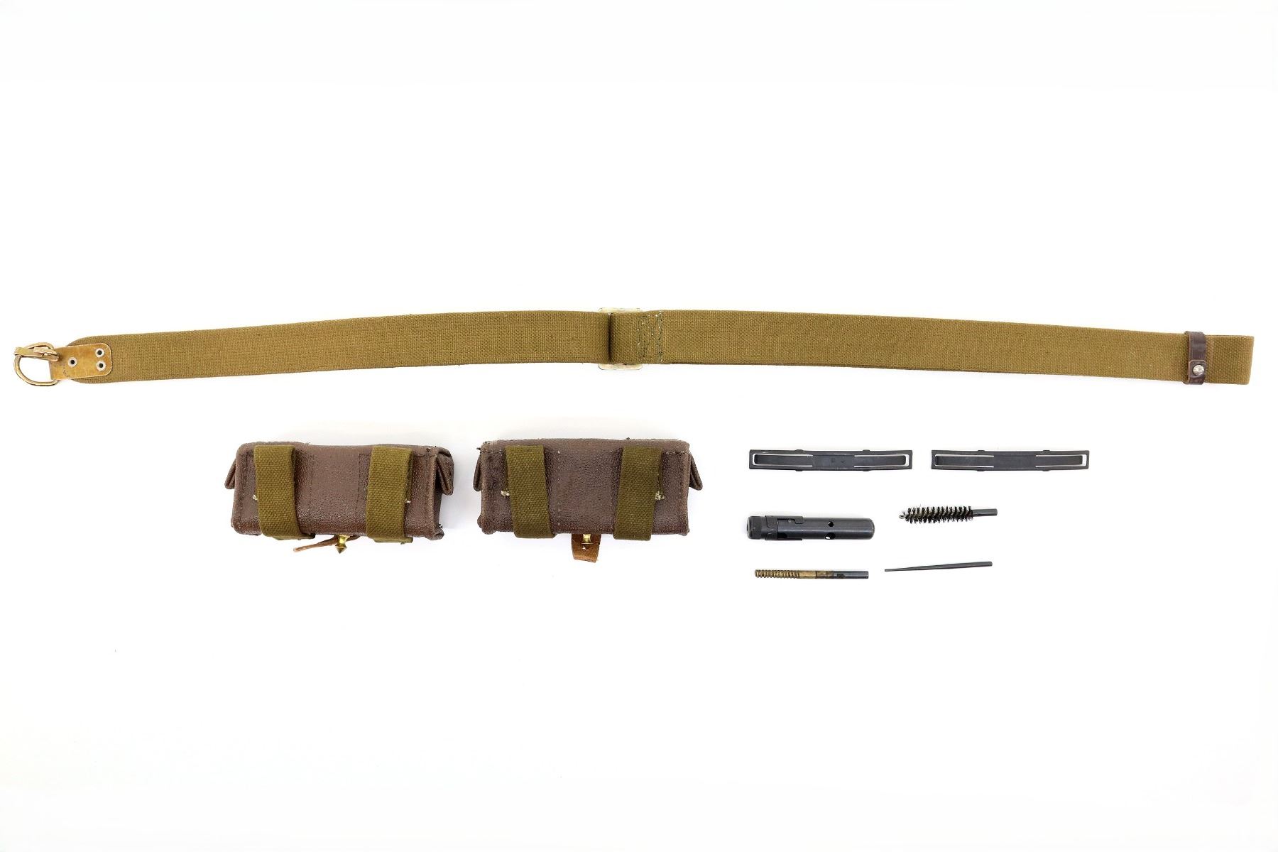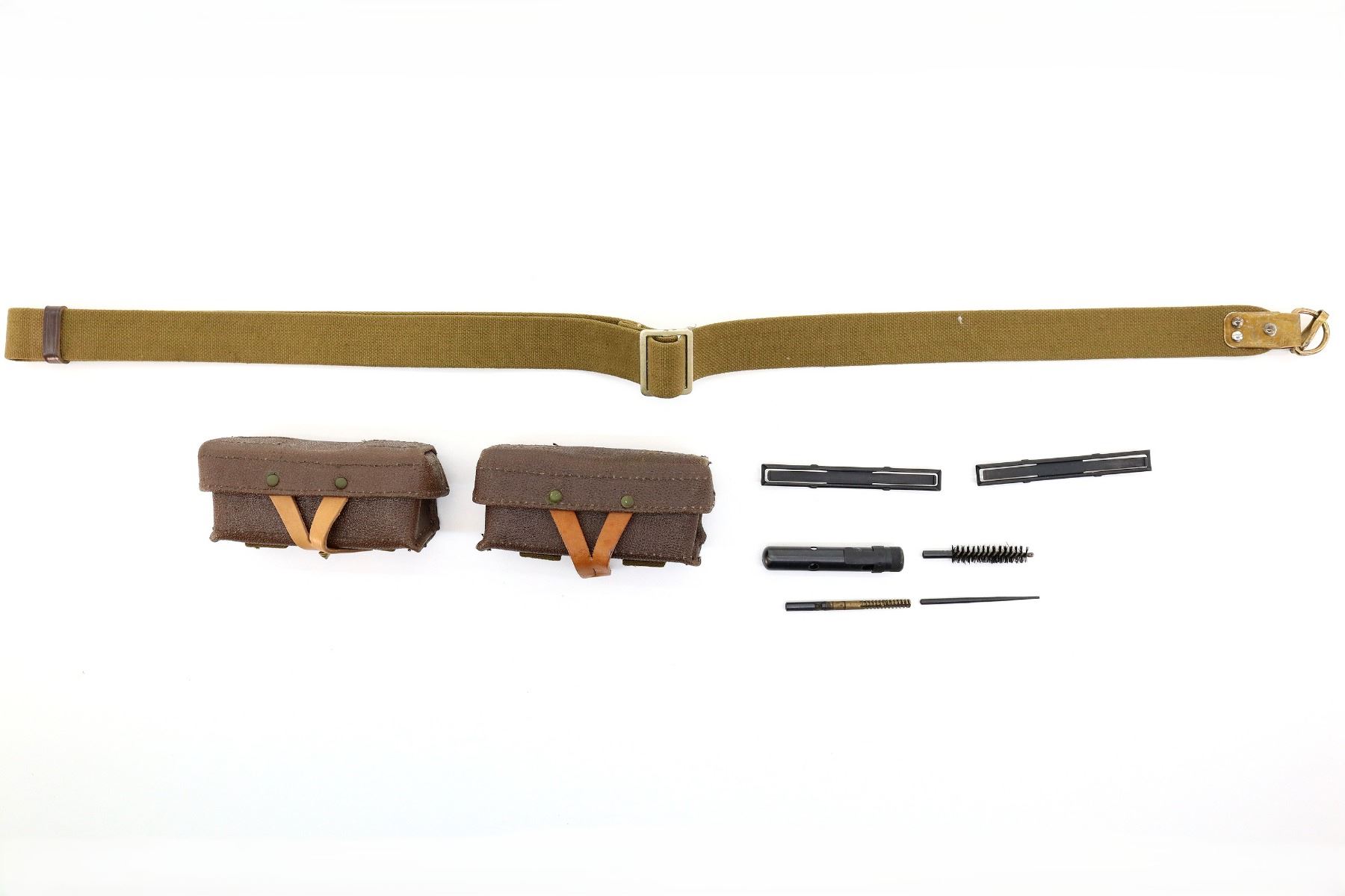 LOT INCLUDES; (2) BROWN LEATHER AMMO POUCHES, VARIOUS MARKINGS, TWO CANVAS BELT LOOPS, BRASS / METAL FITTINGS, (2) SKS BLACK PAINTED STEEL 7.62X39MM 10-RND STRIPPER CLIPS, VARIOUS MARKINGS, (1) TAN CANVAS SKS SLING, VARIOUS MARKINGS, METAL FITTINGS, OAL APPROX. 37.5", ADJUSTABLE & (1) SKS CLEANING KIT WITH BRUSH, PIN PUNCH & JAG. SEE PHOTOS.