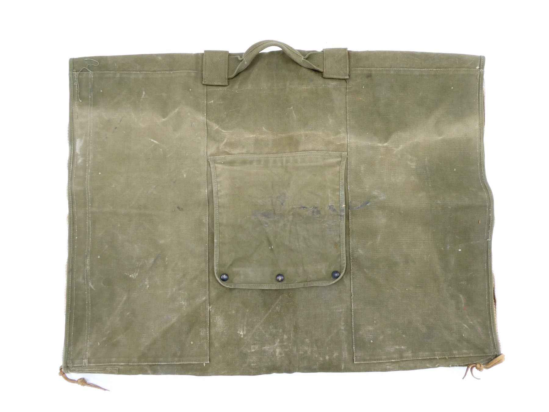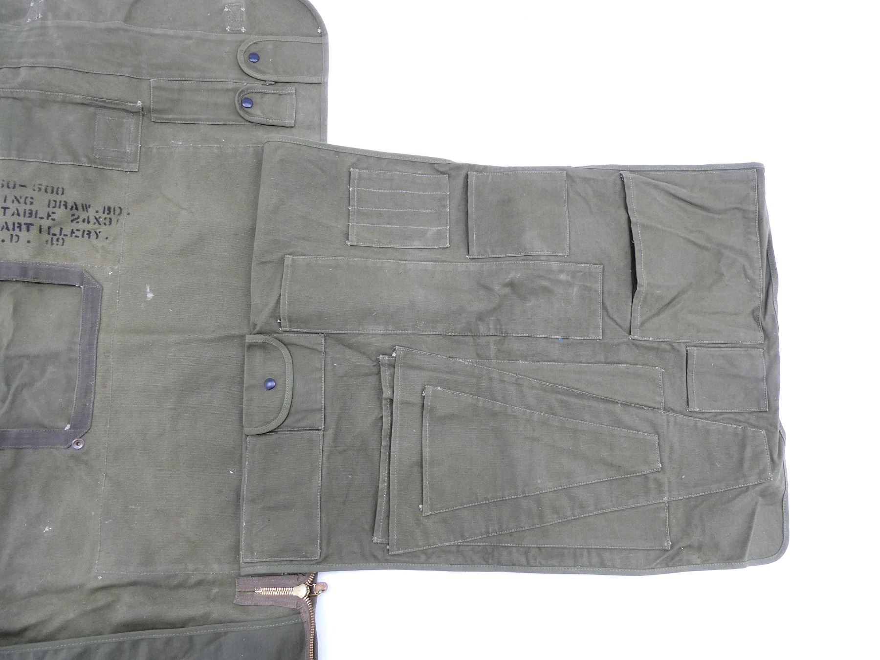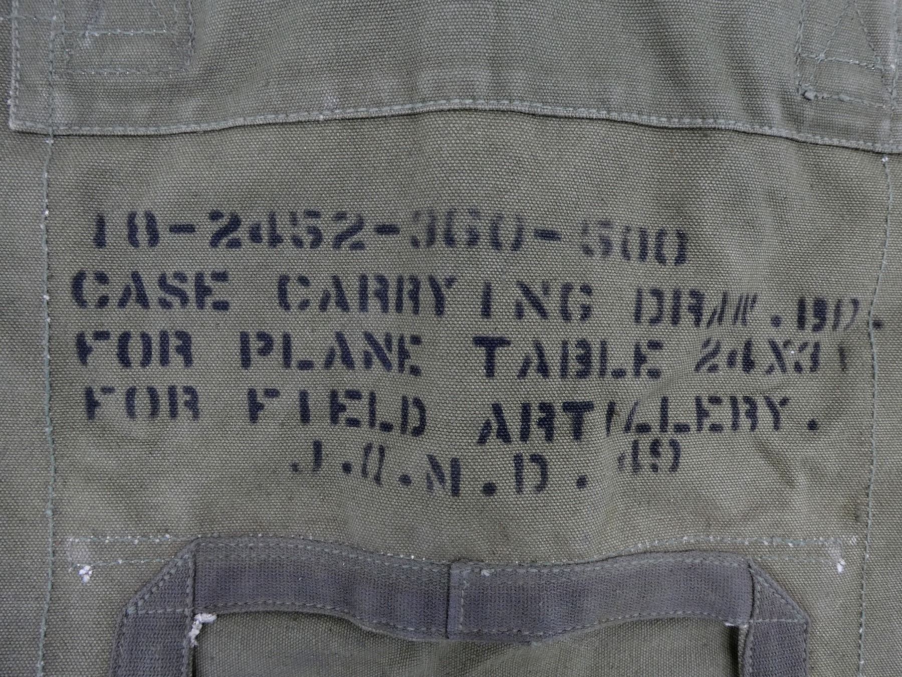 (1) FIELD ARTILLERY PLANE TABLE DRAWING BOARD CARRYING CASE, DATED 1949, GREEN CANVAS, MARKED: "U.S." & "18-2452-360-500, CASE CARRYING DRAW. BD., FOR PLANE TABLE 24X31, FOR FIELD ARTILLERY, J.Q.M.D., 49", VARIOUS POCKETS FOR UTENSILS, ZIPPERED ON EITHER SIDE (WORKS), CANVAS CARRYING HANDLE & APPROX. 24" X 33". SEE PHOTOS.