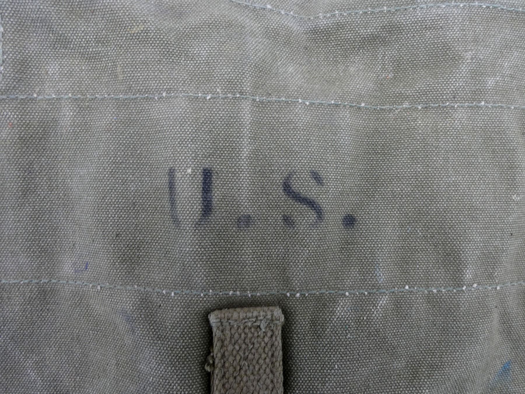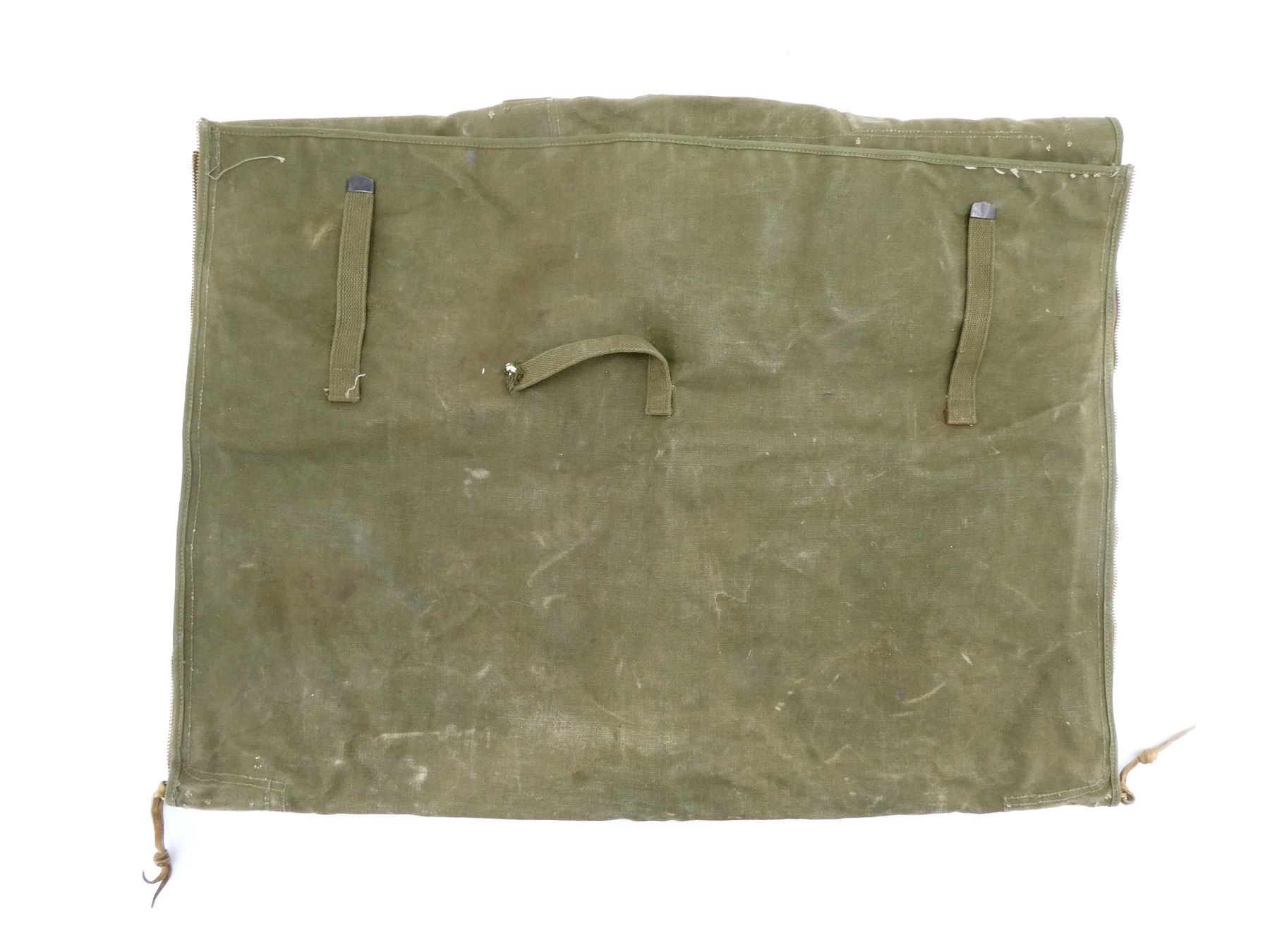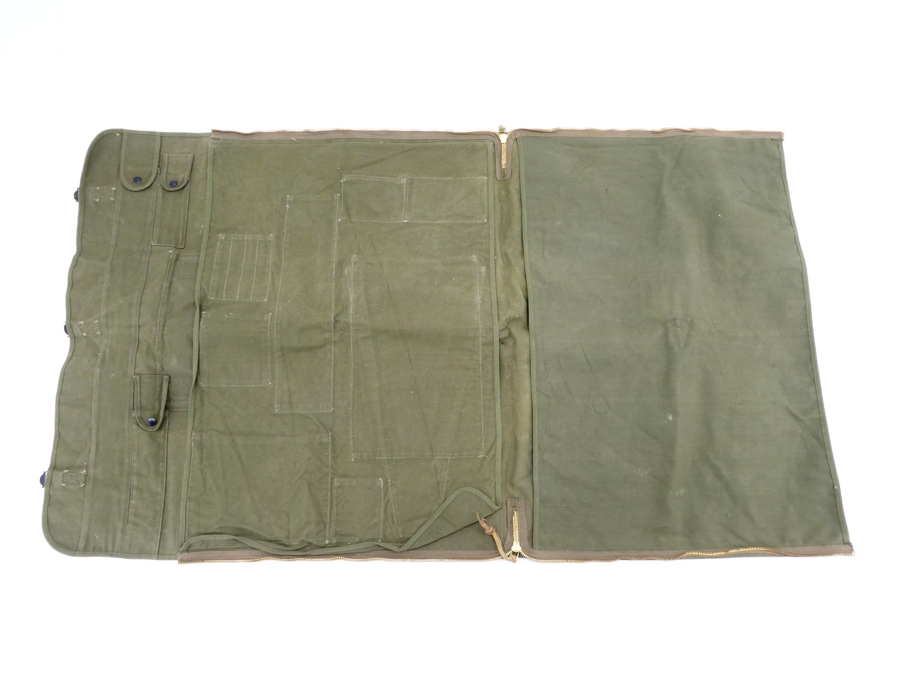 (1) FIELD ARTILLERY PLANE TABLE DRAWING BOARD CARRYING CASE, DATED 1949, GREEN CANVAS, MARKED: "U.S." & "18-2452-360-500, CASE CARRYING DRAW. BD., FOR PLANE TABLE 24X31, FOR FIELD ARTILLERY, J.Q.M.D., 49", VARIOUS POCKETS FOR UTENSILS, ZIPPERED ON EITHER SIDE (WORKS), CANVAS CARRYING HANDLE & APPROX. 24" X 33". SEE PHOTOS.