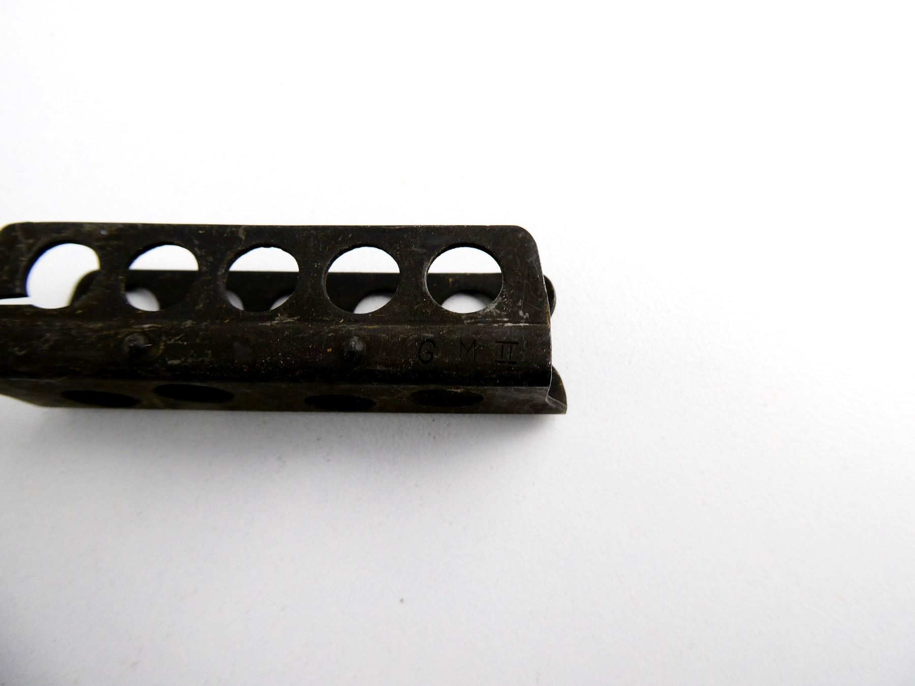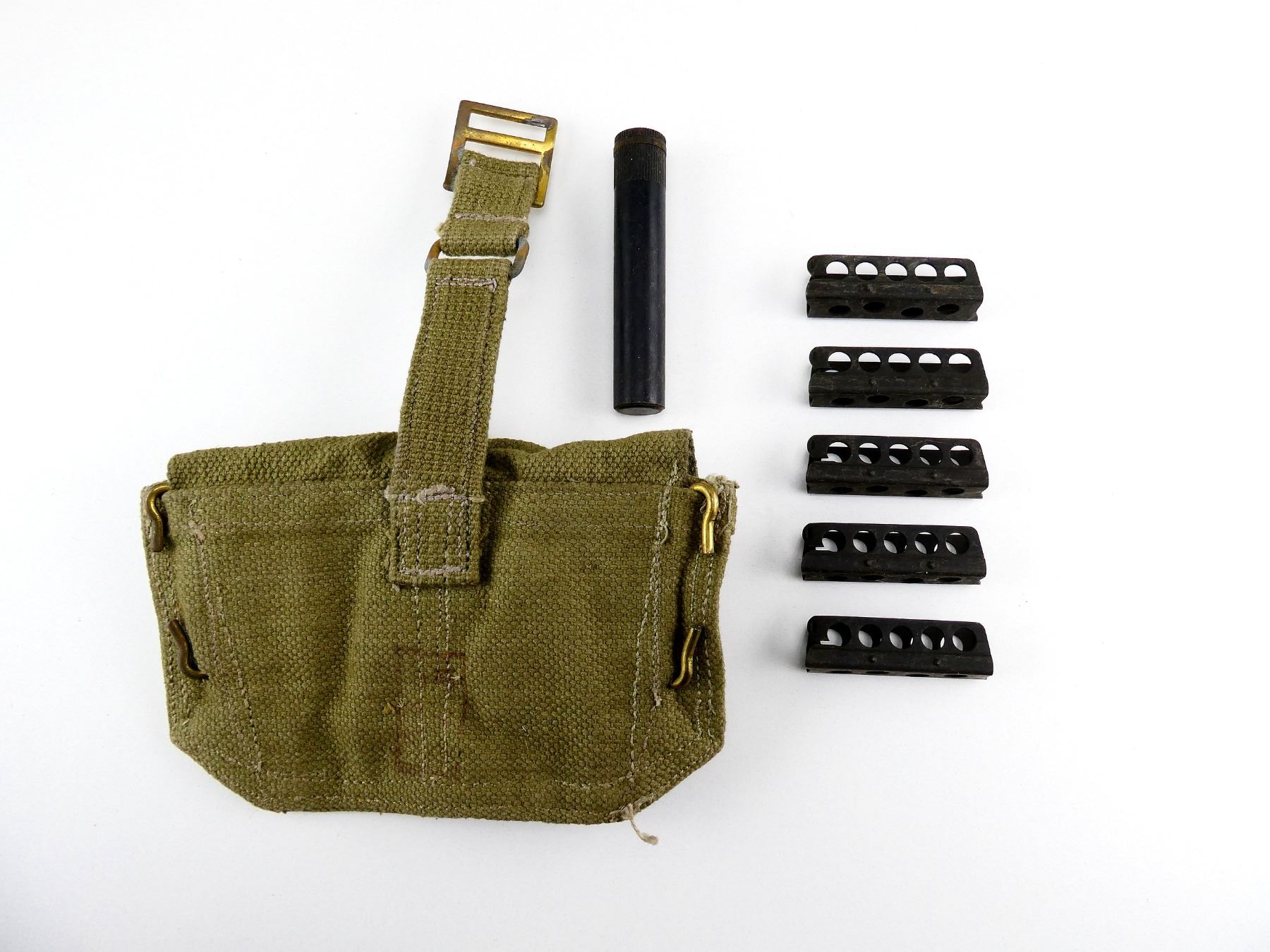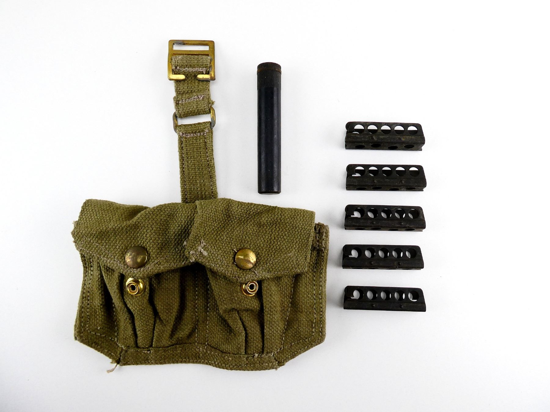 LOT INCLUDES; (1) BELGIAN LEE ENFIELD GREEN CANVAS AMMO POUCH, NO VISIBLE MARKINGS, 2-POCKET WITH METAL BELT HOOKS, (1) BLACK POLYMER OILER, TIP OF SPOON BROKEN & (5) .303 BR STRIPPER CLIPS, 5-RND, BLUED STEEL, VARIOUS MARKINGS. SEE PHOTOS.