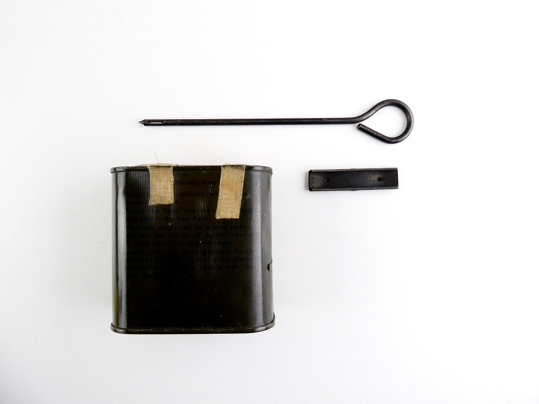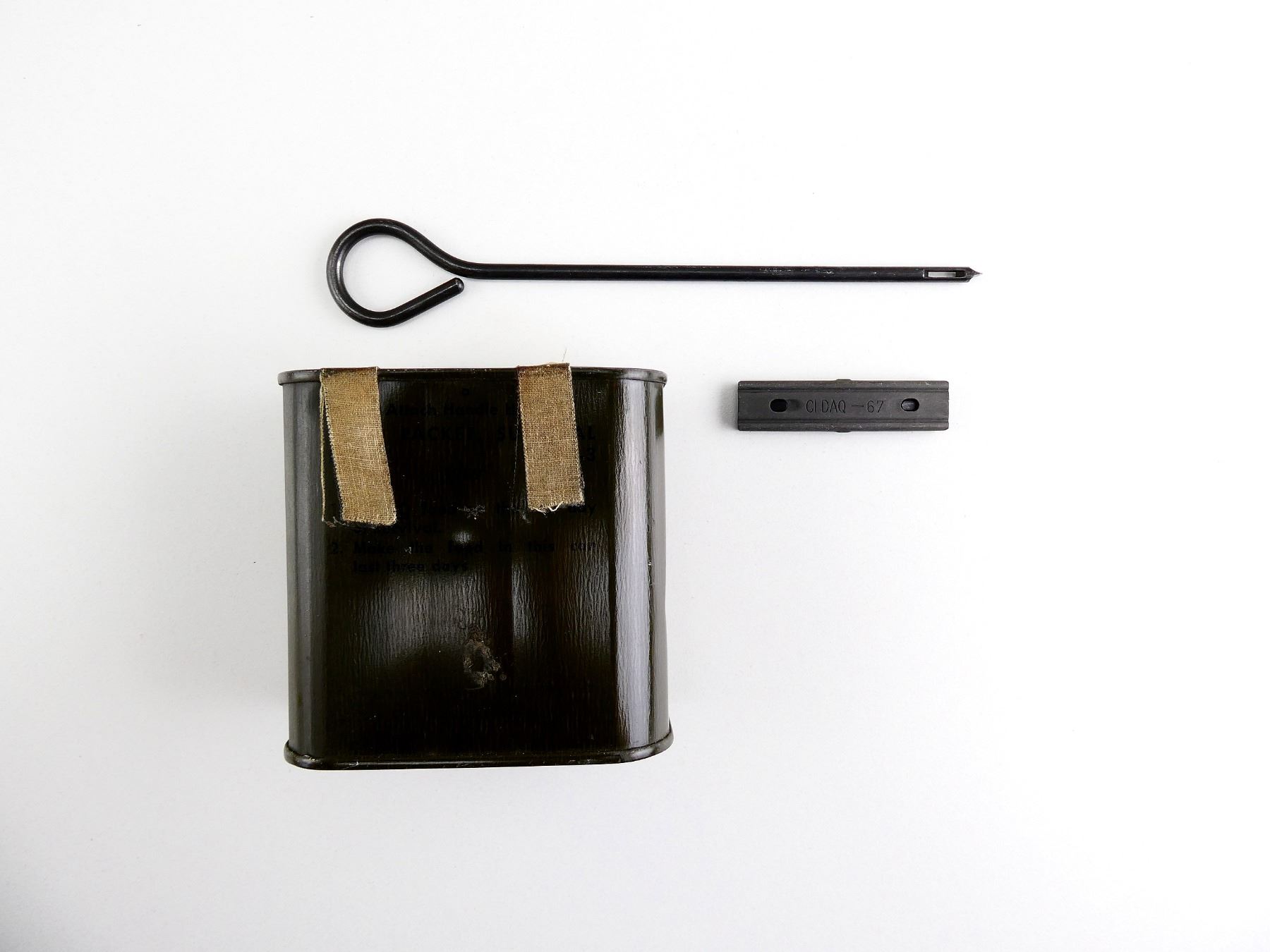 LOT INCLUDES; (1) CANADIAN MILITARY STEEL 7.62, 5-RND STRIPPER CLIP, FITS C1 / C2 7.62N RIFLES, VARIOUS MARKINGS, (1) RCAF SURVIVAL FOOD RATION, DATED: "1959", VARIOUS MARKINGS / INSTRUCTIONS ON CAN, WITH CAN OPENER & WIRE HANDLE, APPROX. 3.75" X 2" X 3 5/8" & (1) UNKNOWN CLEANING ROD, NO VISIBLE MARKINGS, EYELET ON END, OAL APPROX. 7.25". SEE PHOTOS.