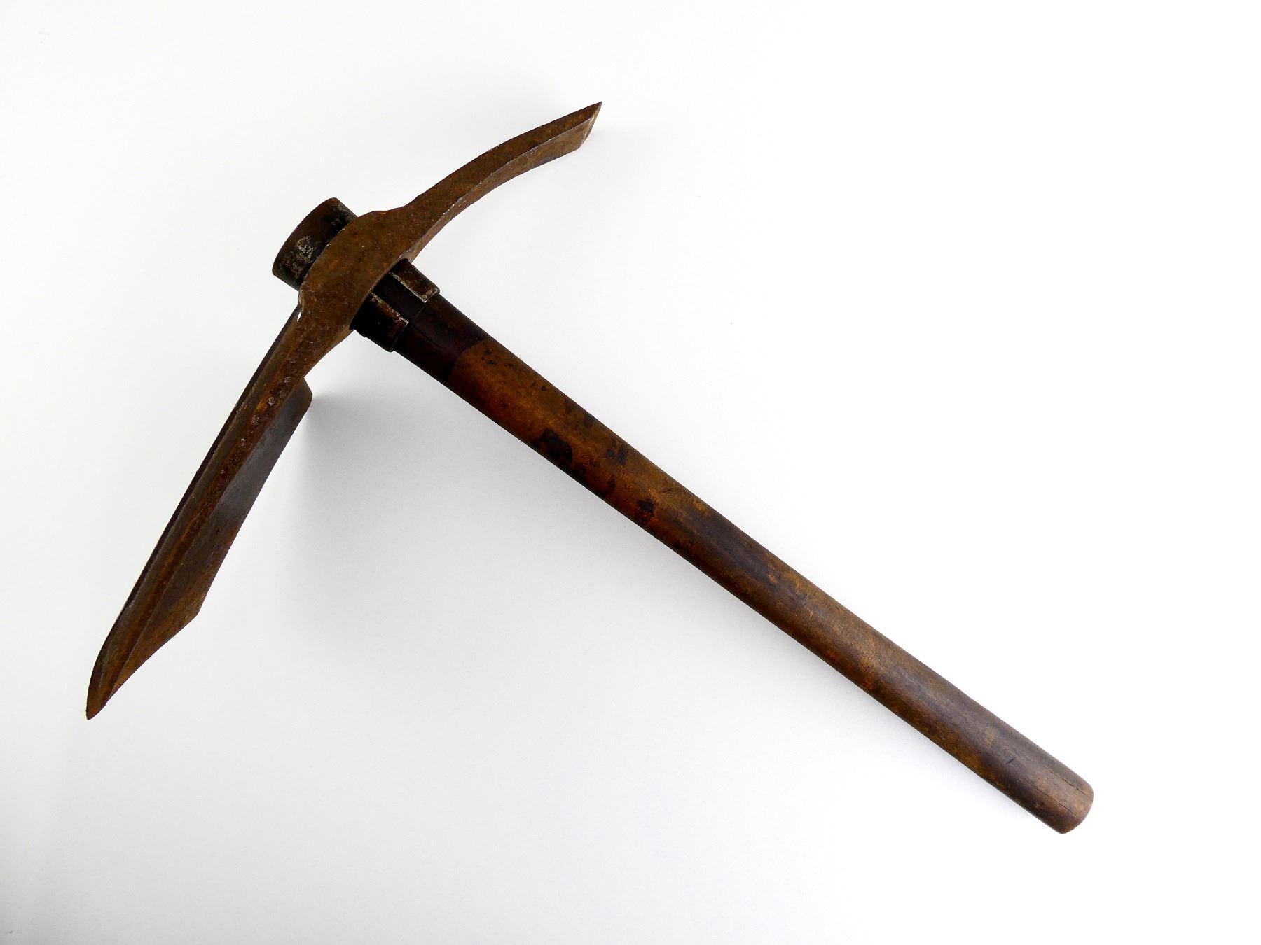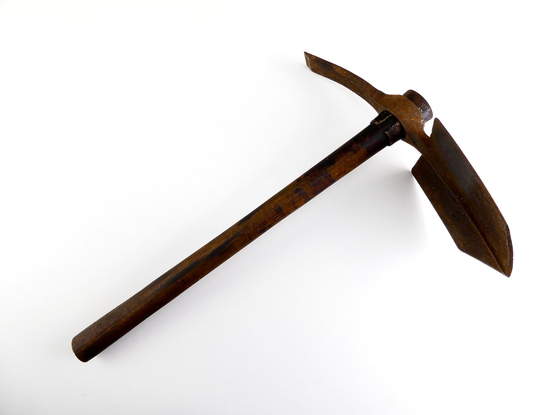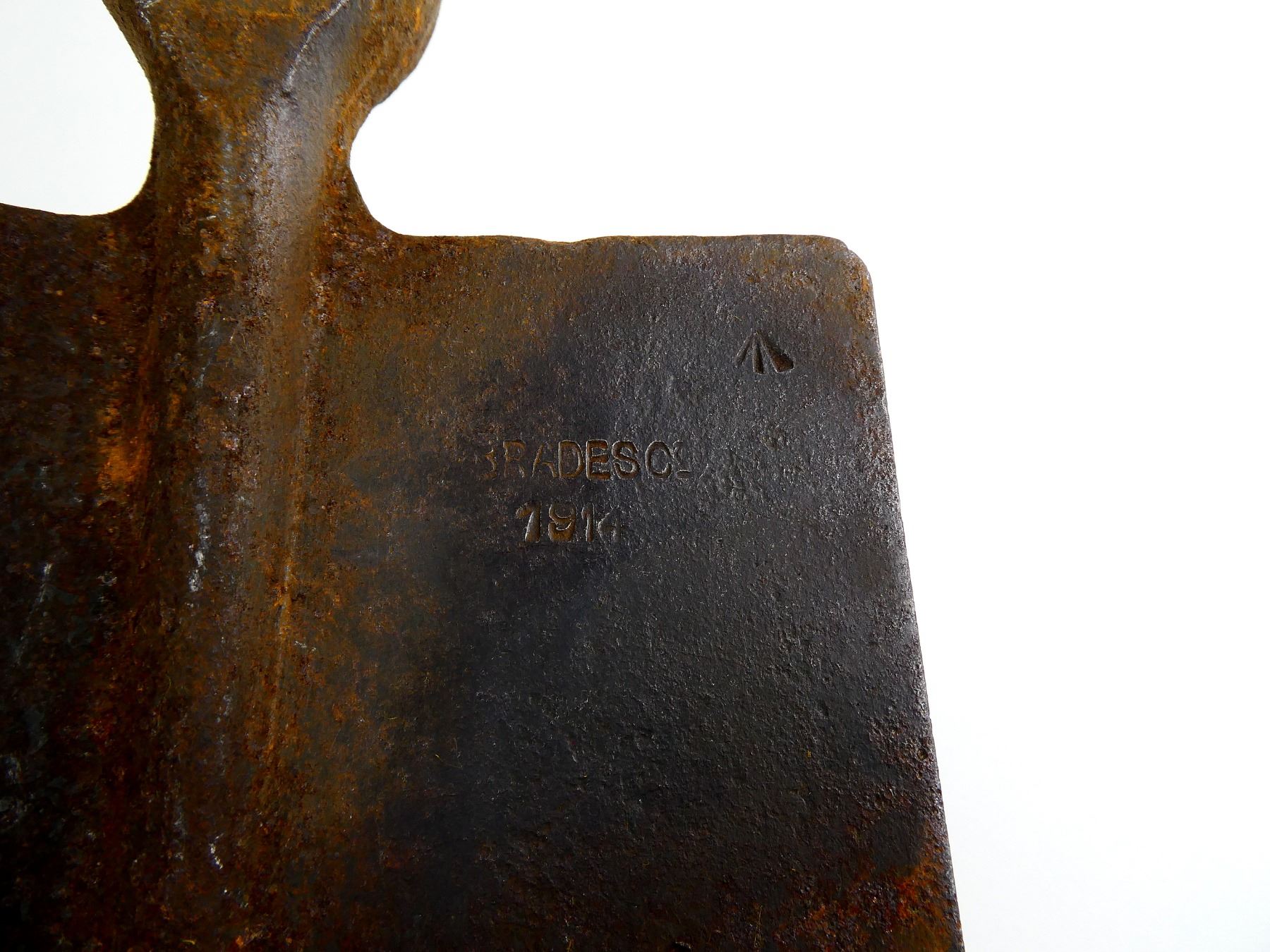 LOT INCLUDES; (1) STEEL TOOL HEAD, SPADE ON ONE SIDE / PICK ON THE OTHER, MARKED: "BRADES CO, 1914" & BROAD ARROW, APPROX. 5 1/8" W, OAL APPROX. 12 1/8" & (1) WOOD HELVE WITH STEEL, HANDLE MARKED WITH C-BROAD ARROW, OAL APPROX. 16 5/8". SEE PHOTOS.